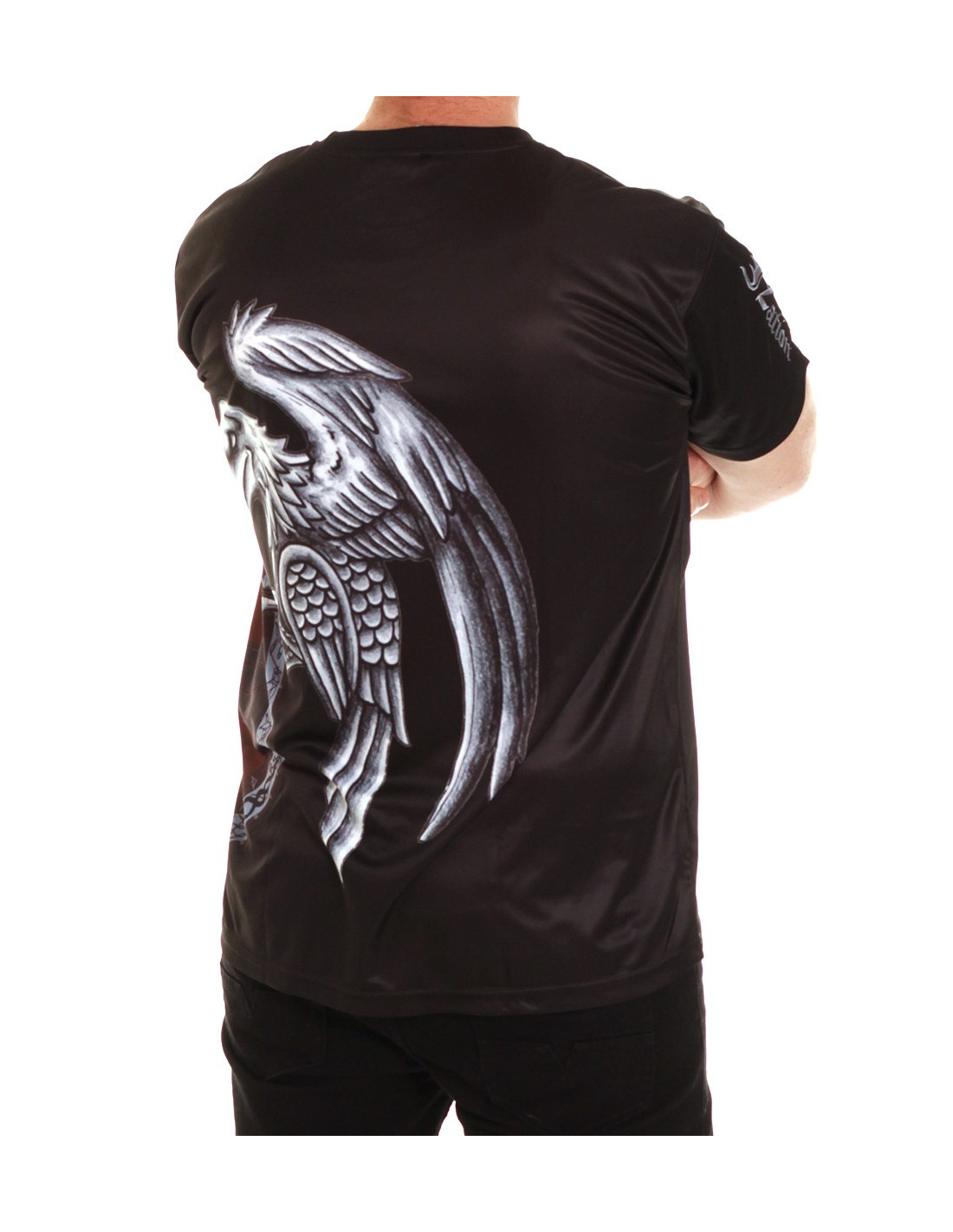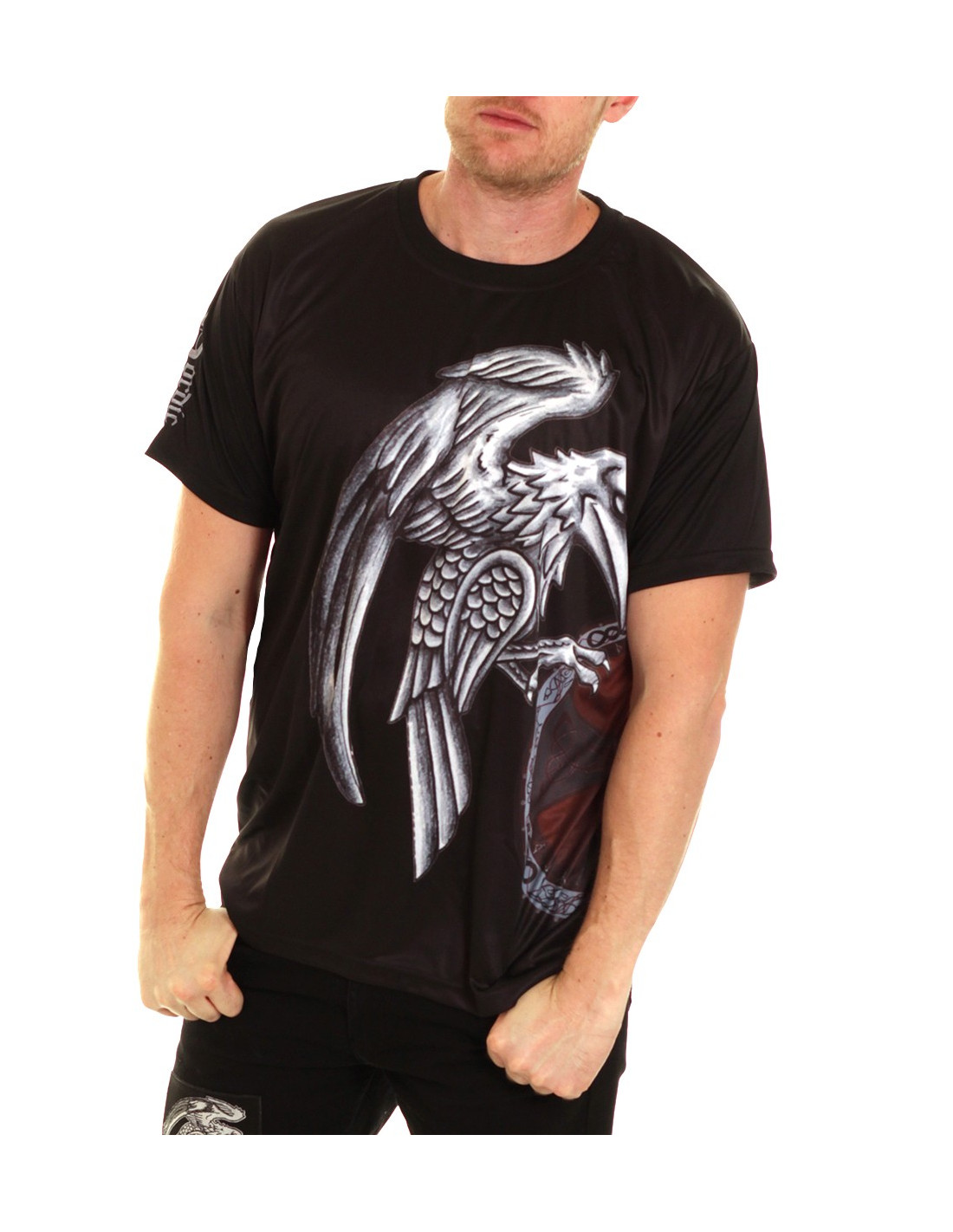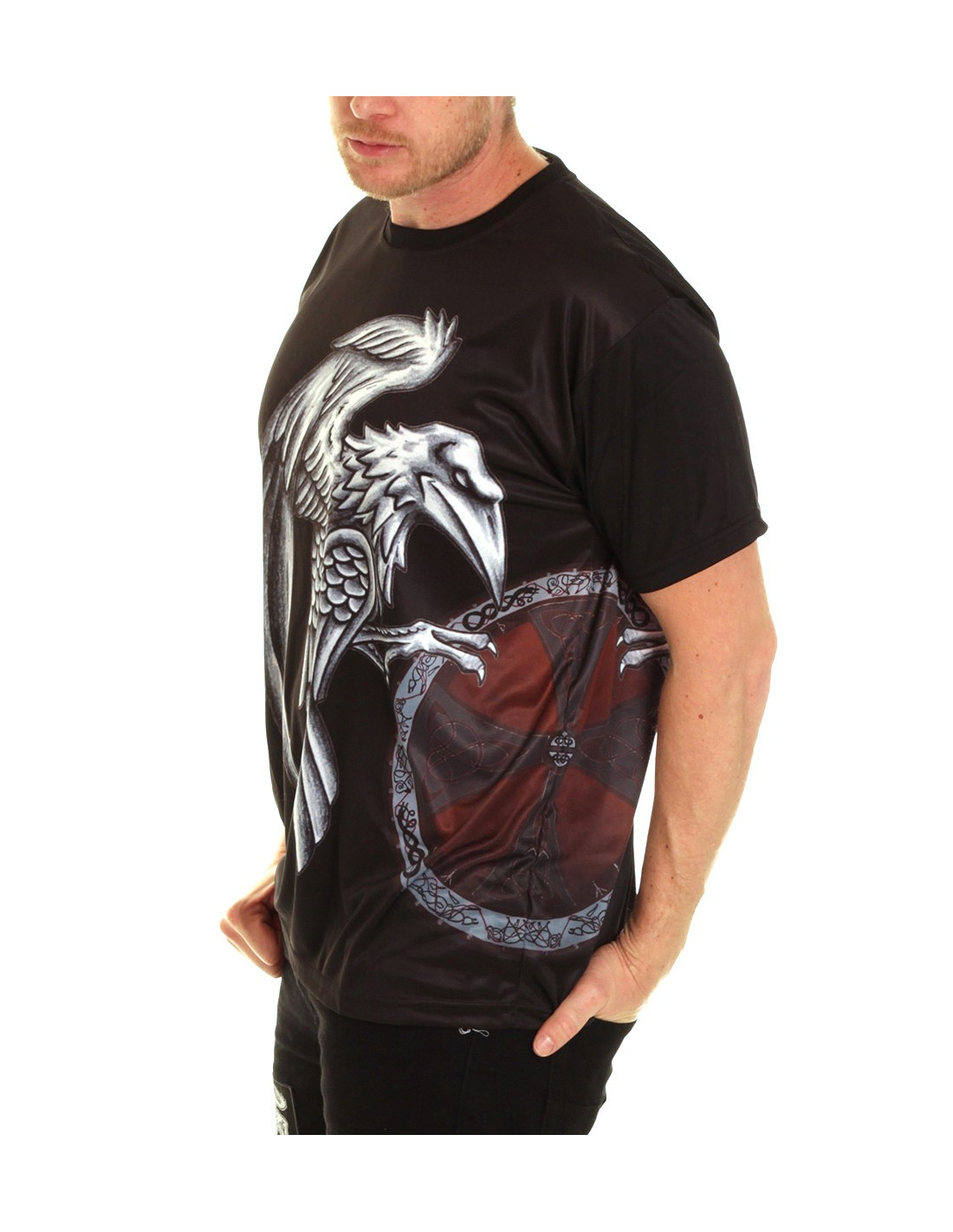 Et nyt kongedesign til alle Viking Warriors. Raven Shield designet spejler brandets DNA perfekt. I den nordiske mytologi har Odin 2 ravne, Hugin og Munin, som hver dag flyver ud i verden og holder ham informeret om, hvad der sker i såvel gudernes som menneskenes verden. Viden er som bekendt magt! Storladent og magtfulde sidder ravnene for og bagpå T-Shirten oven på brandets skjold. I sandhed et imponerende og magtfuldt design. Brand logoet er broderet på venstre ærme. Pasformen er custom fit. Nordic Worlds er maskulin, stærk og sporty og T-Shirten er fremstillet i et cool og ultralet polyester materiale, som minder meget om det, de fleste kender fra sportswear. Nordic Worlds er et tøjmærke, som rykker den maskuline urkraft fra vikingetiden ind i moderne trendy designs. Brandet anvender også keltiske symboler og elementer fra Nordisk Mytologi i deres designs.