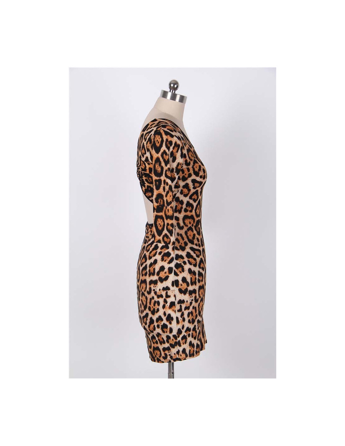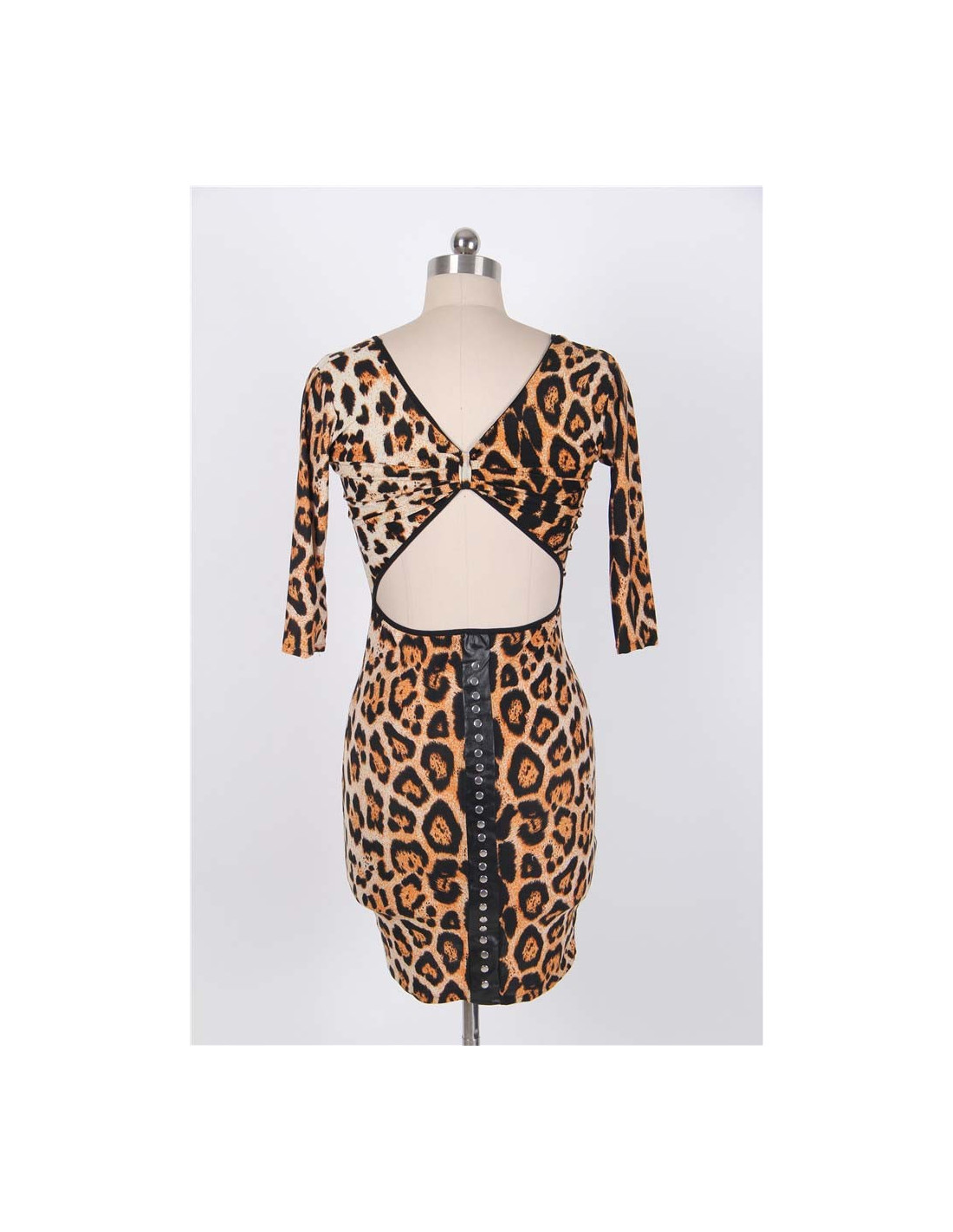 Flot leopardmønstret kjole med coole detaljer på kjolens bagside. Kjolen er let, i 95% polyester og 5% spandex, dvs. kjolen tilpasser sig kroppen.