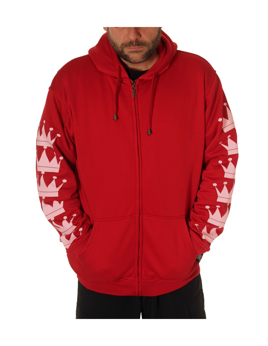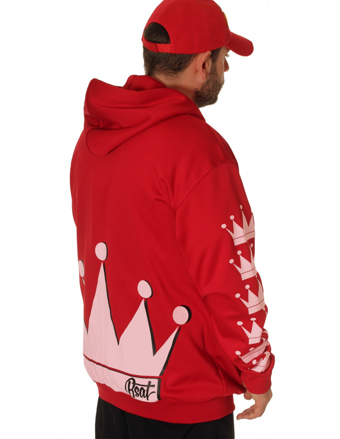 Den dybrøde Hoodie med hvide kroner ned langs ærmerne og en stor hvid krone bagpå er super fed. Kronernernes hvide farve har et let rosa skær, som gør Hoodien speciel. Den får xtra kant, men en blød og varm kant. Crown Hoodien er fra BSAT's Bronx Kollektion.