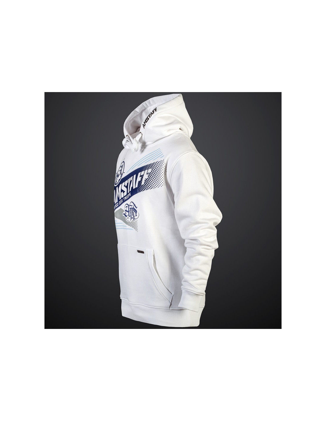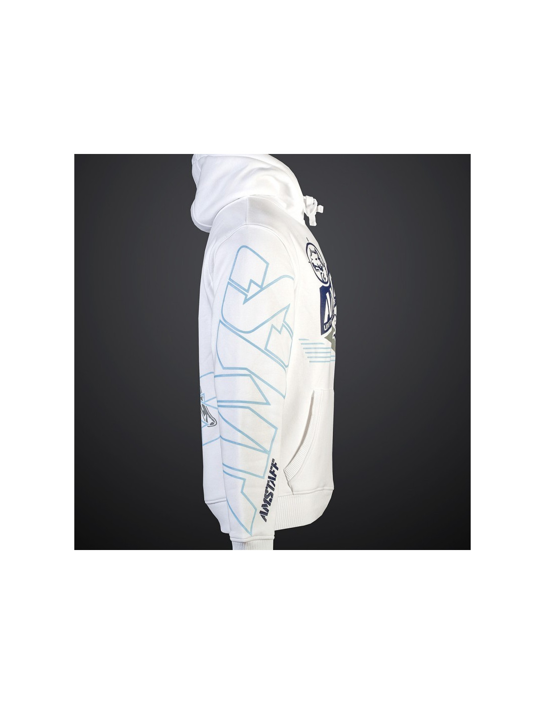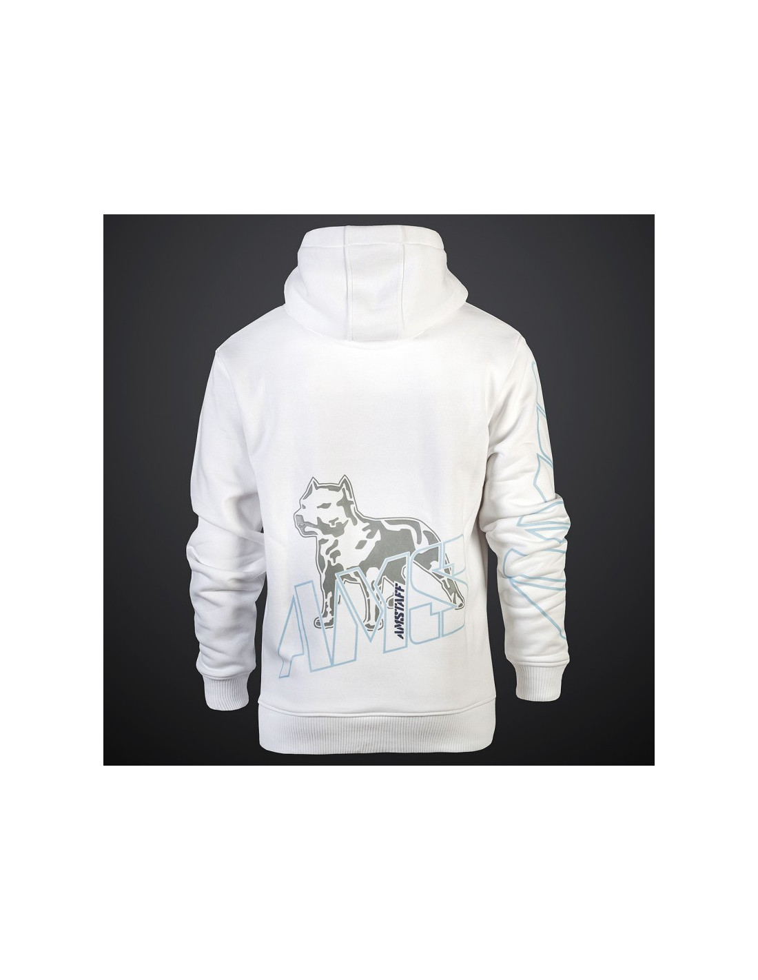 Stærk hvid Hoodie med Amstaff print på for- og bagside og brandlogo på ærmerne. Hoodien har klassiske kængurulommer.