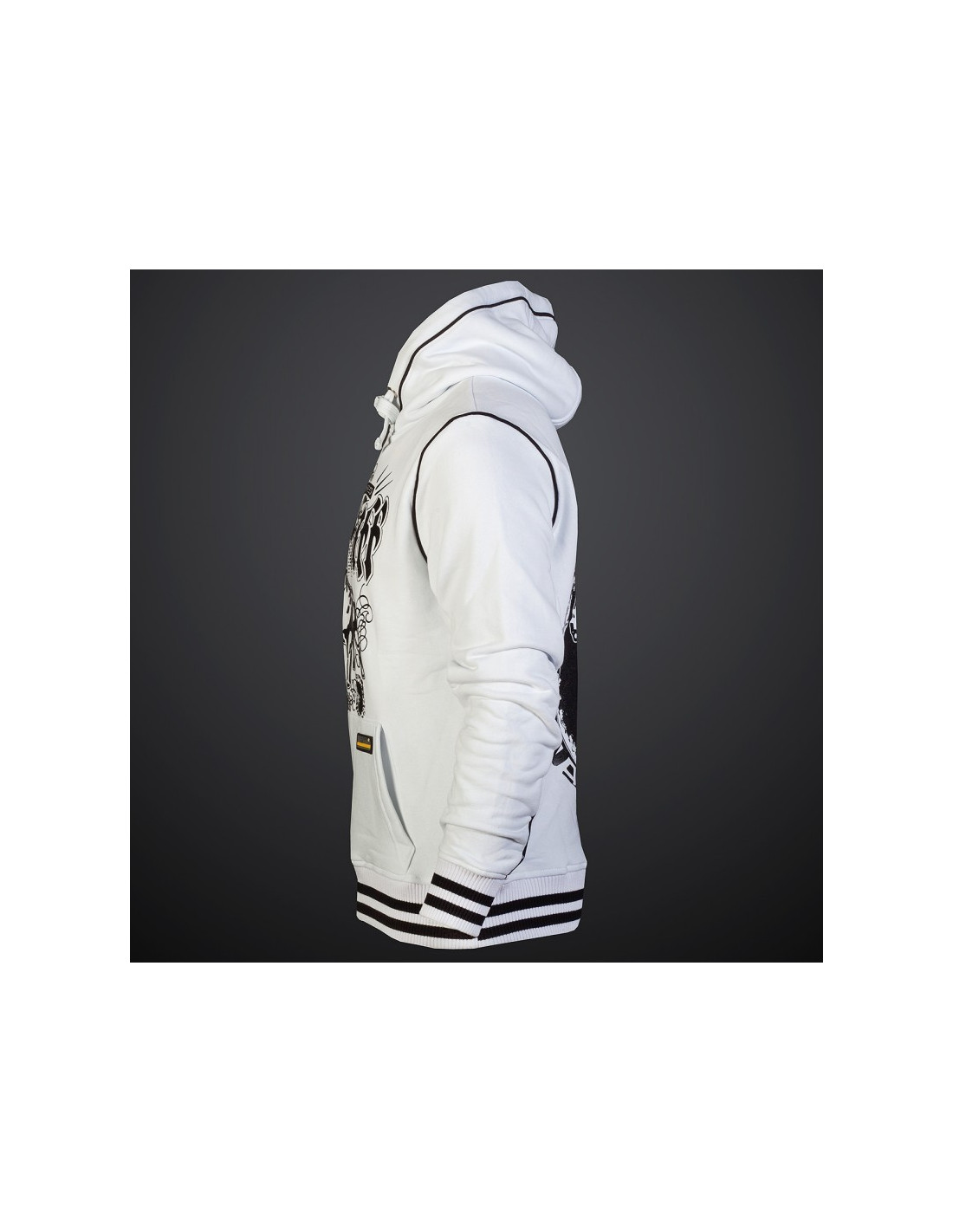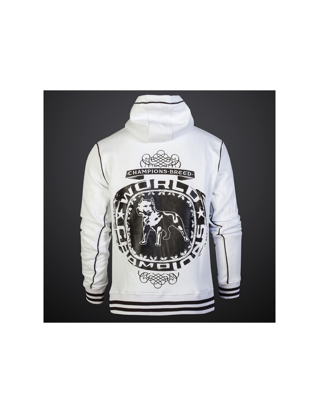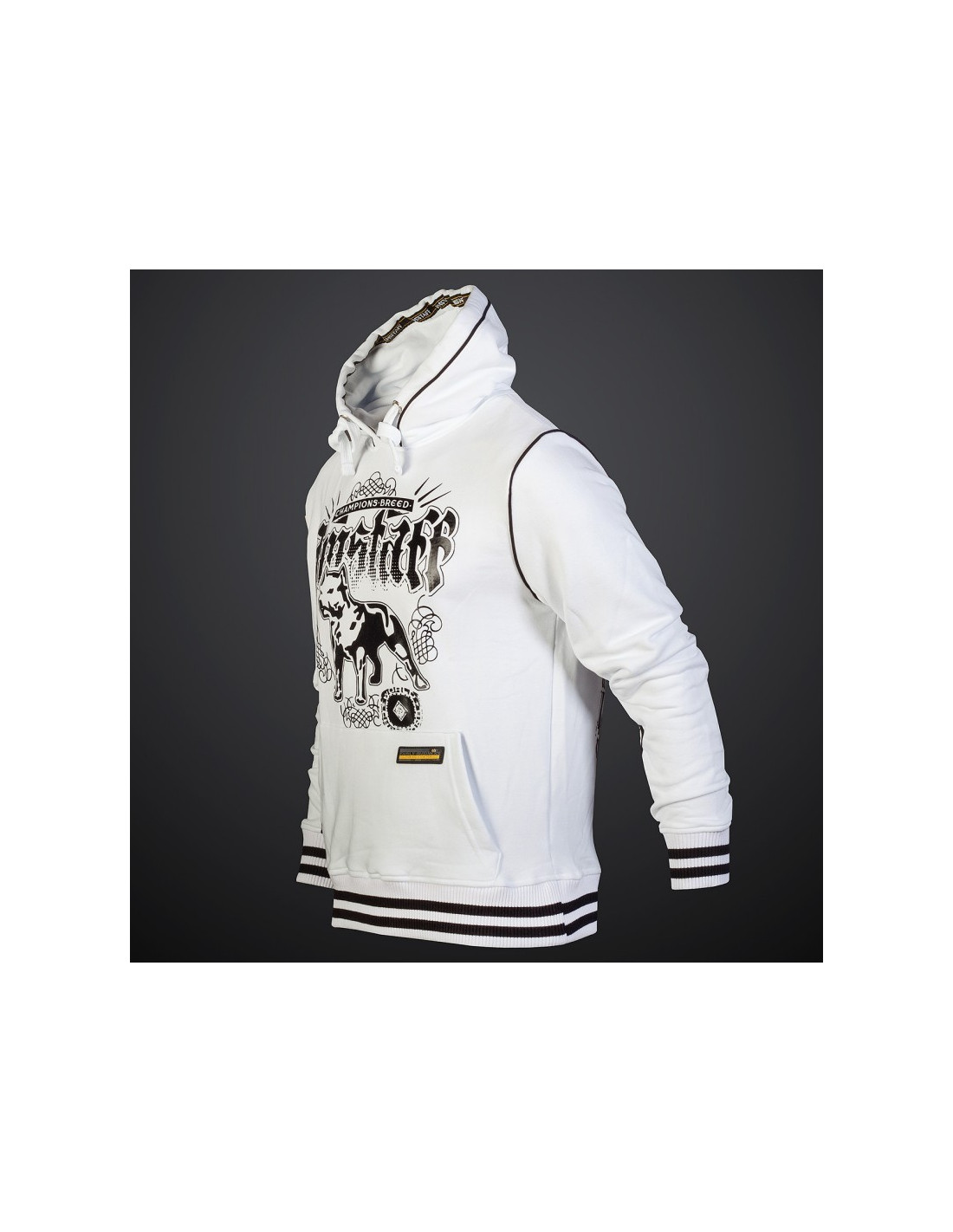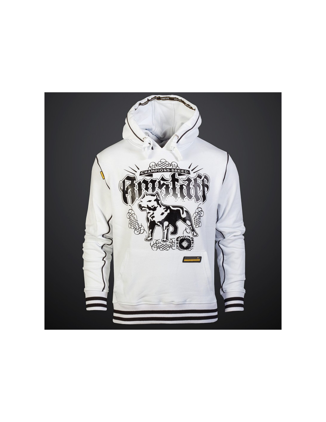 Den hvide Nepos Hoodie med sort brandlogo print kårer Amstaffen som verdensmester. Vi er i dogzdepartementes kampsports arena. Hoodien har da også et yderst sporty look, hvilket forstærkes yderligere af de sort/hvide ribkante.Det må være den perfekte hoodie til alle, der er nede med Amstaff hunden.