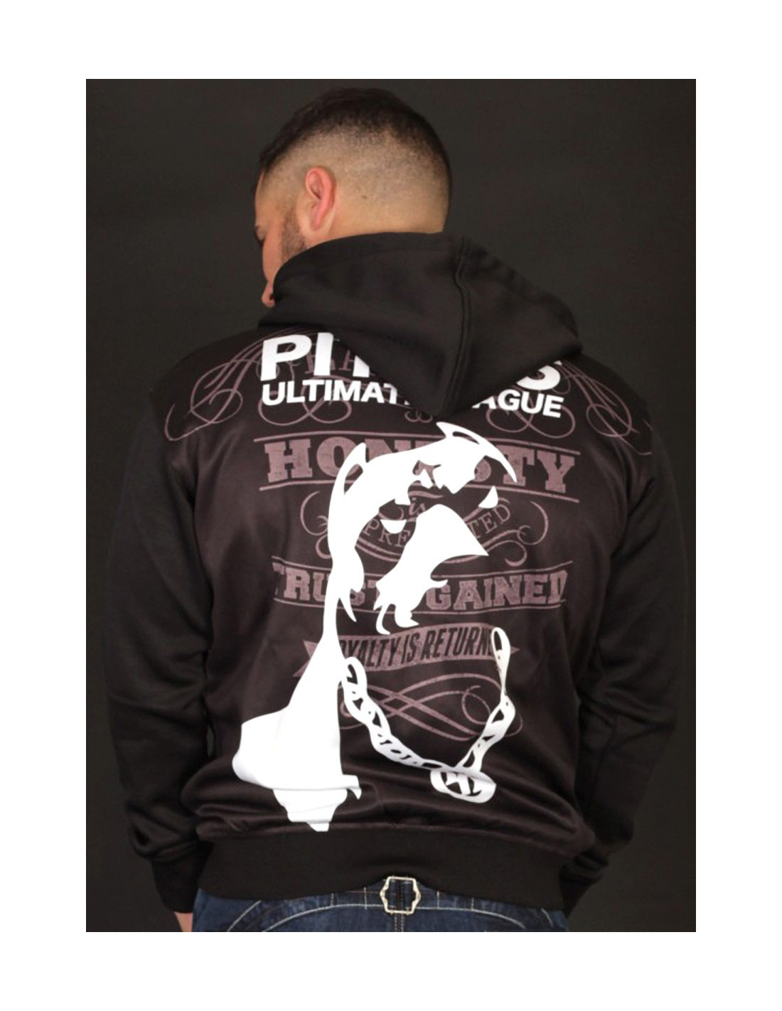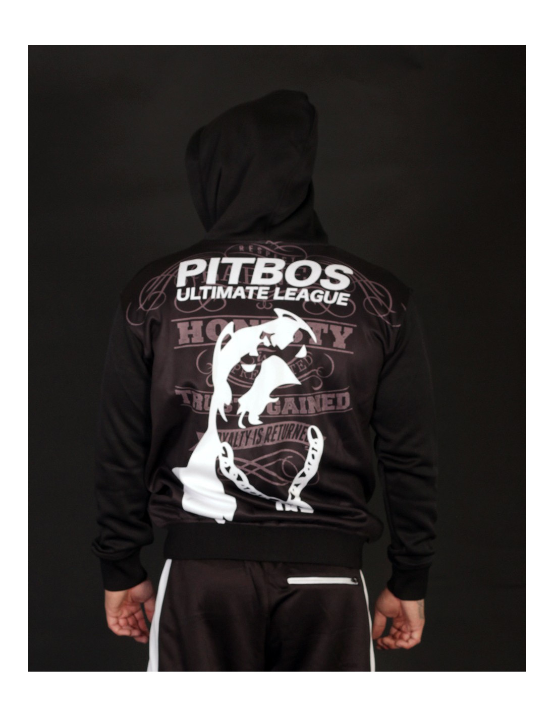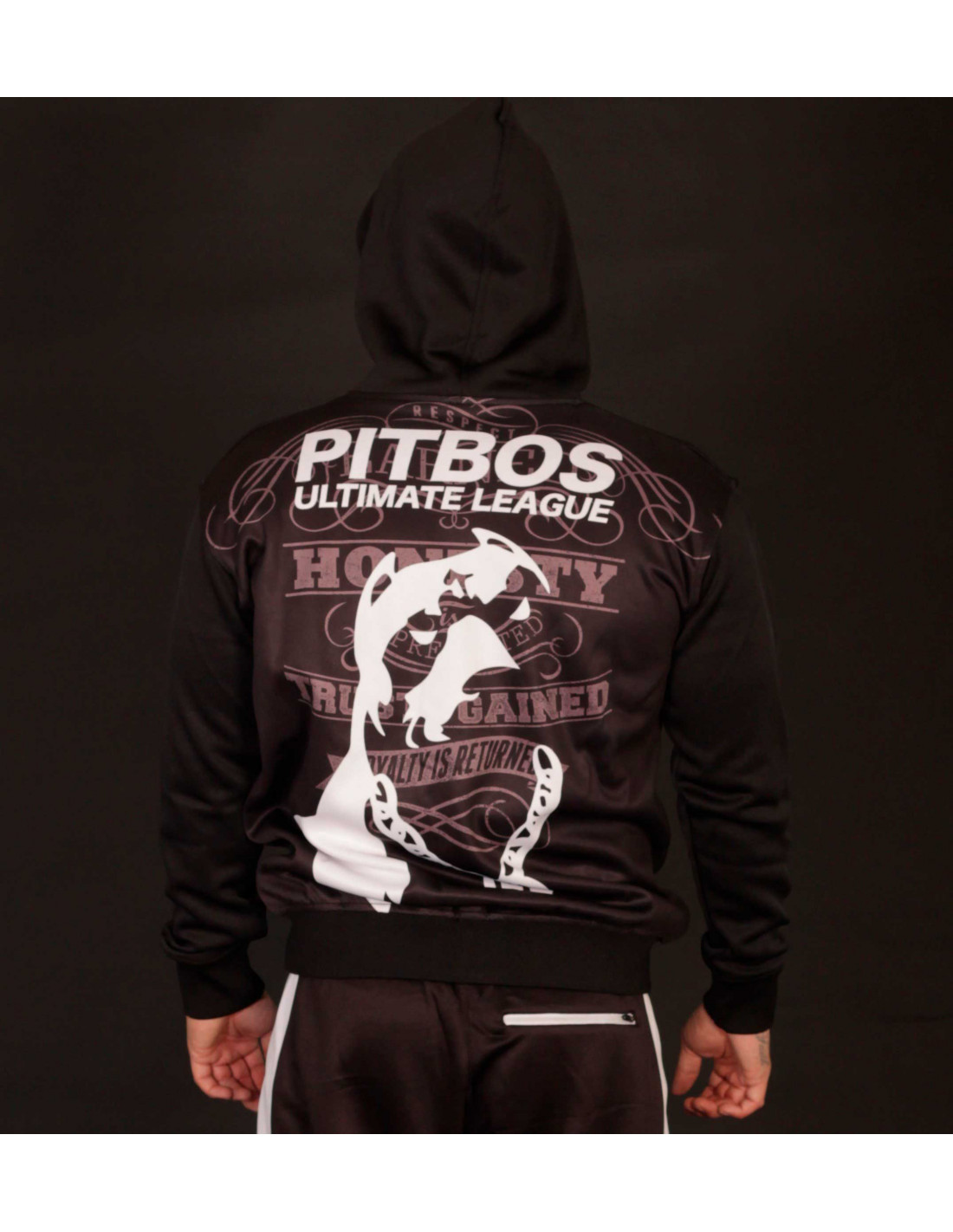 #WhoLetTheDogsOut?! Pitbos5.515 er navnet. Så kom de vilde Ultimate League Hoodies.Den her er sort med grå tekst og hvid brandlogo hund. Den coole hund indtager hele ryggen. Vi er vilde med den og hundens robuste PB kædehalskæde :) og at den ruler oven på et stærkt statement, skrevet med grå håndkoloreret skrift: Udsagnet lyder: Respect is earned, Honesty is appreciated, Trust is gained, Loyalty is returned. Foran er placeret et mindre larmende brandlogo print. Hoodien er med lynlås, forsynet med to praktiske kængurulommer og er lavet i et blødt, behageligt polyester materiale. Ultimate League Hoodien findes også i sort med en gul og rød hund.