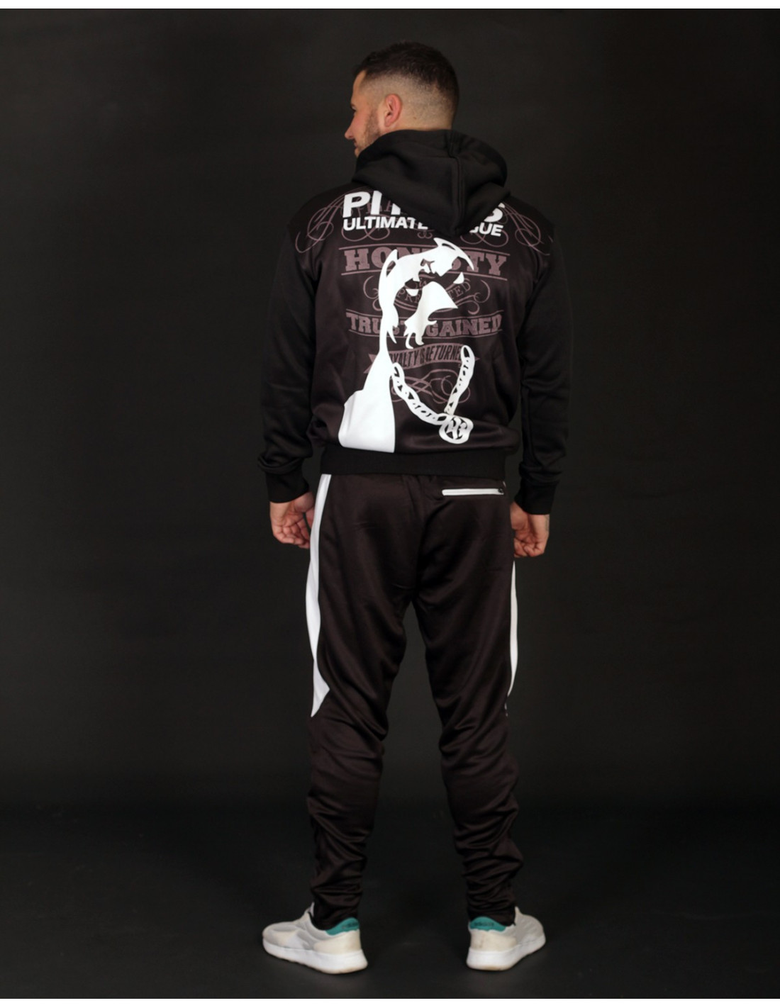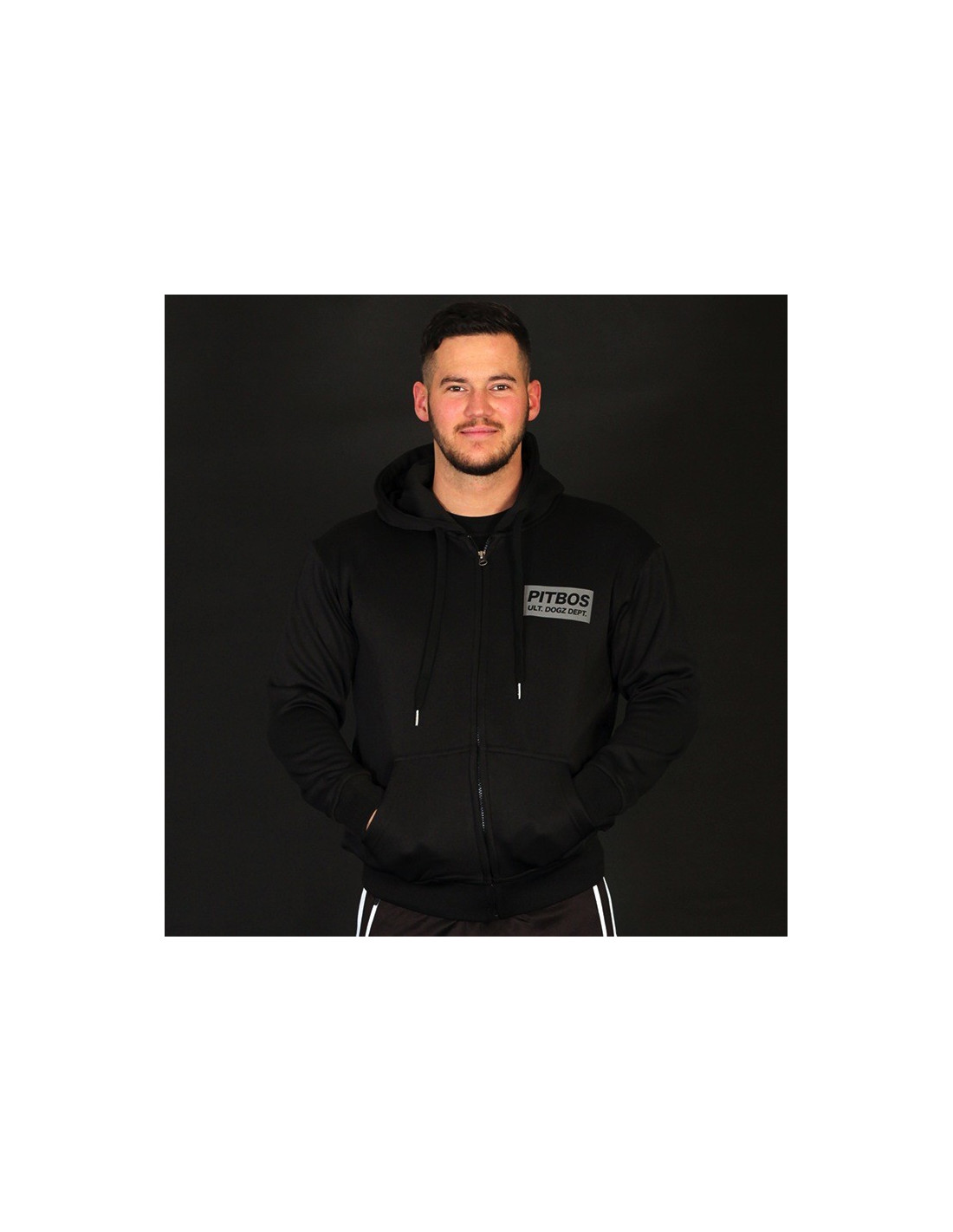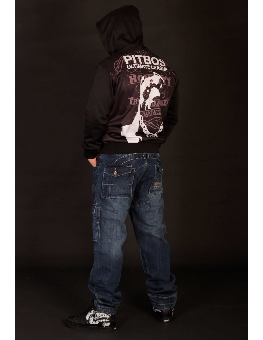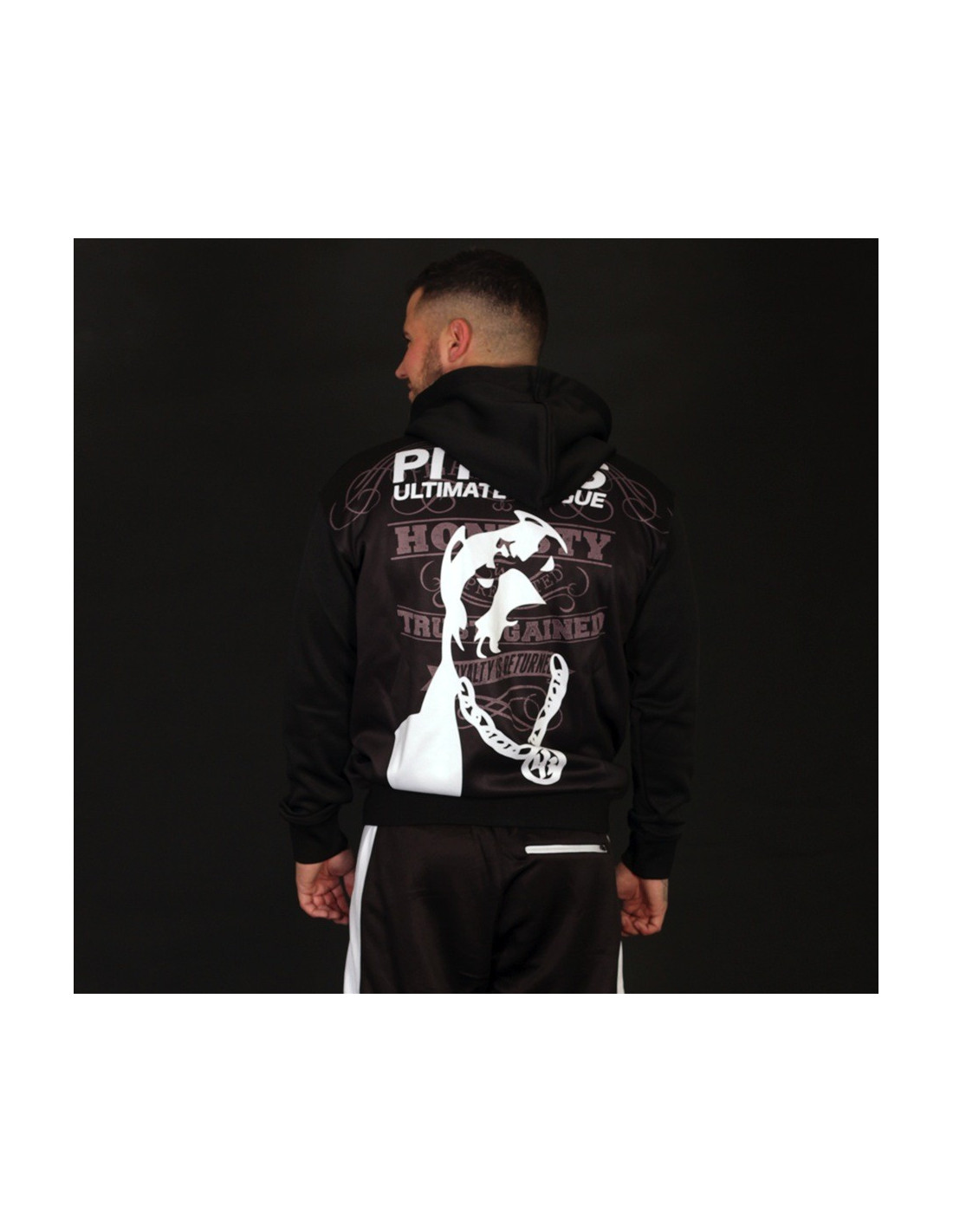 #WhoLetTheDogsOut?! Pitbos5.515 er navnet. Så kom de vilde Ultimate League Hoodies.Den her er sort med grå tekst og hvid brandlogo hund. Den coole hund indtager hele ryggen. Vi er vilde med den og hundens robuste PB kædehalskæde :) og at den ruler oven på et stærkt statement, skrevet med grå håndkoloreret skrift: Udsagnet lyder: Respect is earned, Honesty is appreciated, Trust is gained, Loyalty is returned. Foran er placeret et mindre larmende brandlogo print. Hoodien er med lynlås, forsynet med to praktiske kængurulommer og er lavet i et blødt, behageligt polyester materiale. Ultimate League Hoodien findes også i sort med en gul og rød hund.