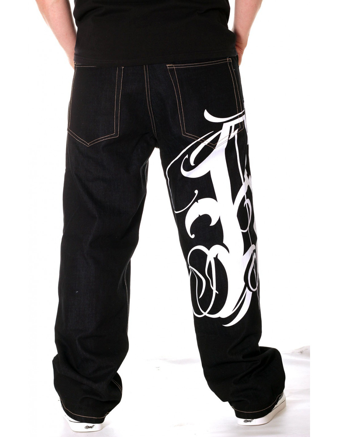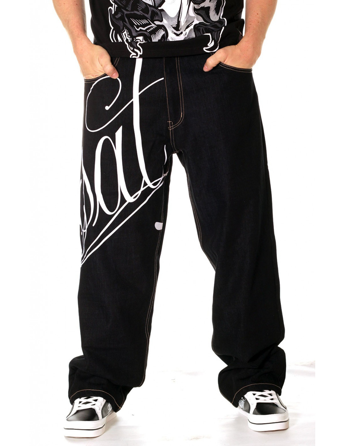 BSAT. Brand navnet designet med kæmpe hvid hip hoppet skrift for og bag på højre side af de sorte baggy jeans. Jeansene er fra BSAT's La Onda Kollektion. BSAT er et spritnyt tøjbrand med rødder i HipHop Kulturen. Chicano Art Kulturen, Gangster Rap, Bronx Hip Hoppen er i brandets DNA. Det er BSAT - Bloood -Sweat and Tears.