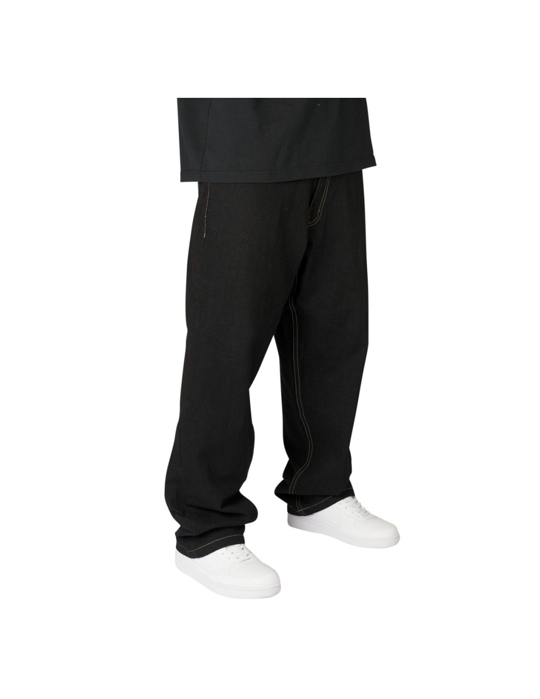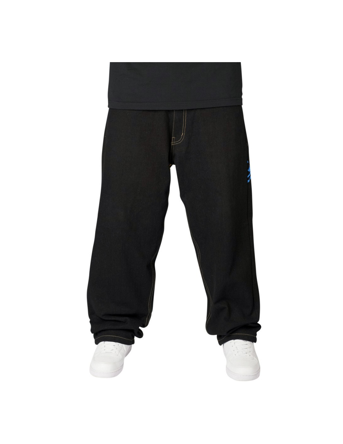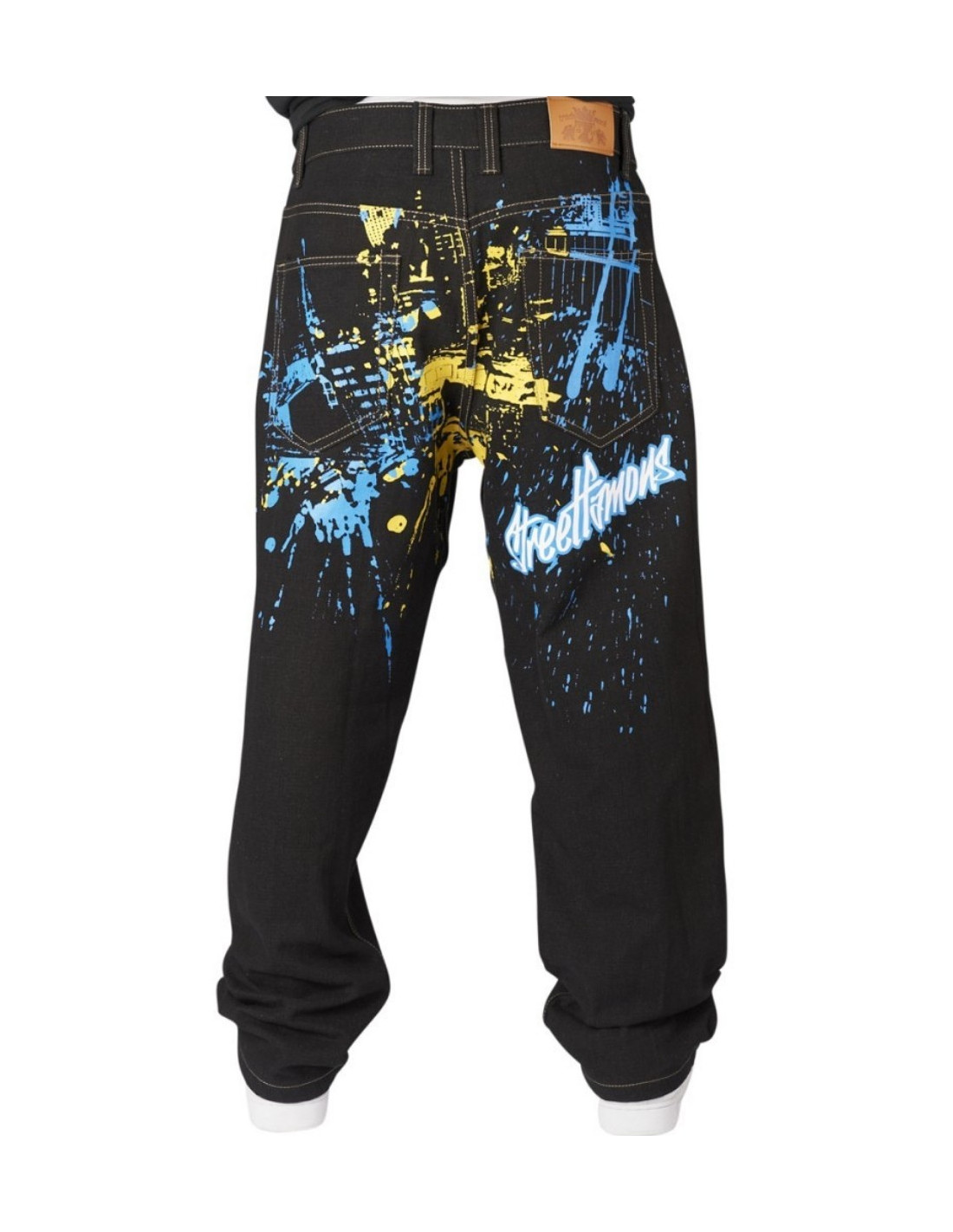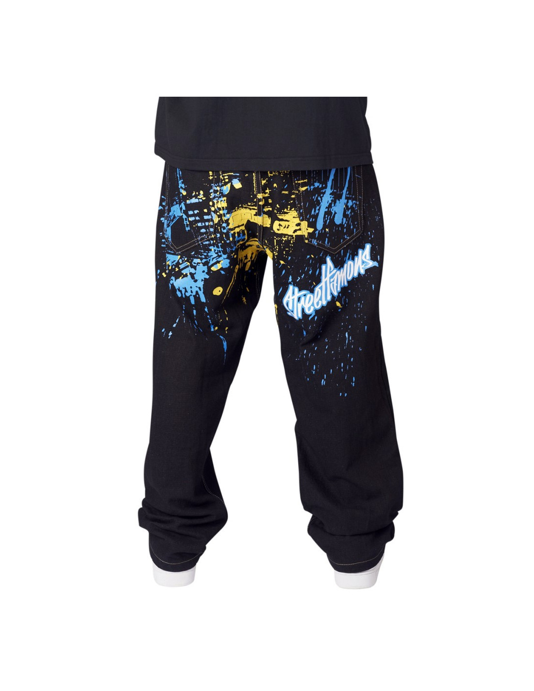 Cool black streetwear pants, model in dark denim with a print of city life and a text saying "Streetfamous" in the back. 100% cotton (denim fabric) Wash cold, no tumble drying.
