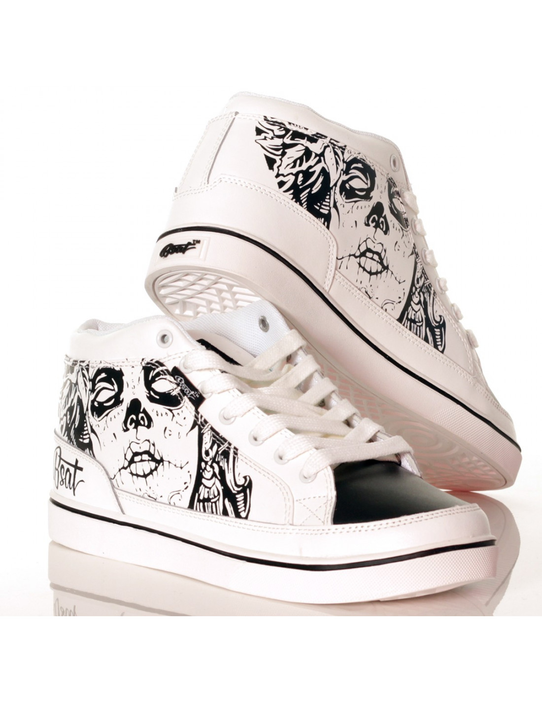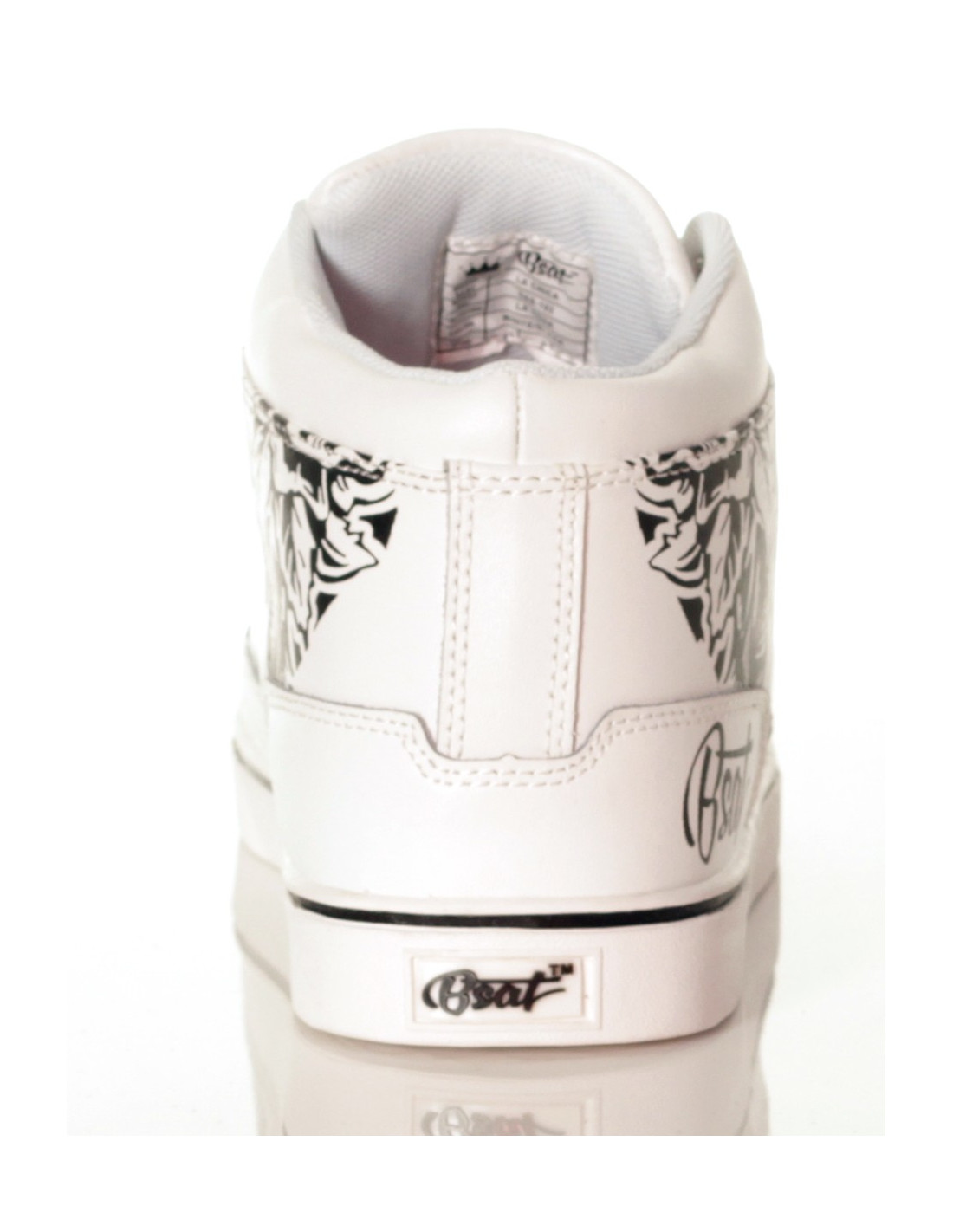 Hvide HiTop Sneakers med sort Chica print på hvid baggrund. Superseje sko fra BSAT's La Onda Kollektion. Gummiskoene er i god kvalitet og forstærket med ægte læder.