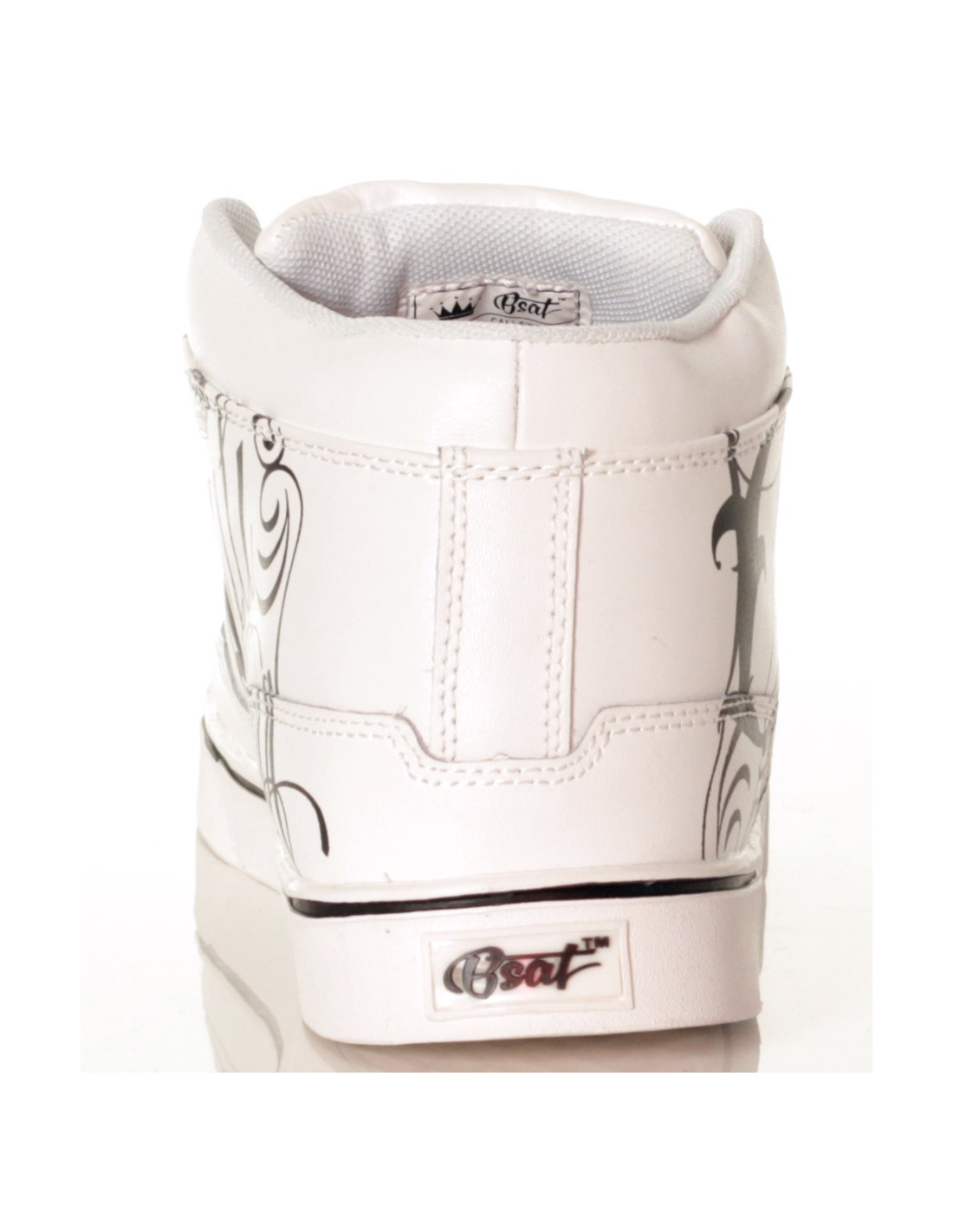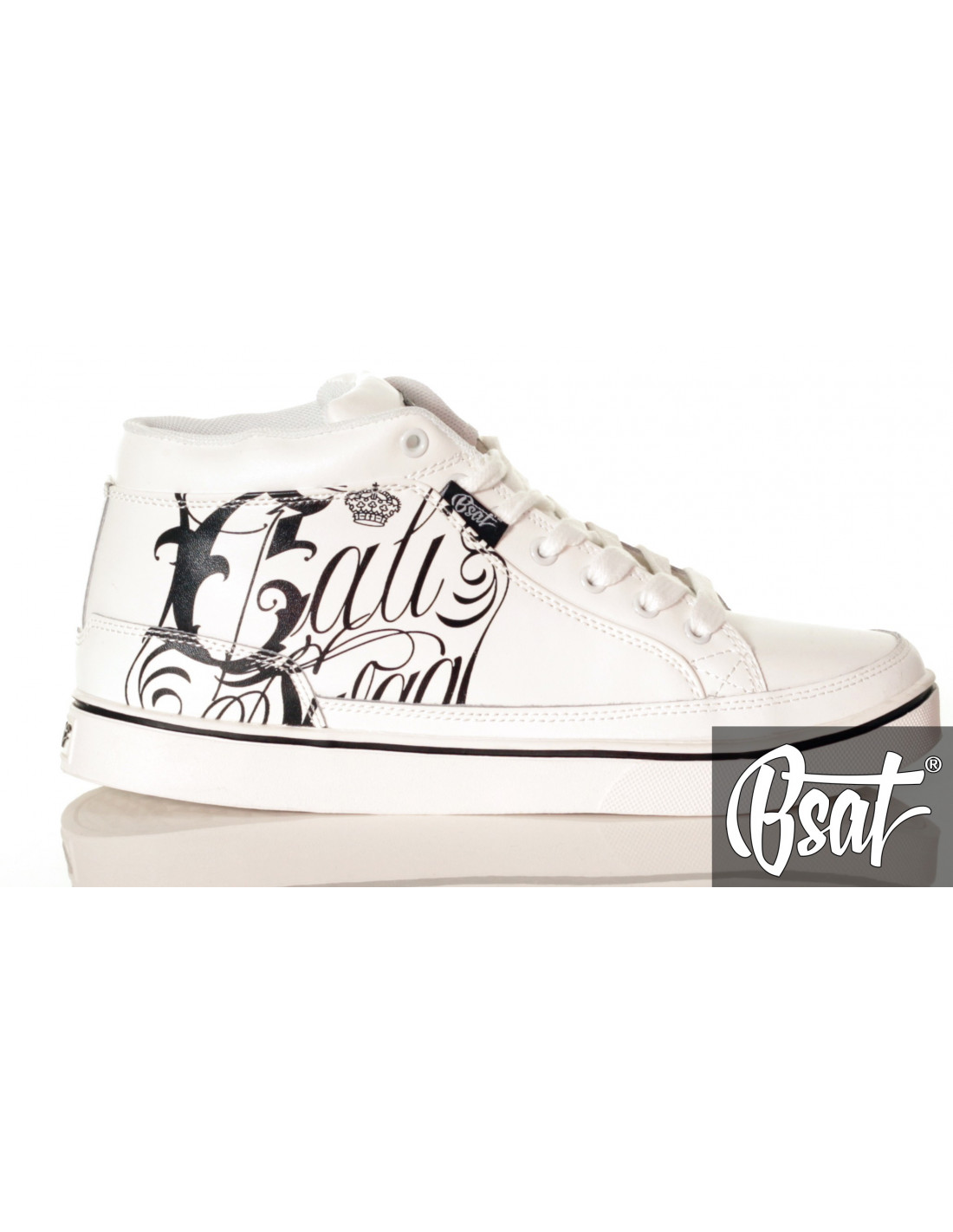 Hvide HiTop Sneakers med sort Cali swag print på hvid baggrund. Superseje sko fra BSAT's La Onda Kollektion. Gummiskoene er i god kvalitet og forstærket med ægte læder.