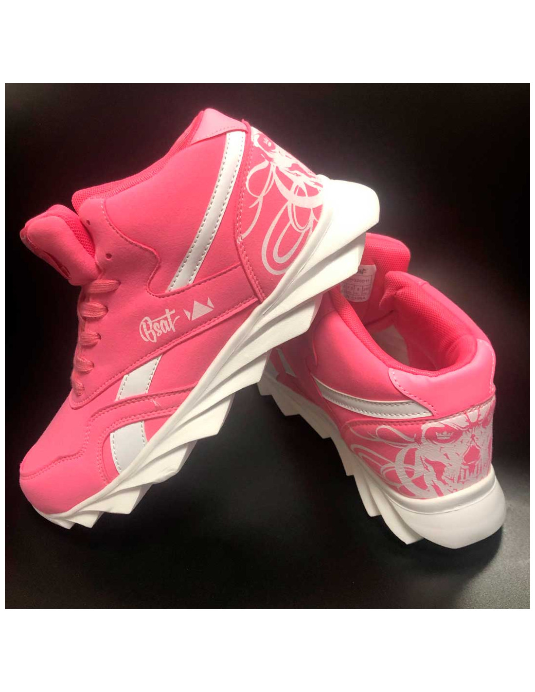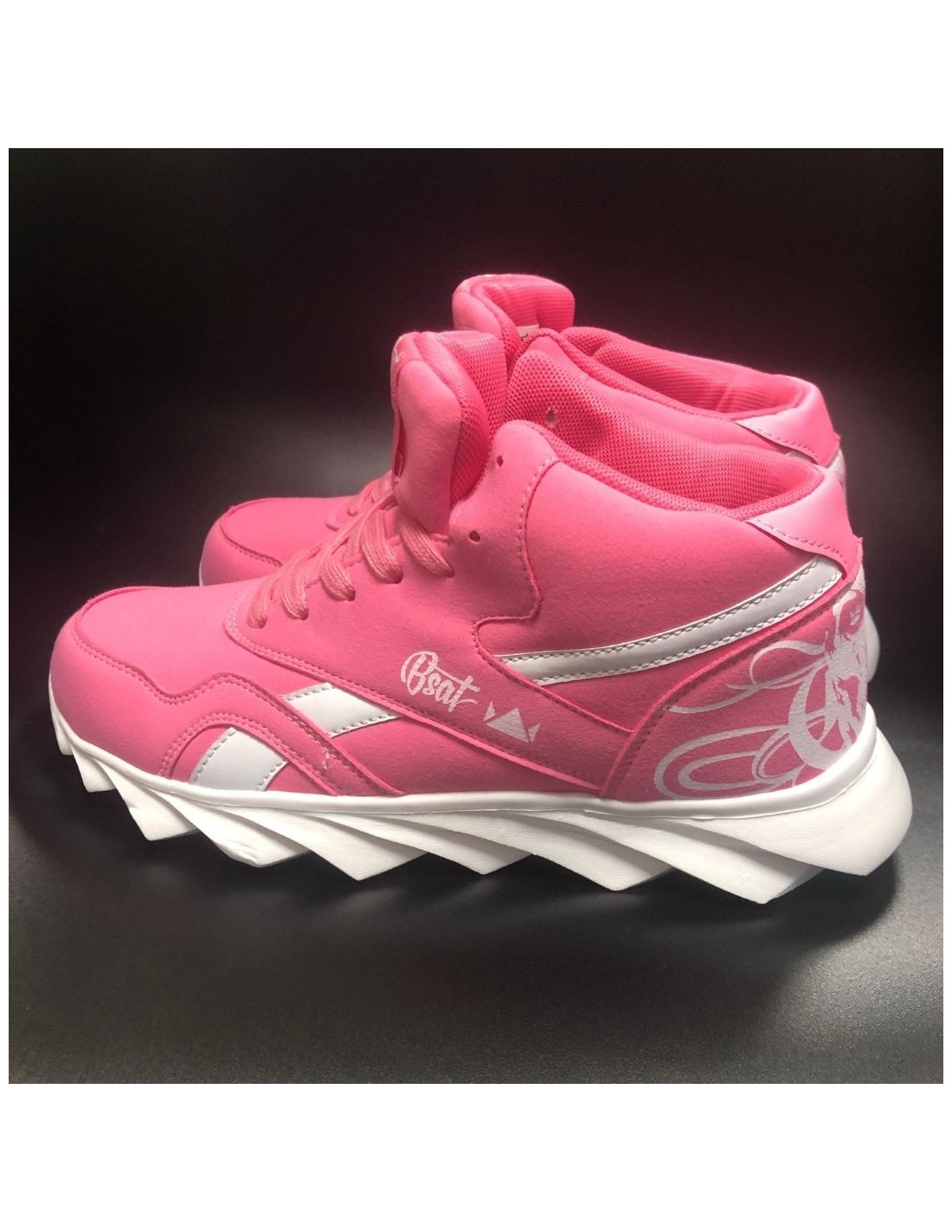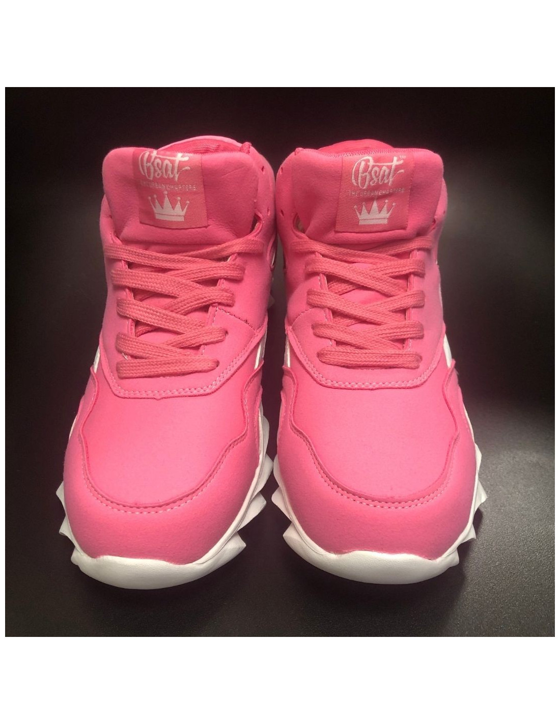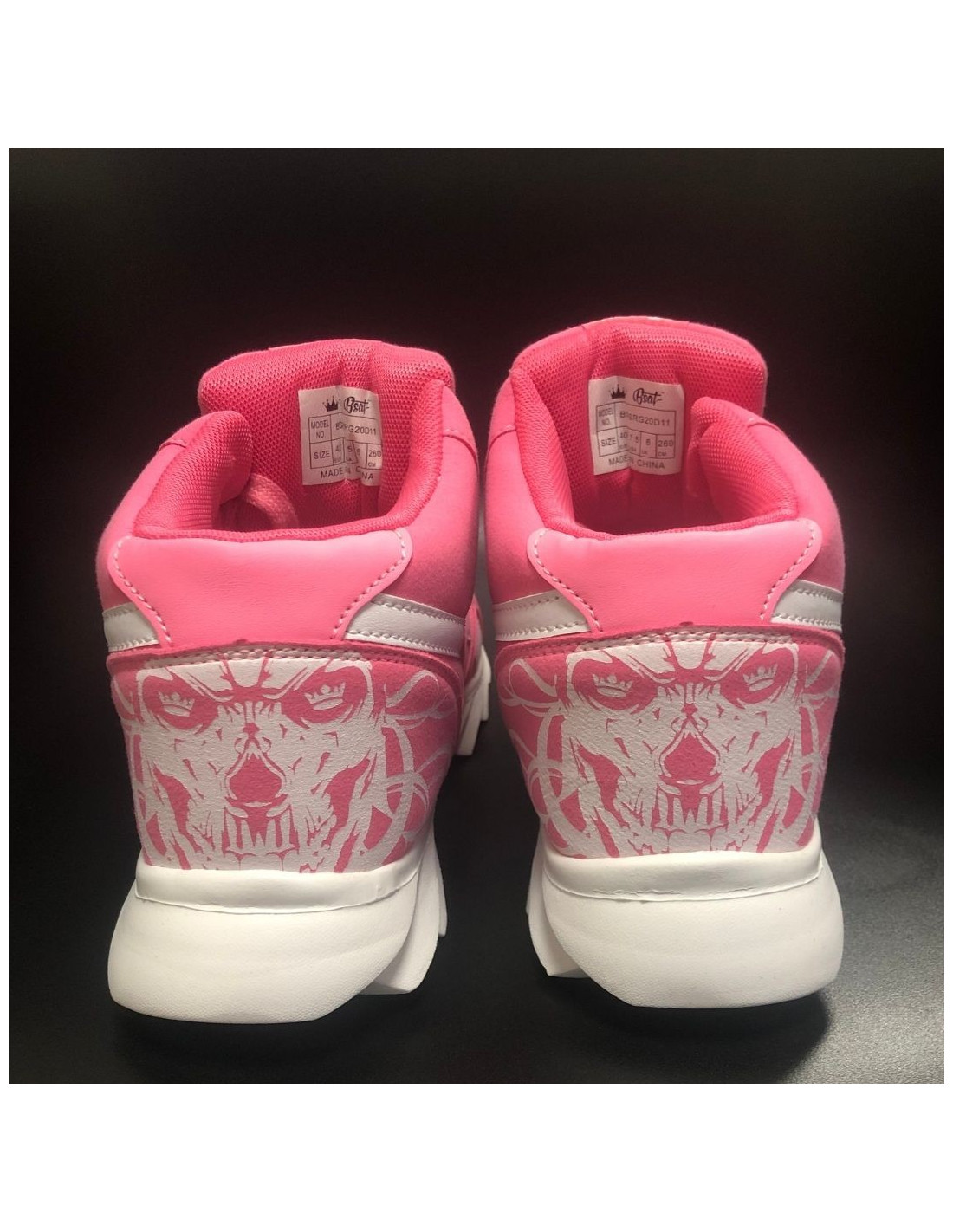 Skull Race Sneakers. Fuld fart frem i et par top sporty street sneakers fra vores Urban Art & HipHop brandet BSAT. Skoene er pink med hvide fartstriber på siderne. Selv den hvide sål har et mønster, som signalerer fart og bevægelse. Bag på skoen har det vilde hvide brandlogo Skull en fest. Skoene er produceret i letvægts kunstlæder (PU).