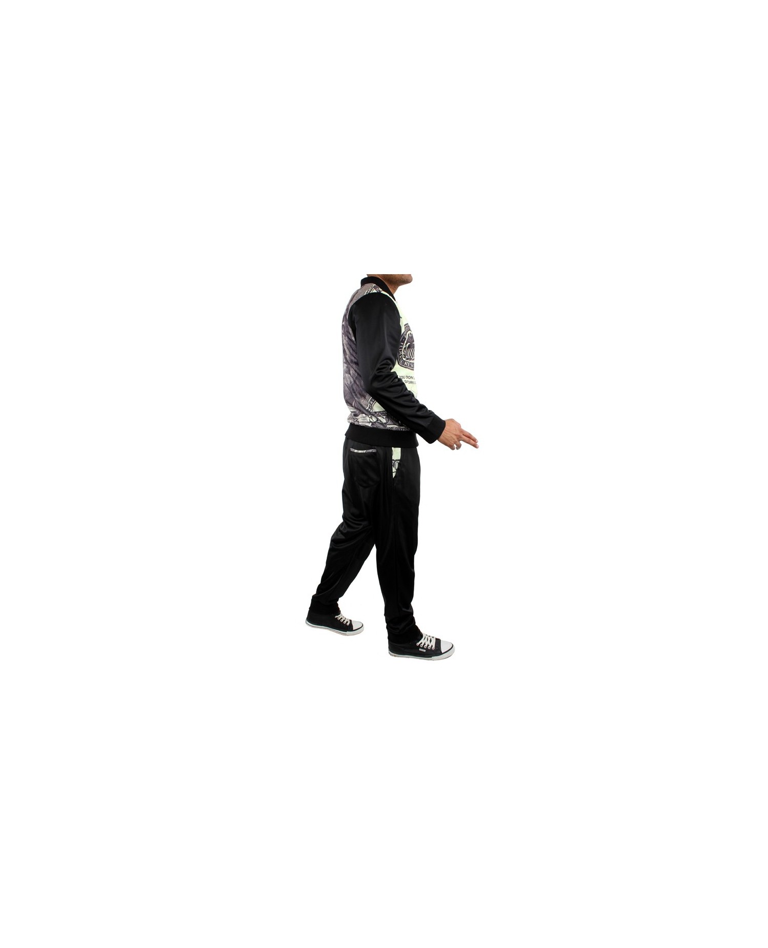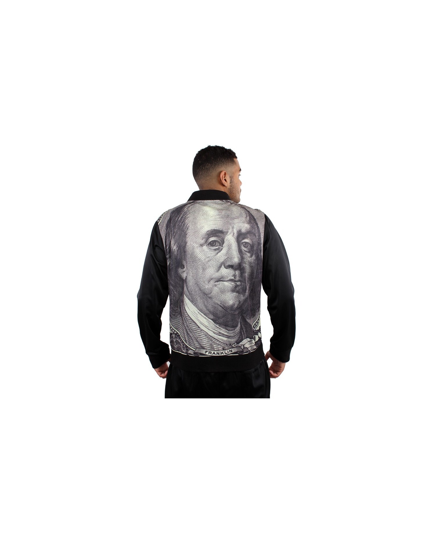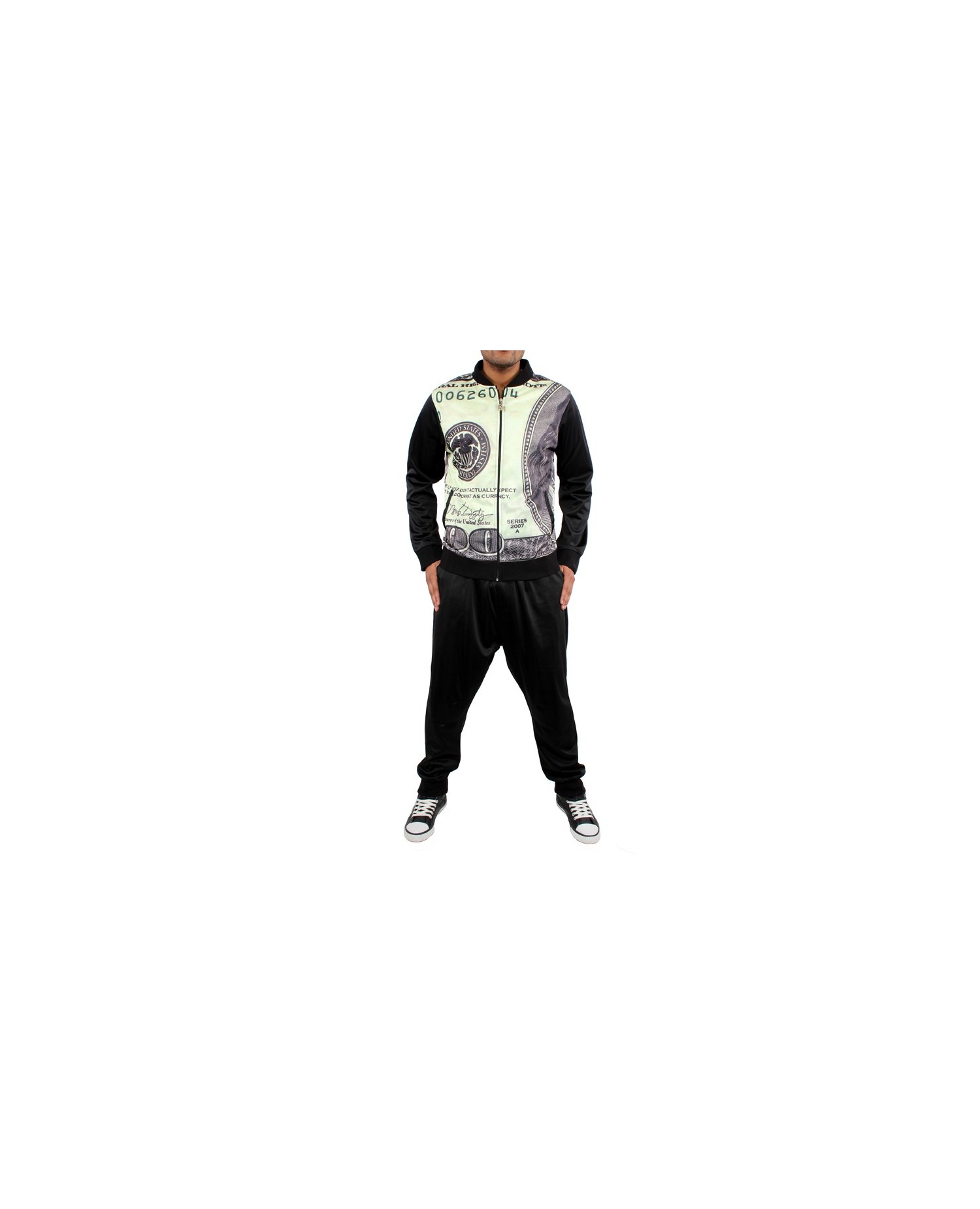 Speciel Dollar Drop Crotch Tracksuit fra Dirty Money. Sorte drop crotch bukser og 3D print med amerikansk 100 dollar Bill Franklin seddel hele vejen rundt på Track Toppen. 100% Polyester. Vaskes ved 30 grader på vrangen. Ingen tørretumbler.