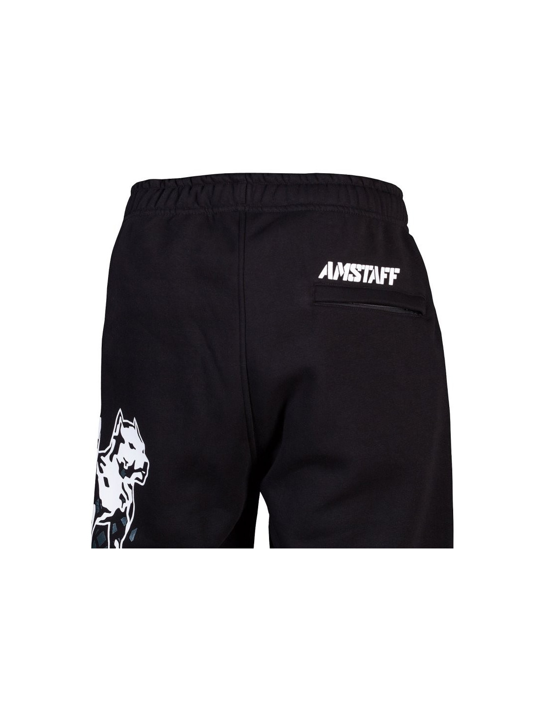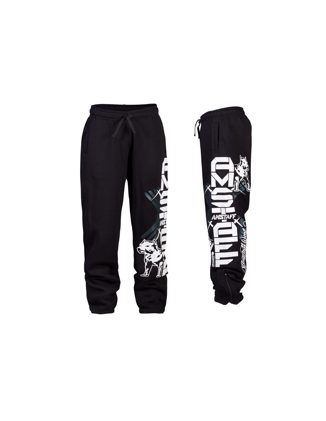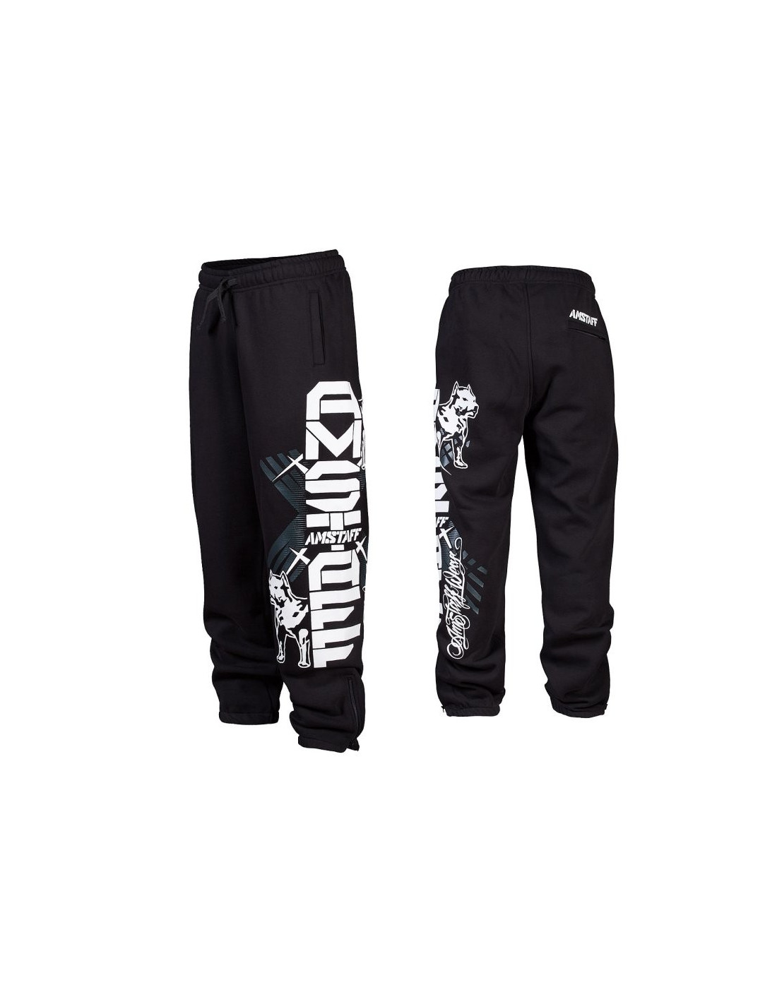 Supersvedige sorte Amstaff sweatpants med brand logo på siden af venstre ben, som går både ind foran og om på bagsiden. Amstaff Sweatpants er cool, behagelige at have på. Har en praktisk baglomme med lynlås og produktet er i supergod kvalitet. Materiale: 80 % bomuld, 20% polyester. Vask ved max 30 grader på vrangen.