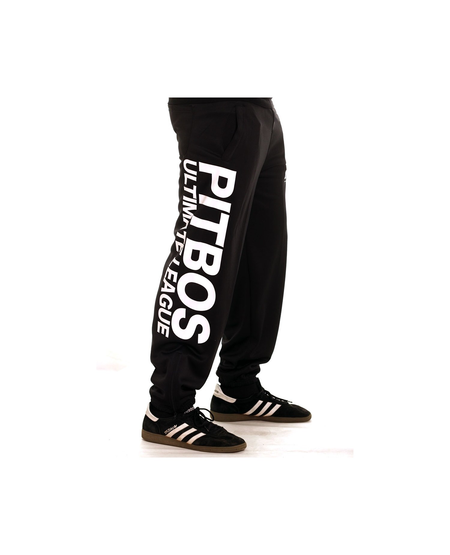 Pitbos Ultimate League Sweatpants er sorte med et stort hvidt brandlogo print ned af højre ben og et mindre logo på venstre hofte. Pasformen er super behagelig. De er forsynet med sidelommer og baglommer. Buksen har ligeledes praktiske lynlåse ved anklerne og indvendigt snøretræk, som kan give den perfekte pasform. Pitbos er et stærkt street rebelbrand.