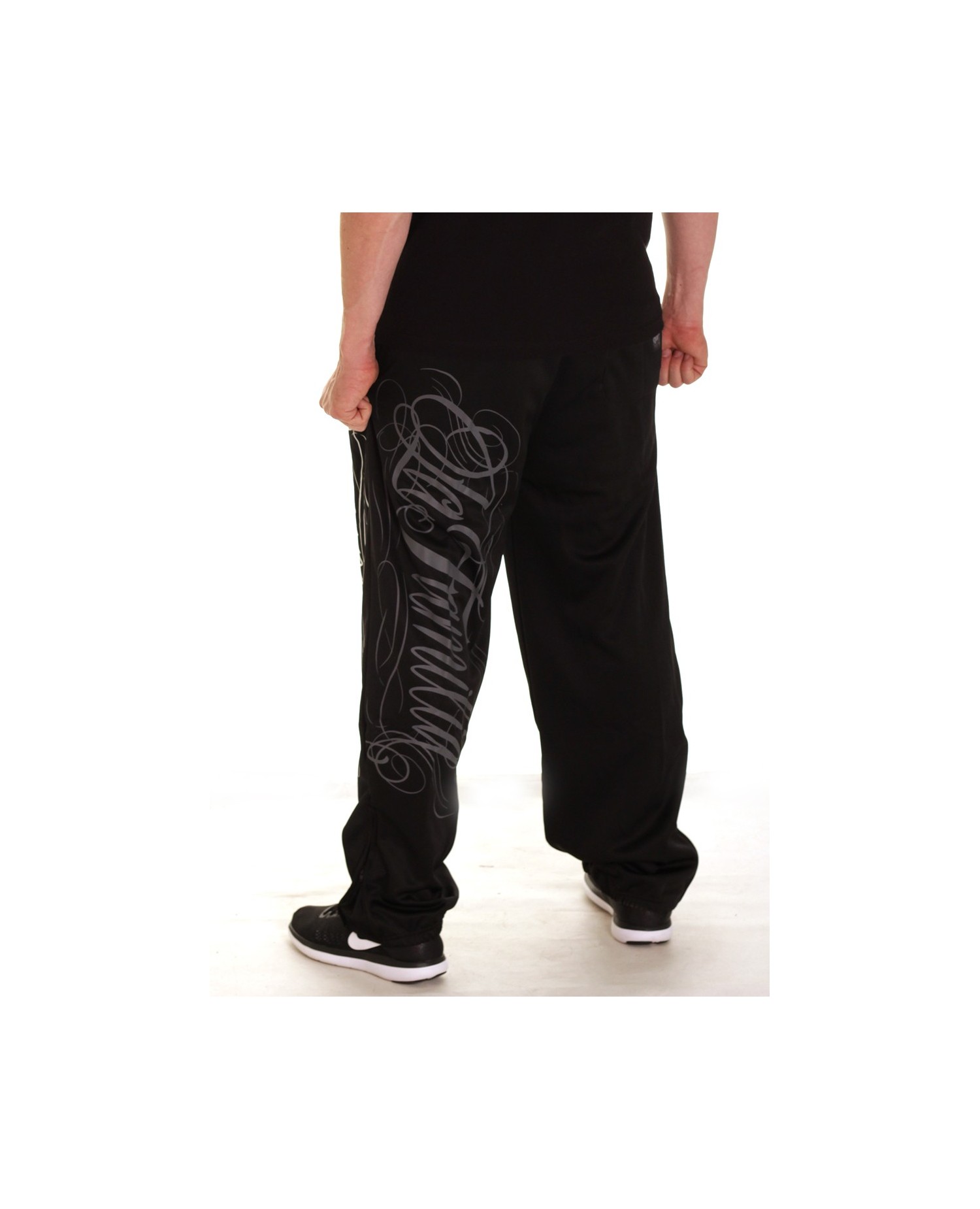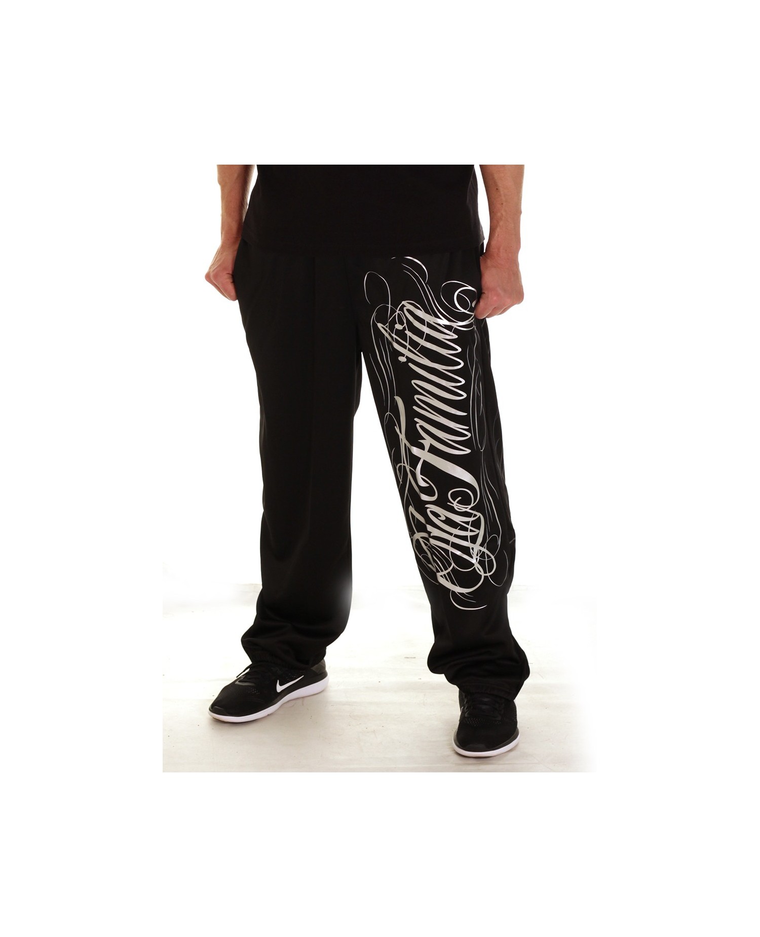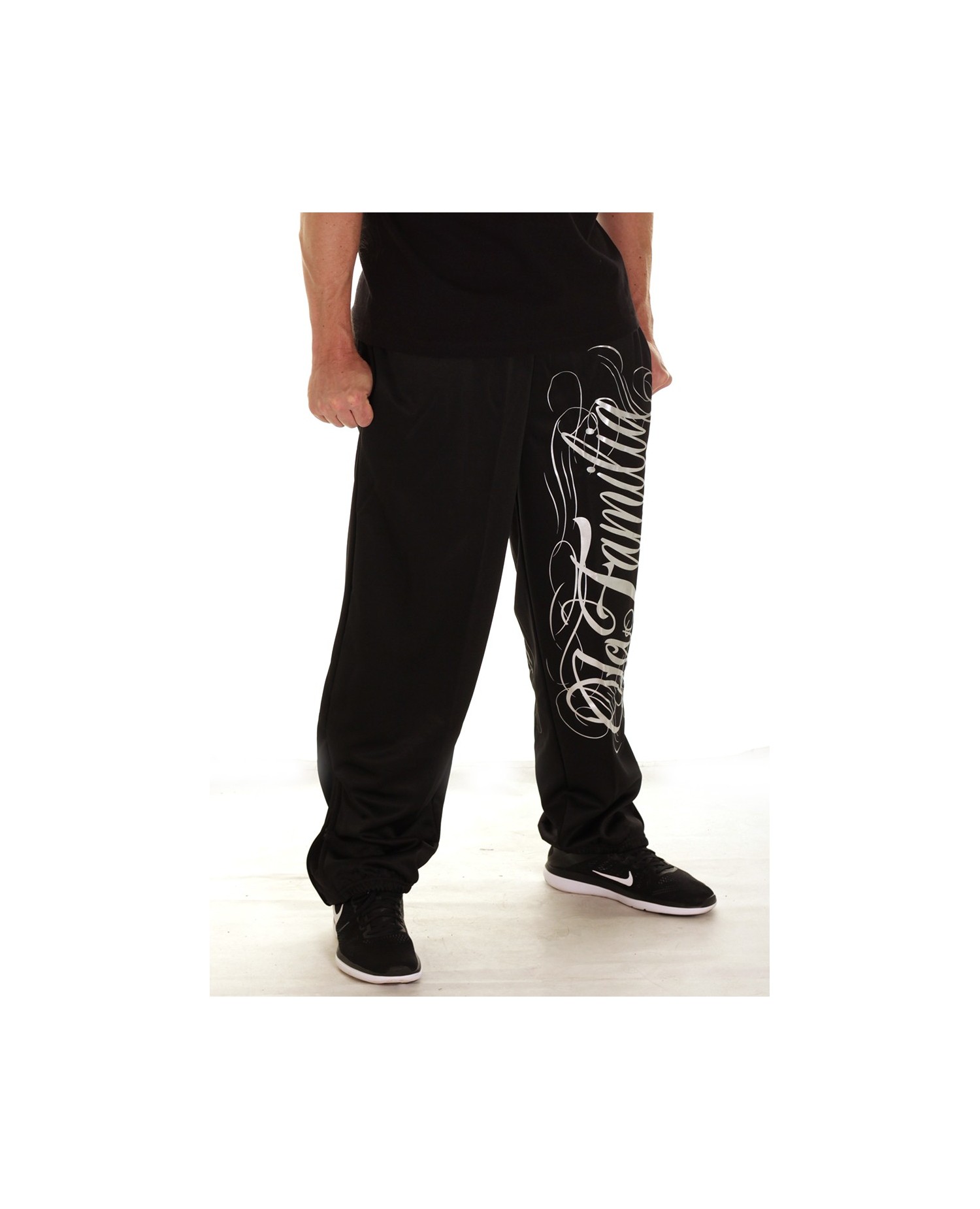 Stilede Sweatpants fra hiphop brandet BSAT. LA FAMILIA designet er fra brandets Straight Outta Compton linje. De sorte Sweatpats har et stort sølv håndtegnet LA Familia print på venstre ben. Printet gentages i en mere neddæmpet grå farve bagpå. På baglommen er placeret et lille brand logo batch. Designet er meget vellykket og stærkt. Det er rå skønhed og formidler et vitalt og smukt budskab. I RudeCru familien hylder vi også LA FAMILIA.