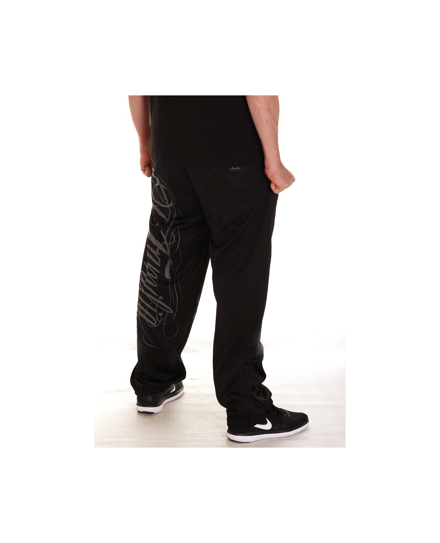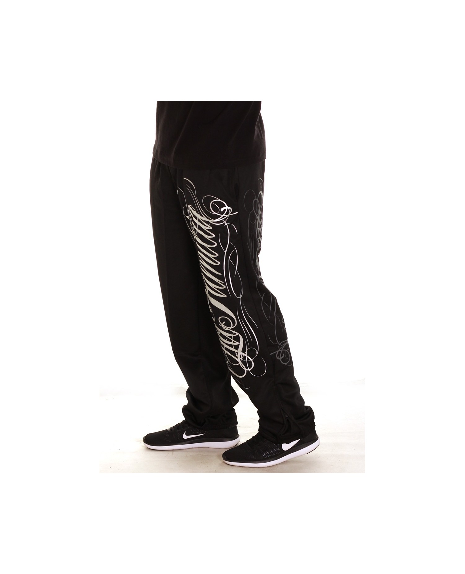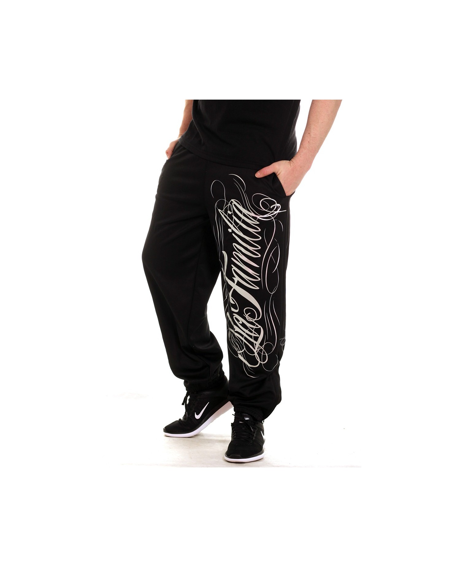 Stilede Sweatpants fra hiphop brandet BSAT. LA FAMILIA designet er fra brandets Straight Outta Compton linje. De sorte Sweatpats har et stort sølv håndtegnet LA Familia print på venstre ben. Printet gentages i en mere neddæmpet grå farve bagpå. På baglommen er placeret et lille brand logo batch. Designet er meget vellykket og stærkt. Det er rå skønhed og formidler et vitalt og smukt budskab. I RudeCru familien hylder vi også LA FAMILIA.