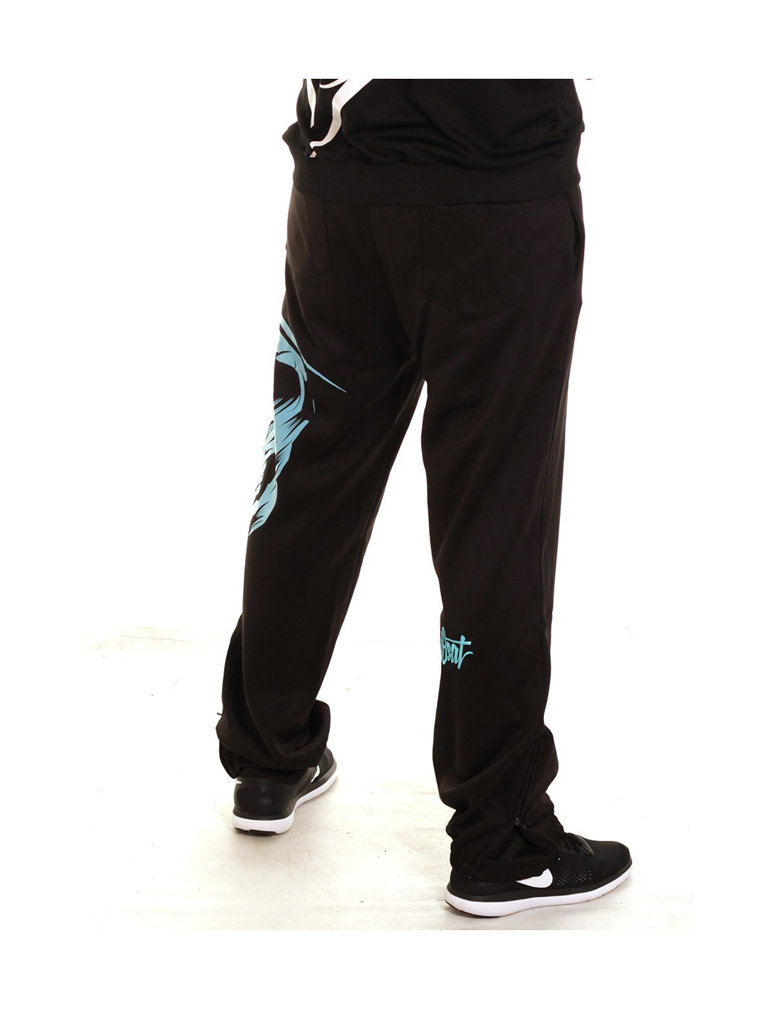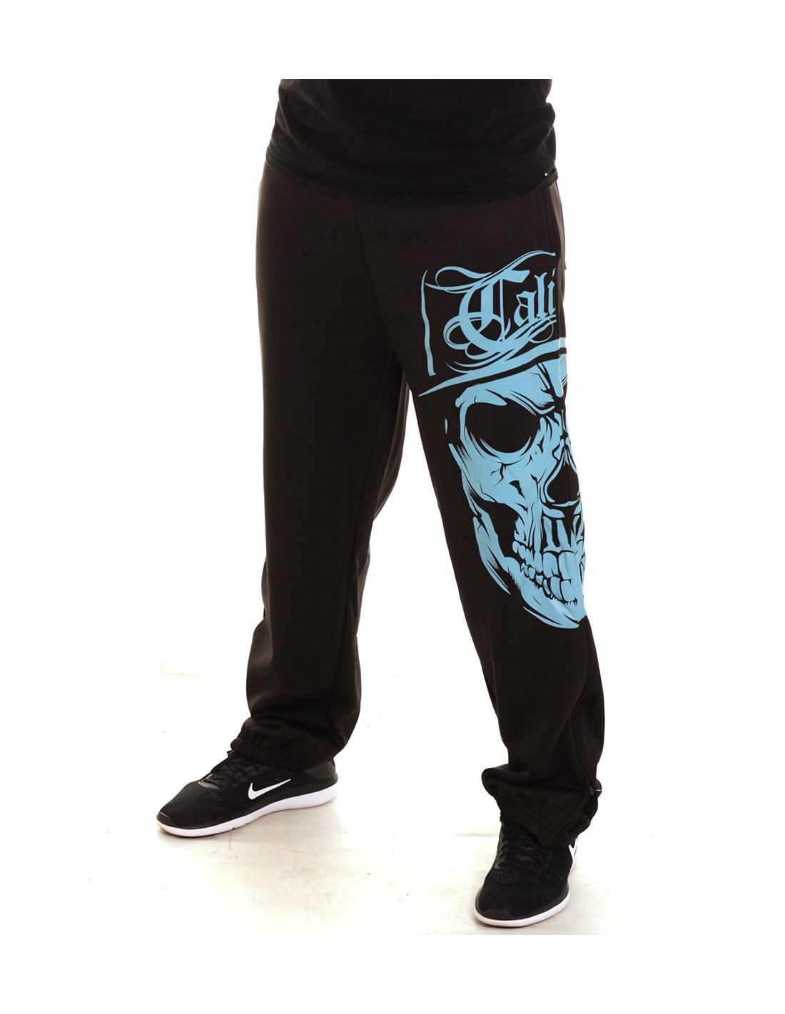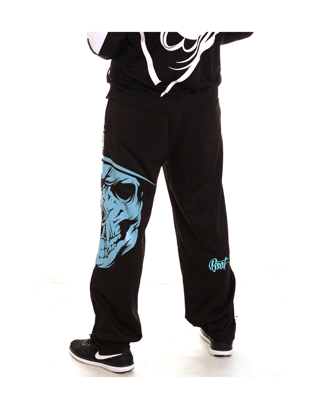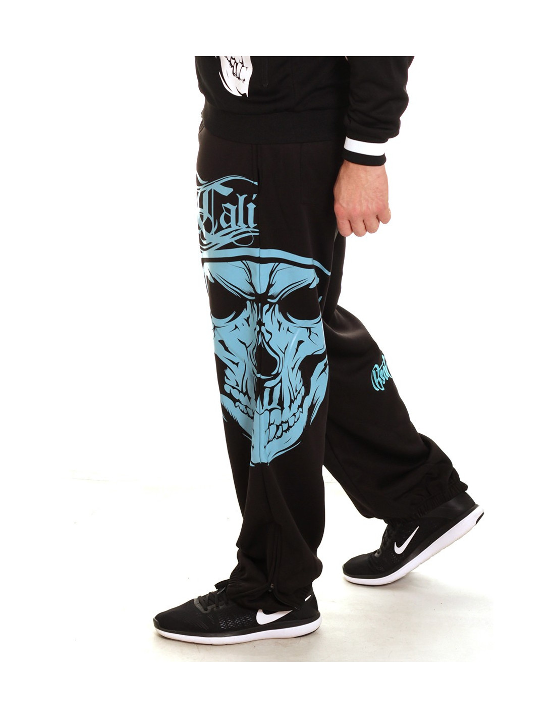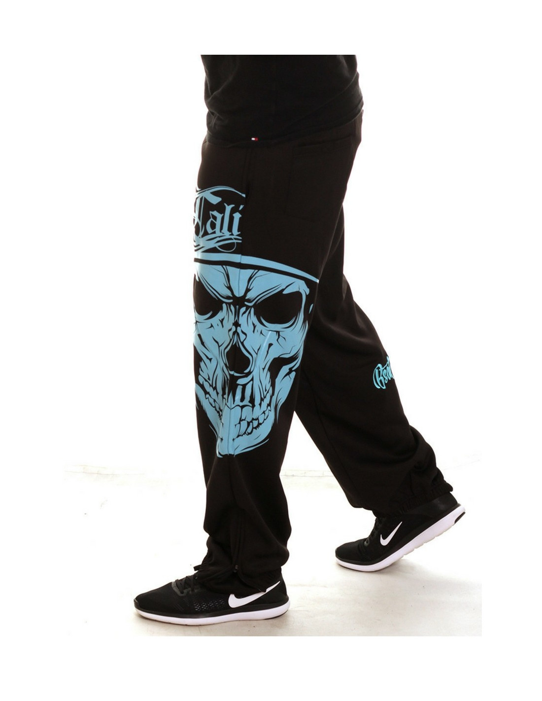 Bestseller Sweatpants fra BSAT nu i sort og himmelblå. Cali Skull designet i himmelblå er placeret på venstre ben, mens et mindre BSAT logo markerer højre læg. Lynlåse ved anklerne og et sort indvendigt snøretræk bidrager til en perfekt siddende baggy pasform.