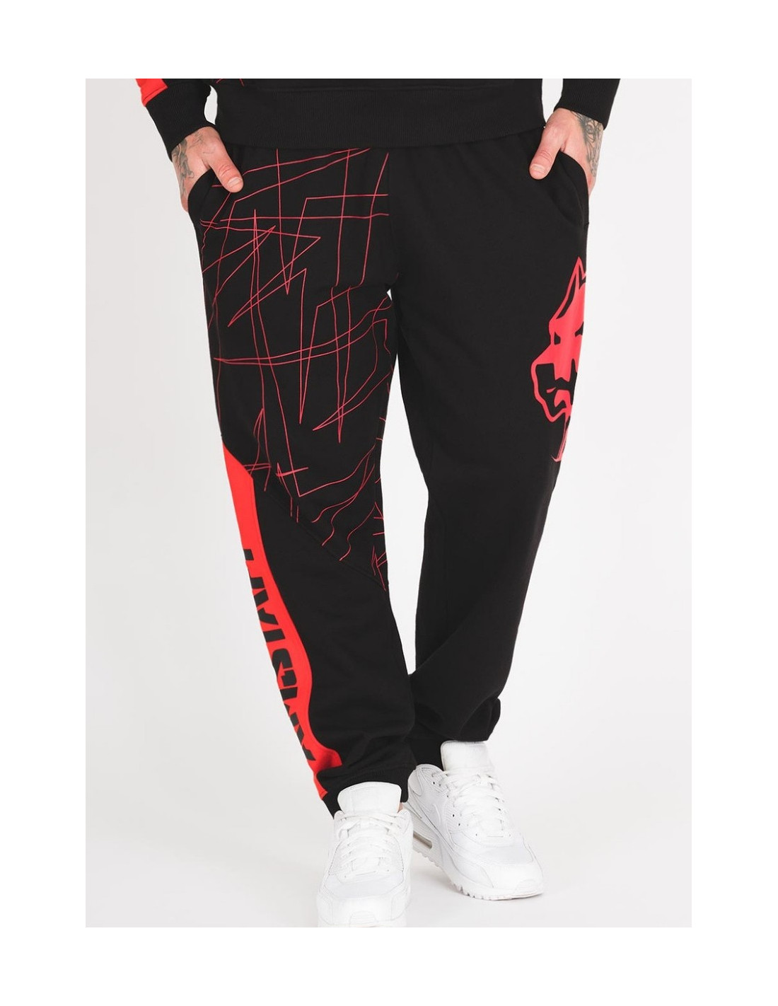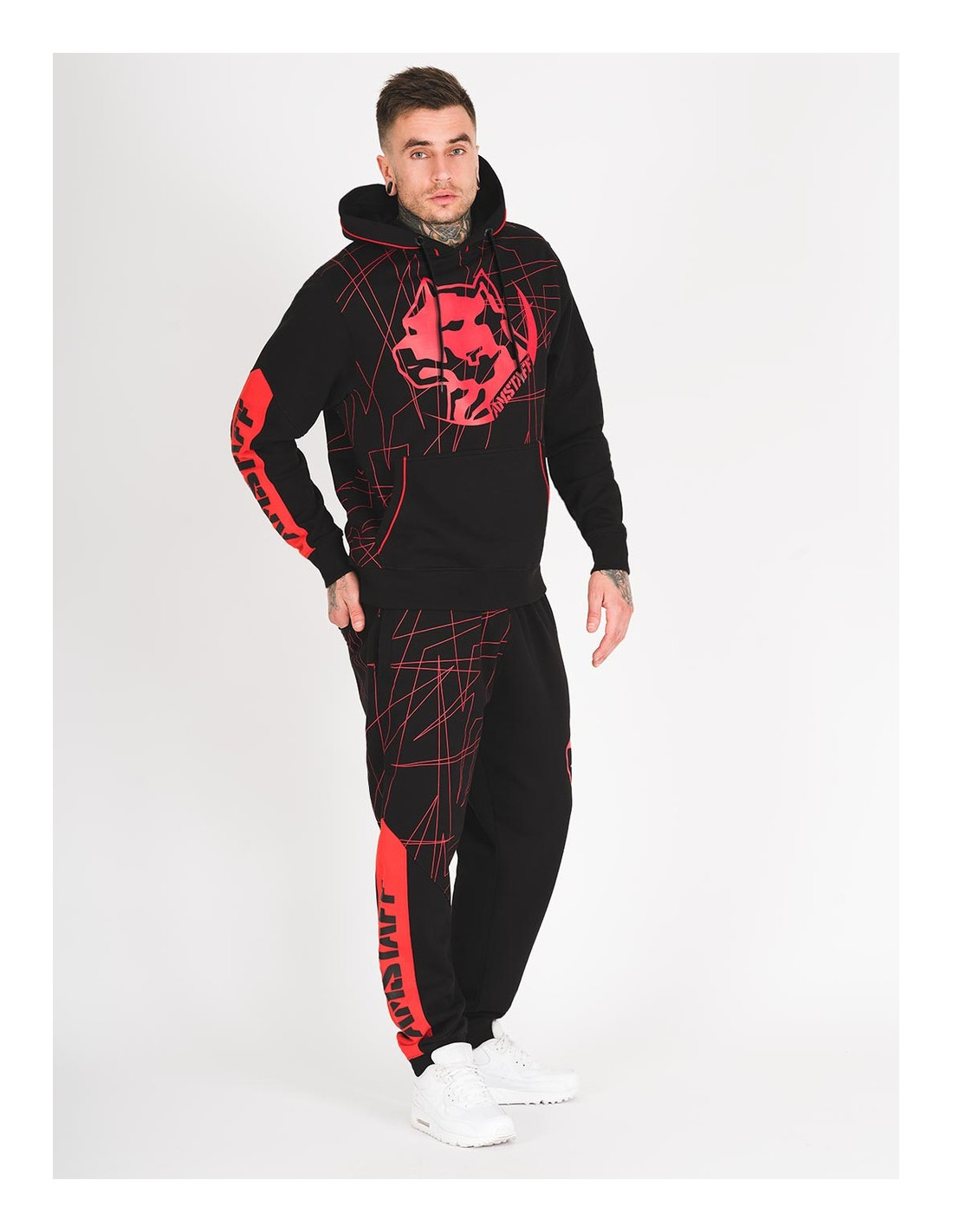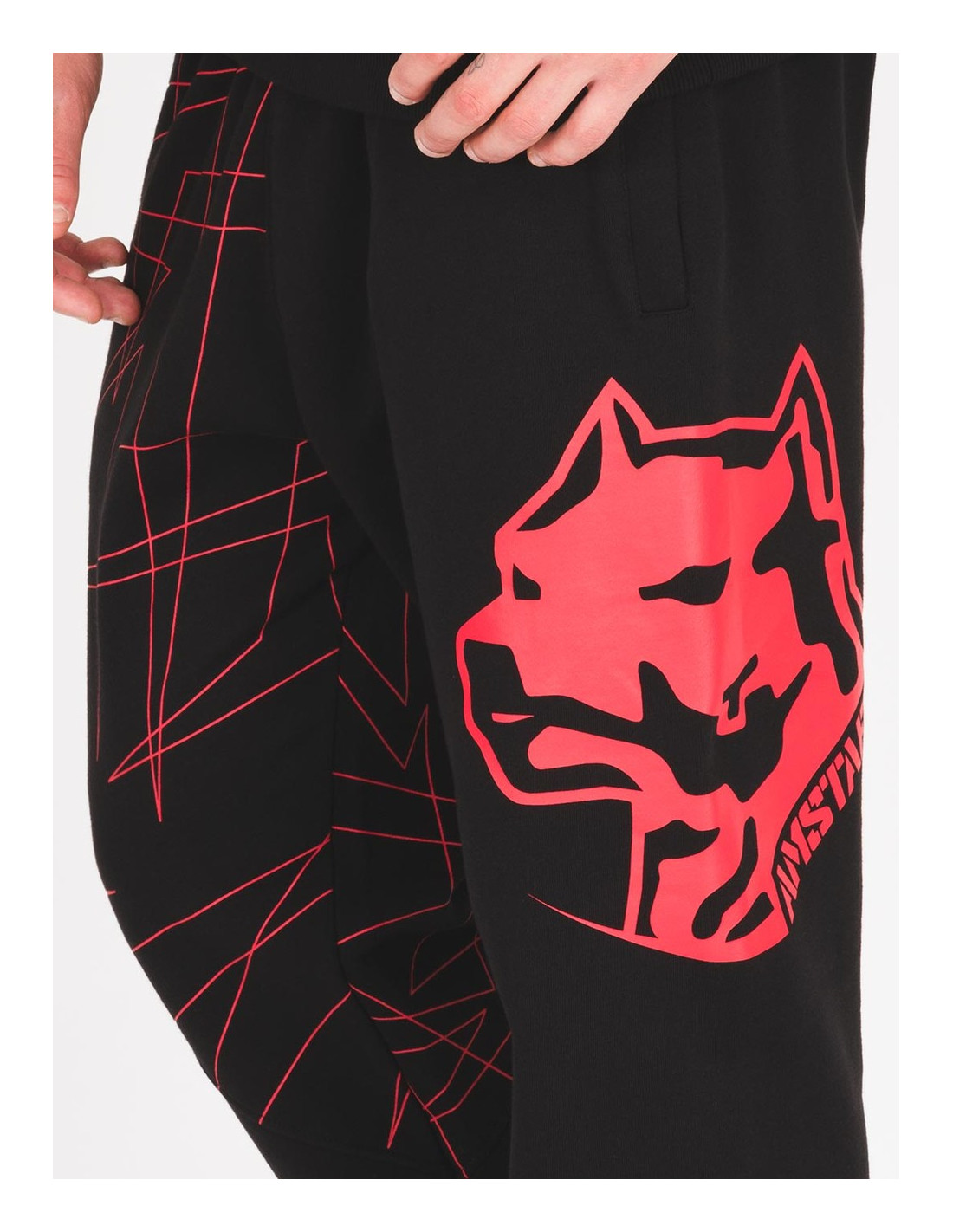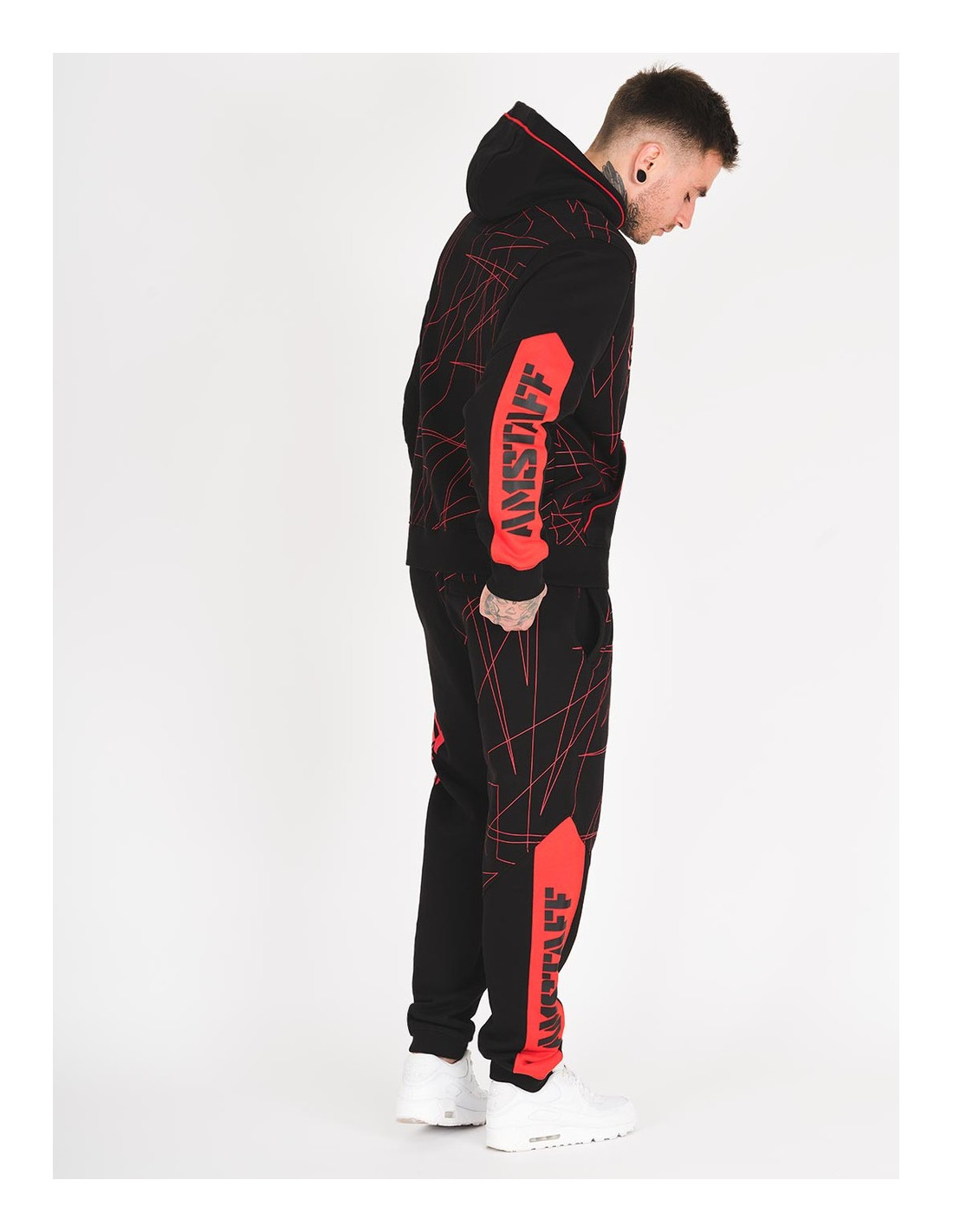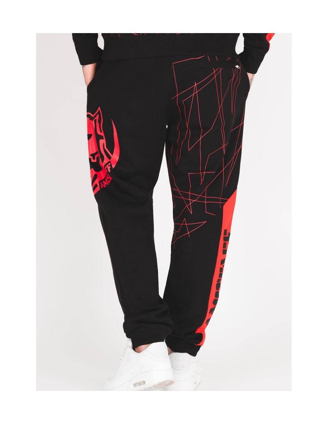 Sporty sorte sweatpants fra Amstaff med rød brandlogo hund og abstrakte striber.