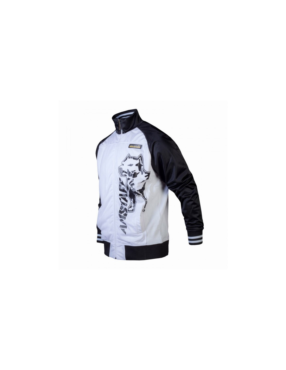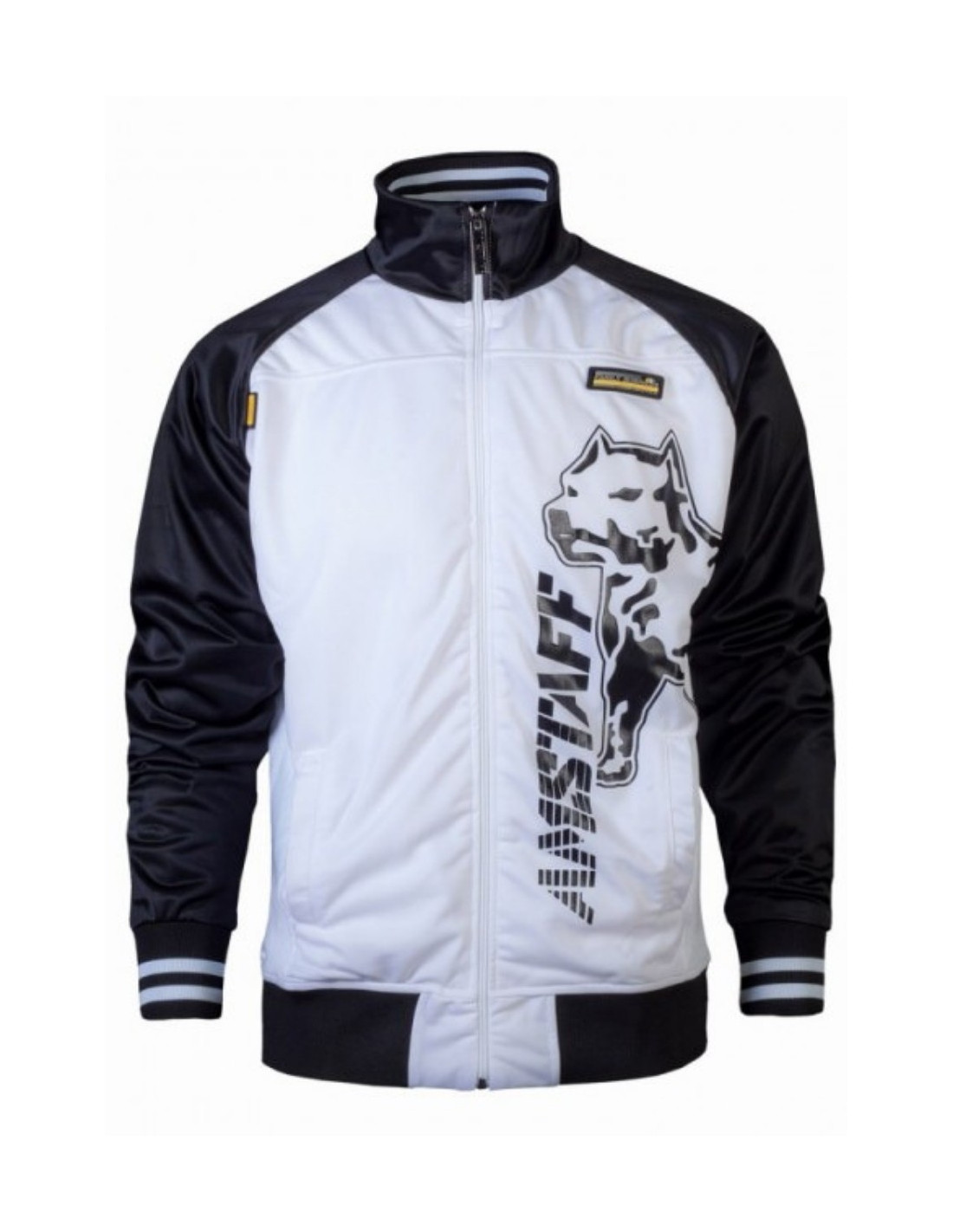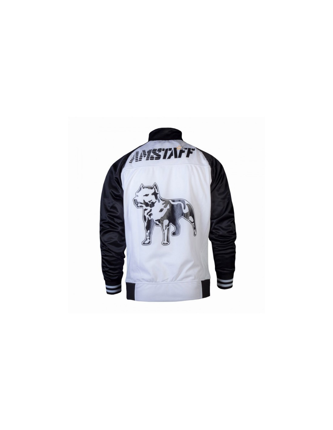 Sort/hvid Amstaff Trackjacket med stilede brandlogo prints foran og bagpå. Jakken har sort/hvid stribede ribkante på ærmerne og en sort ribkant forneden, hvilket understreger jakkens sporty look. Jakken har 2 lommer og Inliningen er lavet i et let og luftigt meshmateriale. Jakken er i 100% polyester.