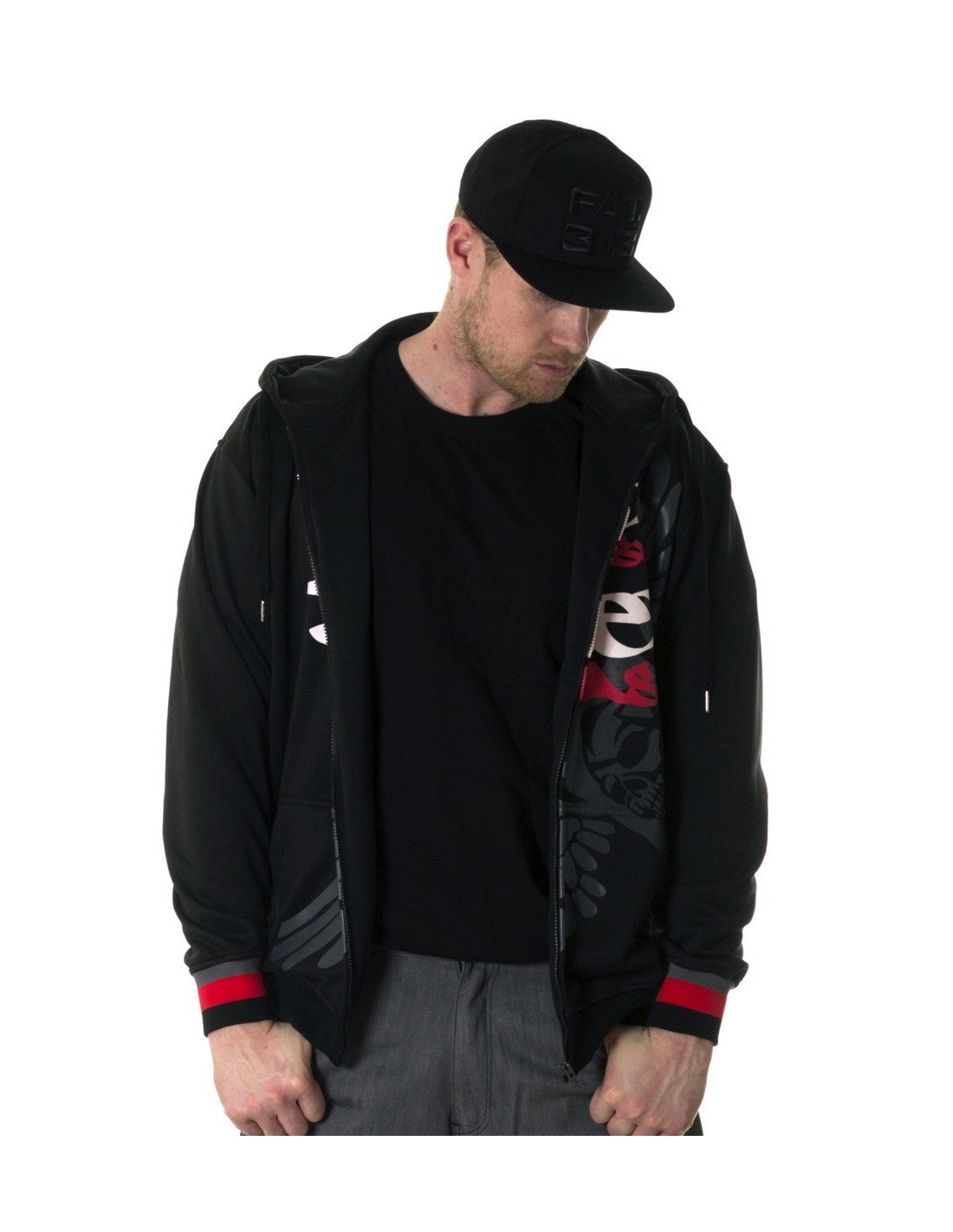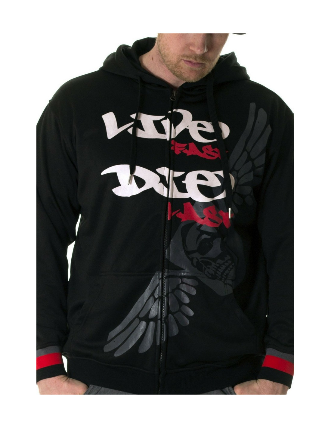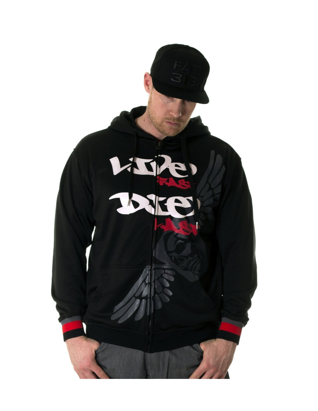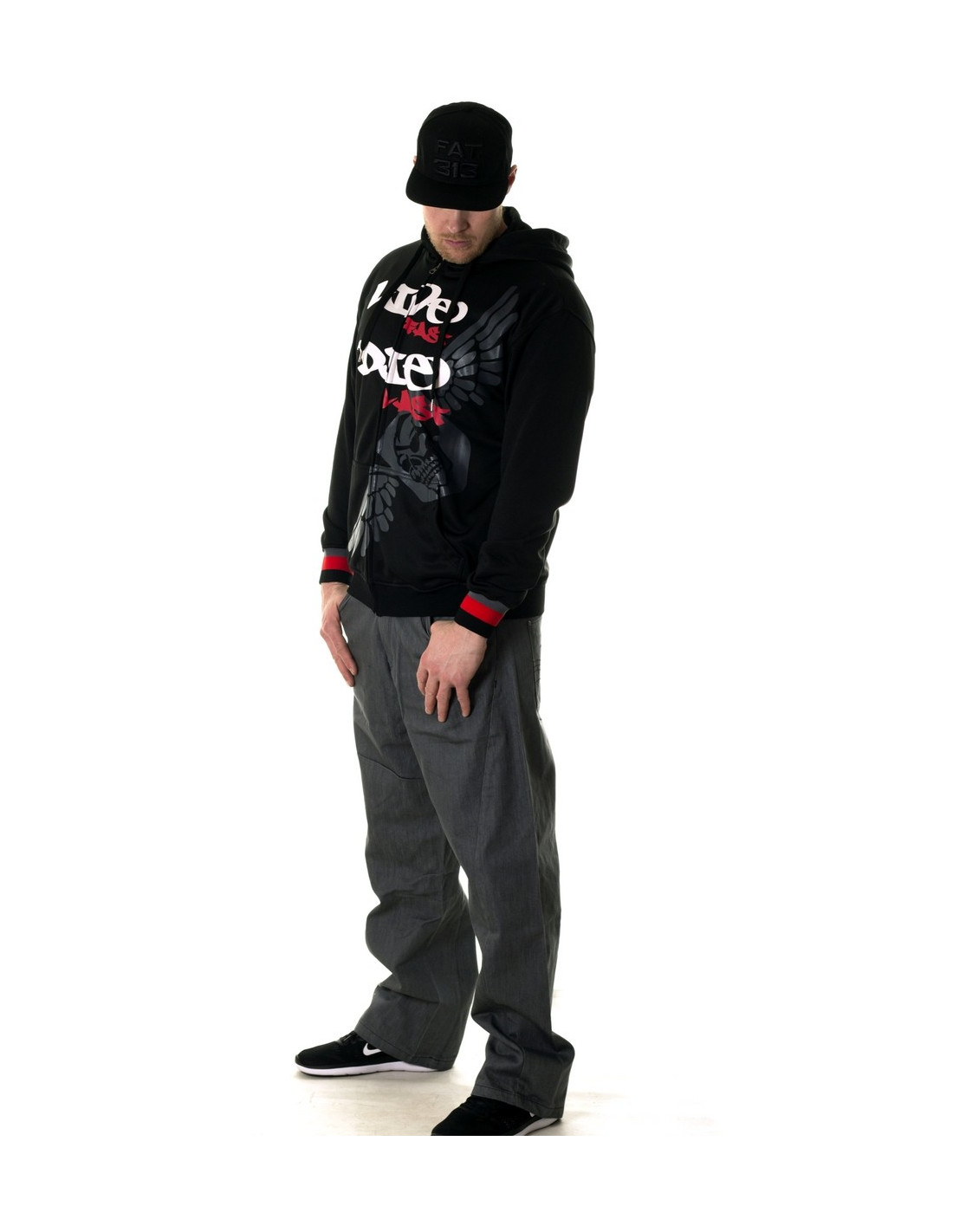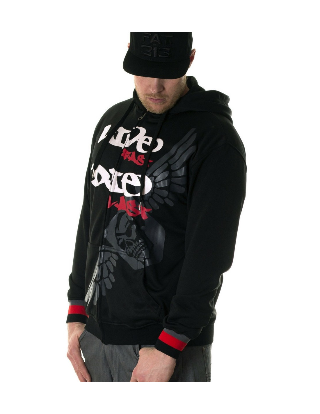 Live Fast Die Last er et sejt statement med genuin Hip Hop power. Det stærke statement troner på Hoodiens forside oven på et diskret gråt skull med store vinger. Det grå skull med store vinger gentages skråt ned af ryggen oven på brandnavnet. LIve fast Hoodien har sporty grå/rød/stribede ribkante på ærmerne, som afrunder og giver et stærkt sort/rød/grå streetwear produkt. BSAT er et hip-hop og Urban Art streetwear mærke, som især er slået igennem med originale skull produkter og usædvanige chica designs.