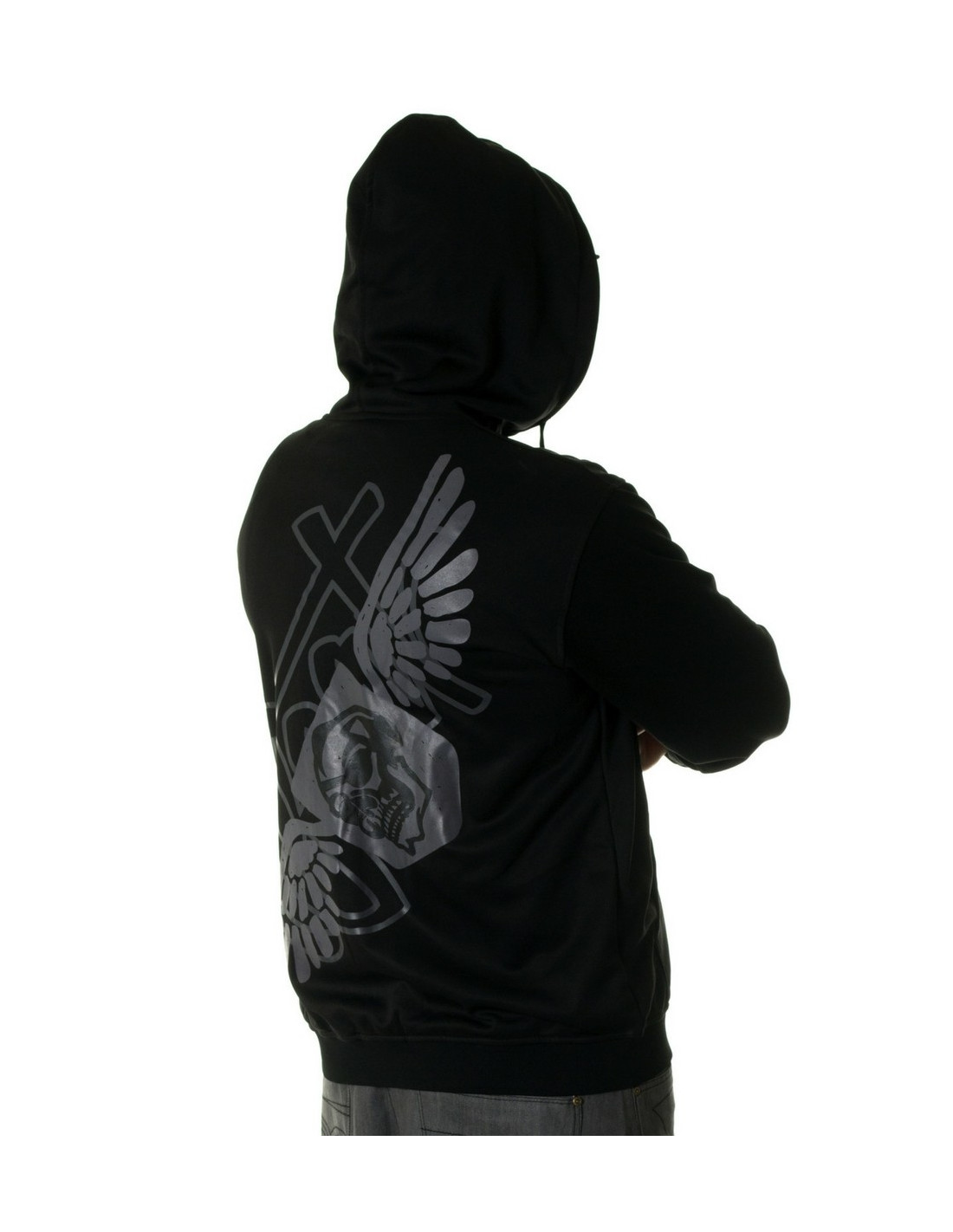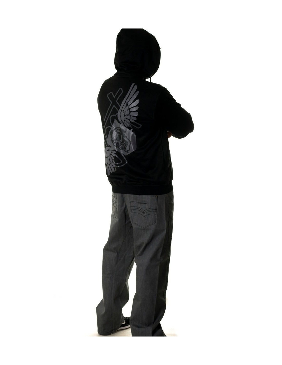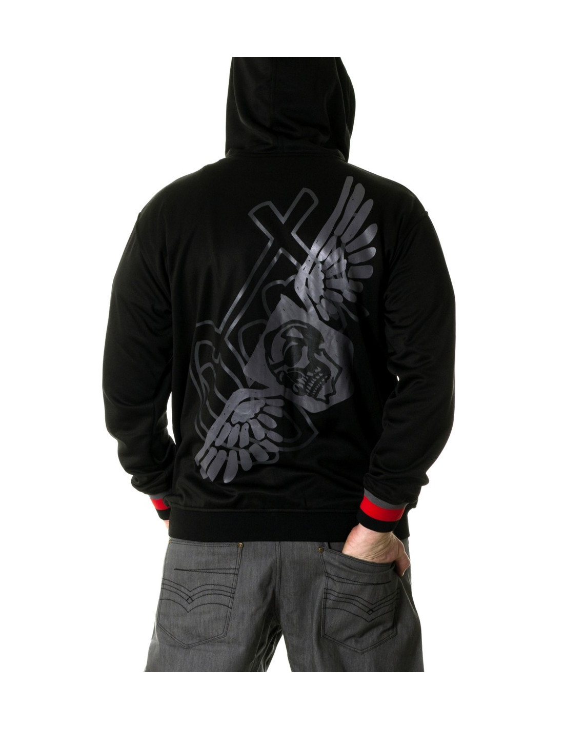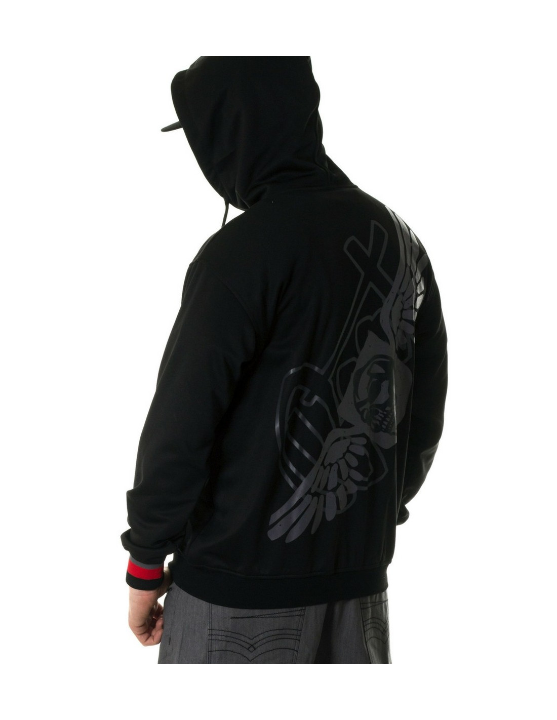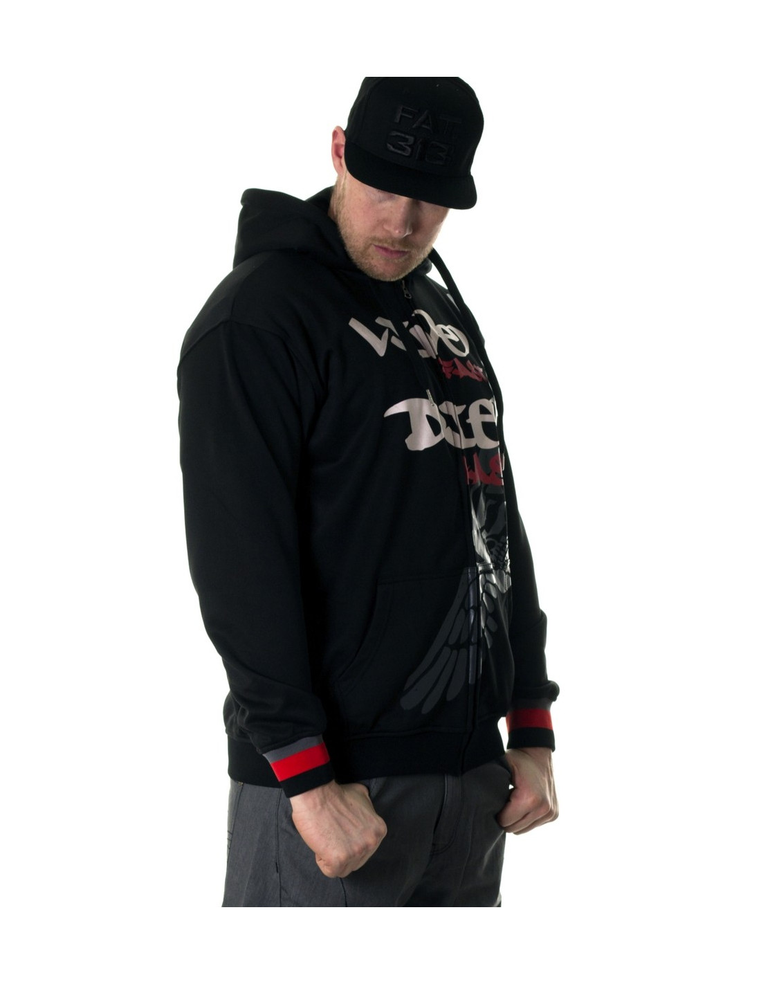 Live Fast Die Last er et sejt statement med genuin Hip Hop power. Det stærke statement troner på Hoodiens forside oven på et diskret gråt skull med store vinger. Det grå skull med store vinger gentages skråt ned af ryggen oven på brandnavnet. LIve fast Hoodien har sporty grå/rød/stribede ribkante på ærmerne, som afrunder og giver et stærkt sort/rød/grå streetwear produkt. BSAT er et hip-hop og Urban Art streetwear mærke, som især er slået igennem med originale skull produkter og usædvanige chica designs.