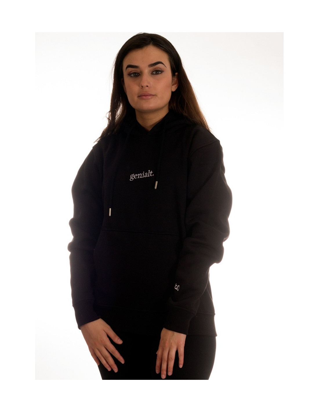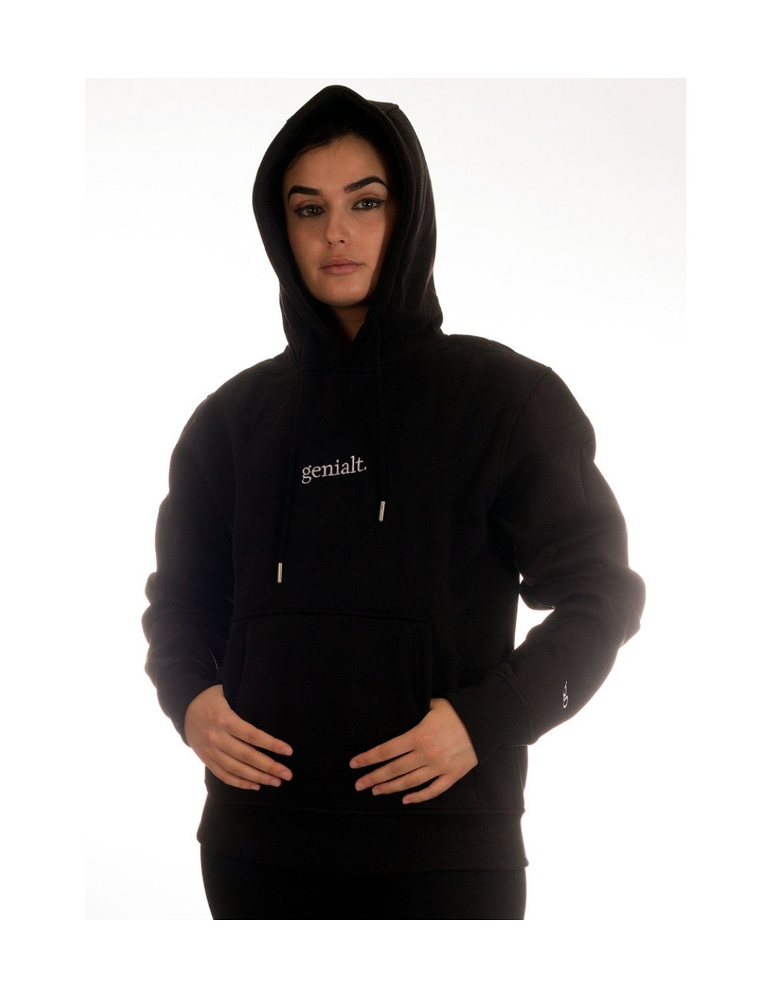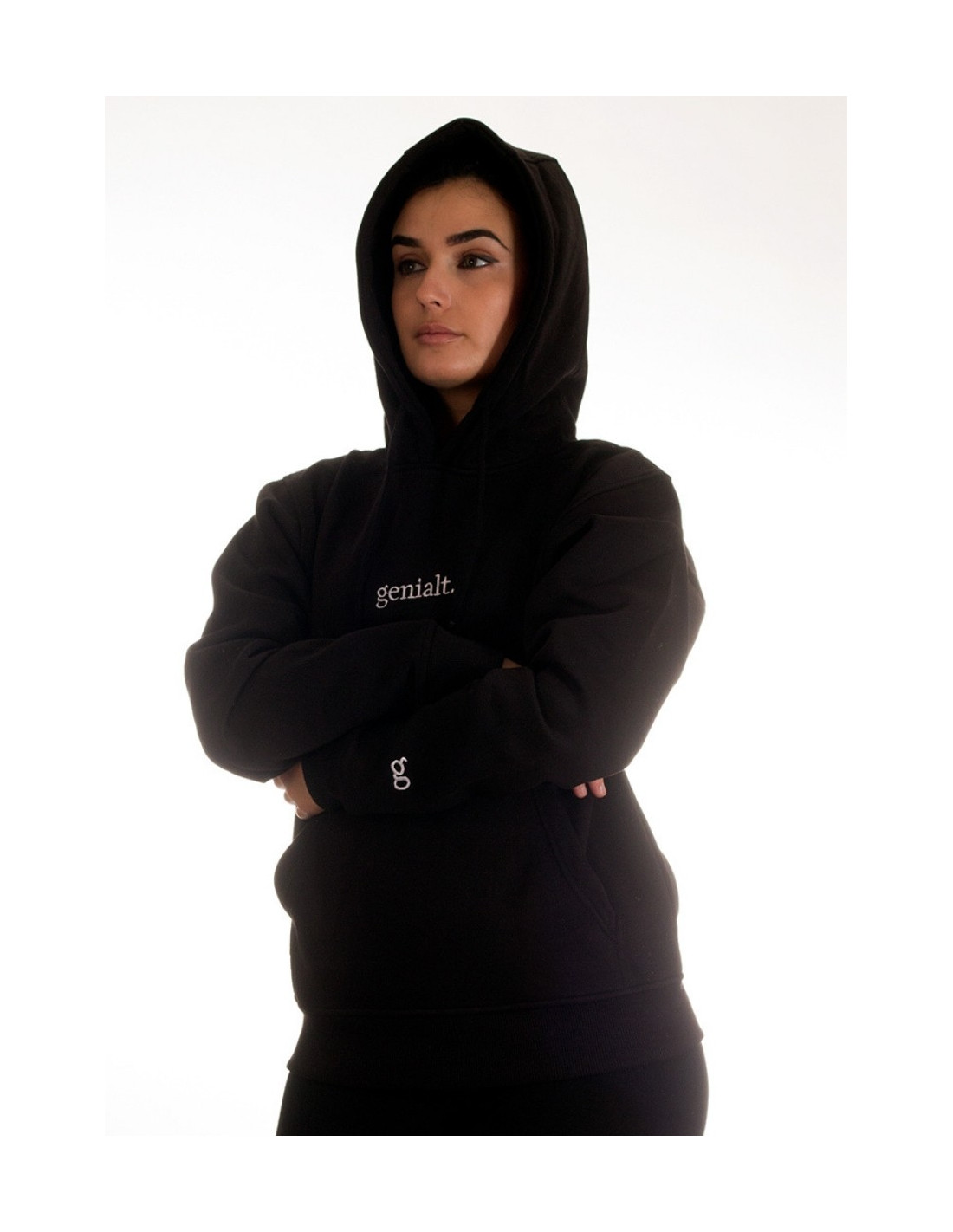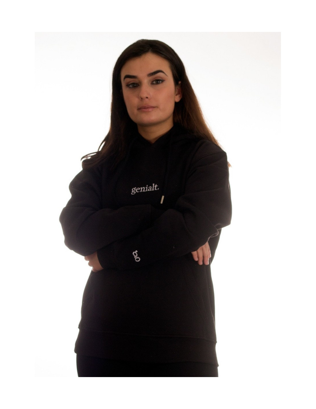 genialt. er et urbant premium fashionbrand. genialt. brandlogo Hoodien er sort. Brandnavnet er stitchet mit på brystet og brandlogoet nederst på venstre ærme. Begge dele i hvidt. Hoodien har klassiske kænguru lommer med en skjult indvendig lynlåslomme. Jo, genialt. var navnet og den indvendige lomme er vitterlig en genial detalje. Praktisk til sikker opbevaring af mobilen. Hoodien passer i det hele taget perfekt til en moderne urban livsstil med sit enkle eksklusive look. Et perfekt valg til alle, der er til en minimalistisk streetwear stil.