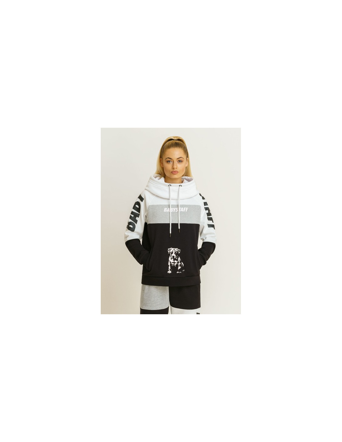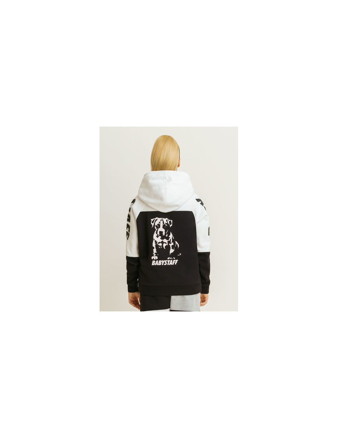 Hoodie fra Babystaff i sort, lysegrå og hvid. På en legende og kreativ måde kombineres farverne på denne trendy Hoodie. Brandets søde logohund indtager selvfølgelig en central placering på ryggen og er ligeledes placeret mellem de praktiske kængurulommer. Hoodien har en lækker comfi stor hætte. Materiale: 80% Bomuld, 20%