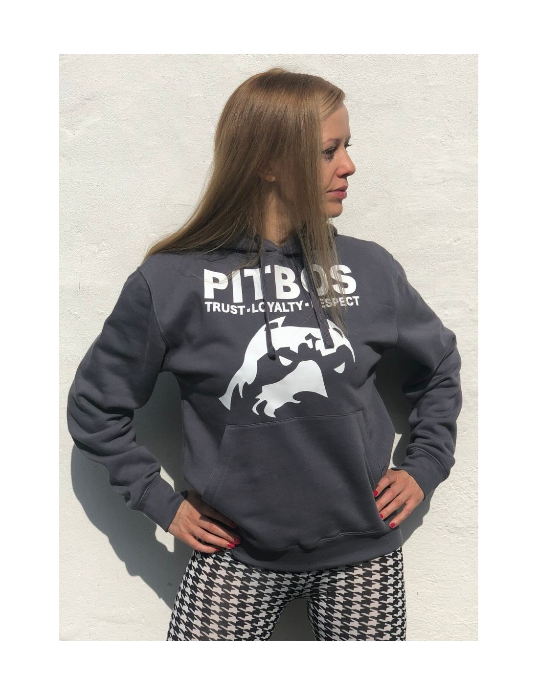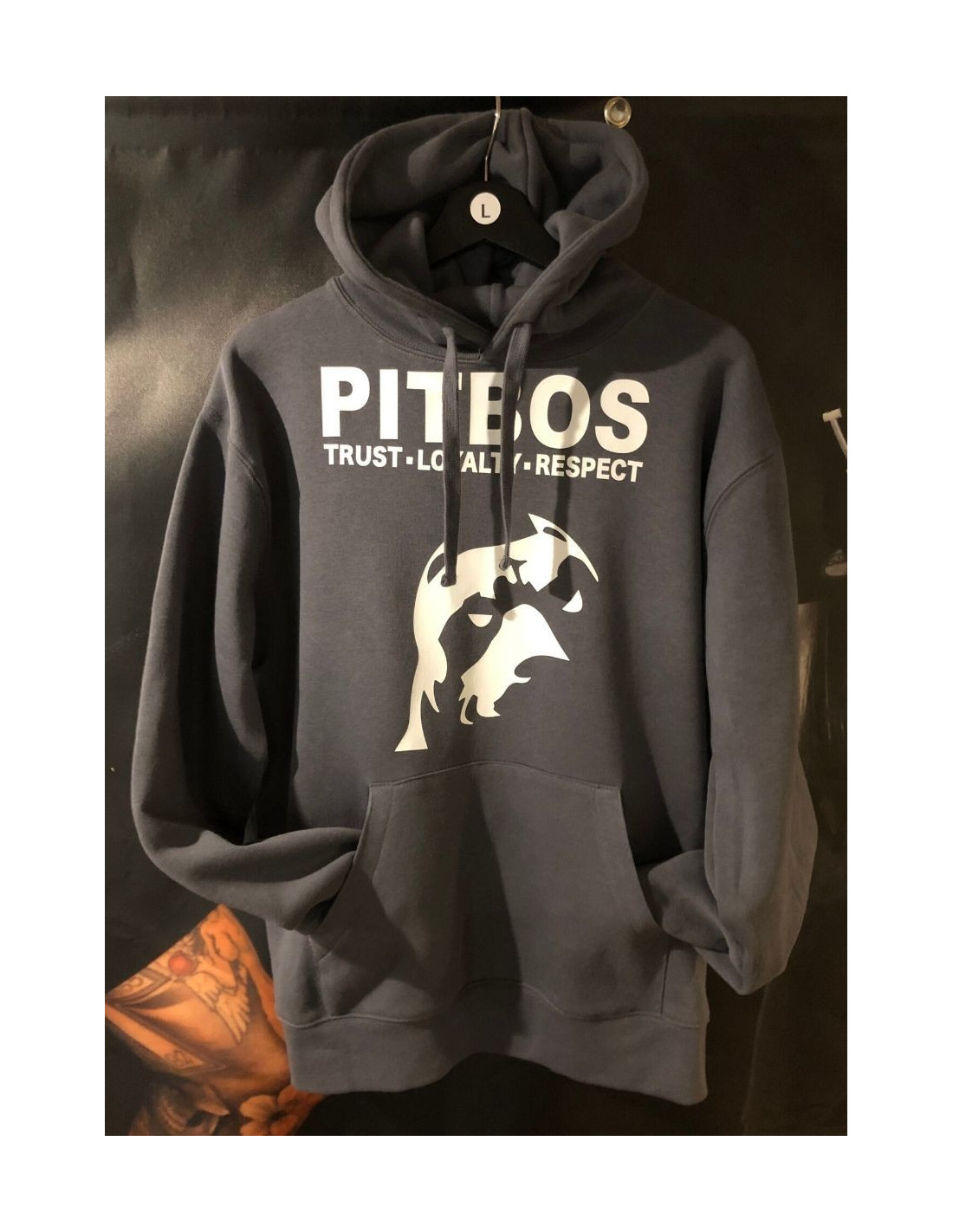 Lækker Pibos Hoodie med hvidt print på brystet. Designet består af Pitbos brandlogo, brandets nøgleværdier: TRUST, LOYAL, RESPECT og Pitbos hunden. Hoodien har klassiske kængurulommer og en flot varmglødet grå farve.