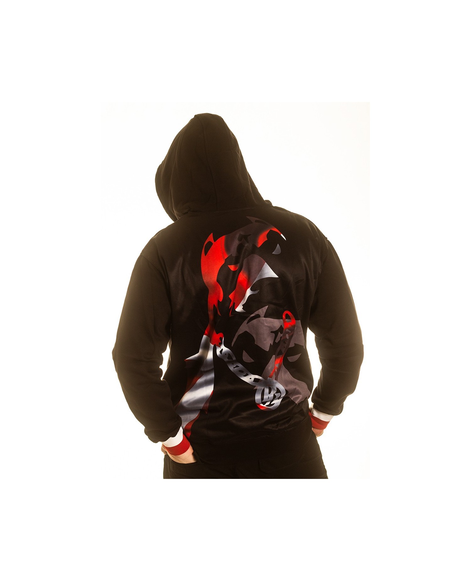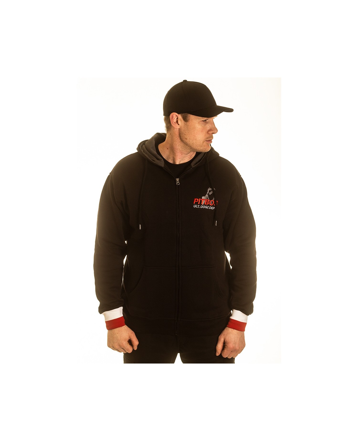 Top lynlås hættetrøje med et stort Artwork på ryggen af den coole Logo hund, som er klædt i et dansk flag. Motivet gentages som skygge i grålige nuancer. Pitbos Ultimate Dog League logoet er broderet på venstre brystkasse. Hættetrøjen har et iøjnefaldende og sporty look, som forstærkes af de stribede ribkante på ærmerne og af, at hætten indvendigt er foret med mørkegrå mesh lining.