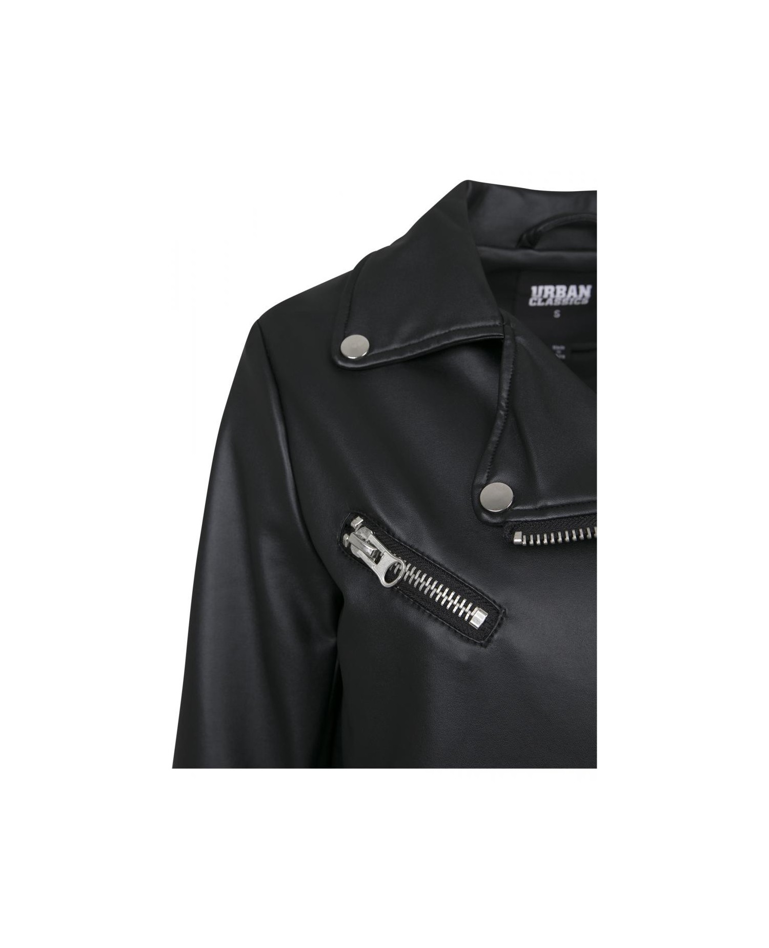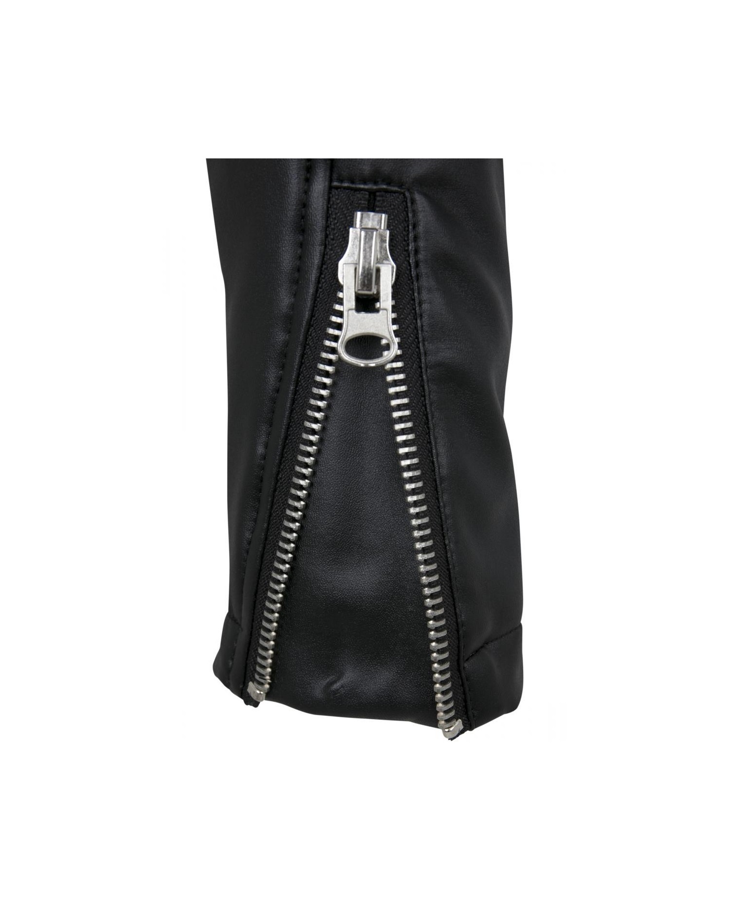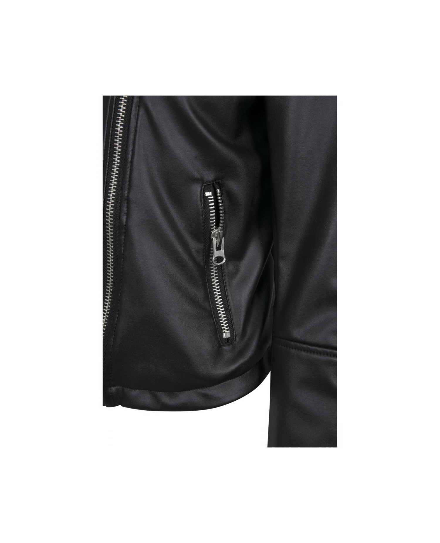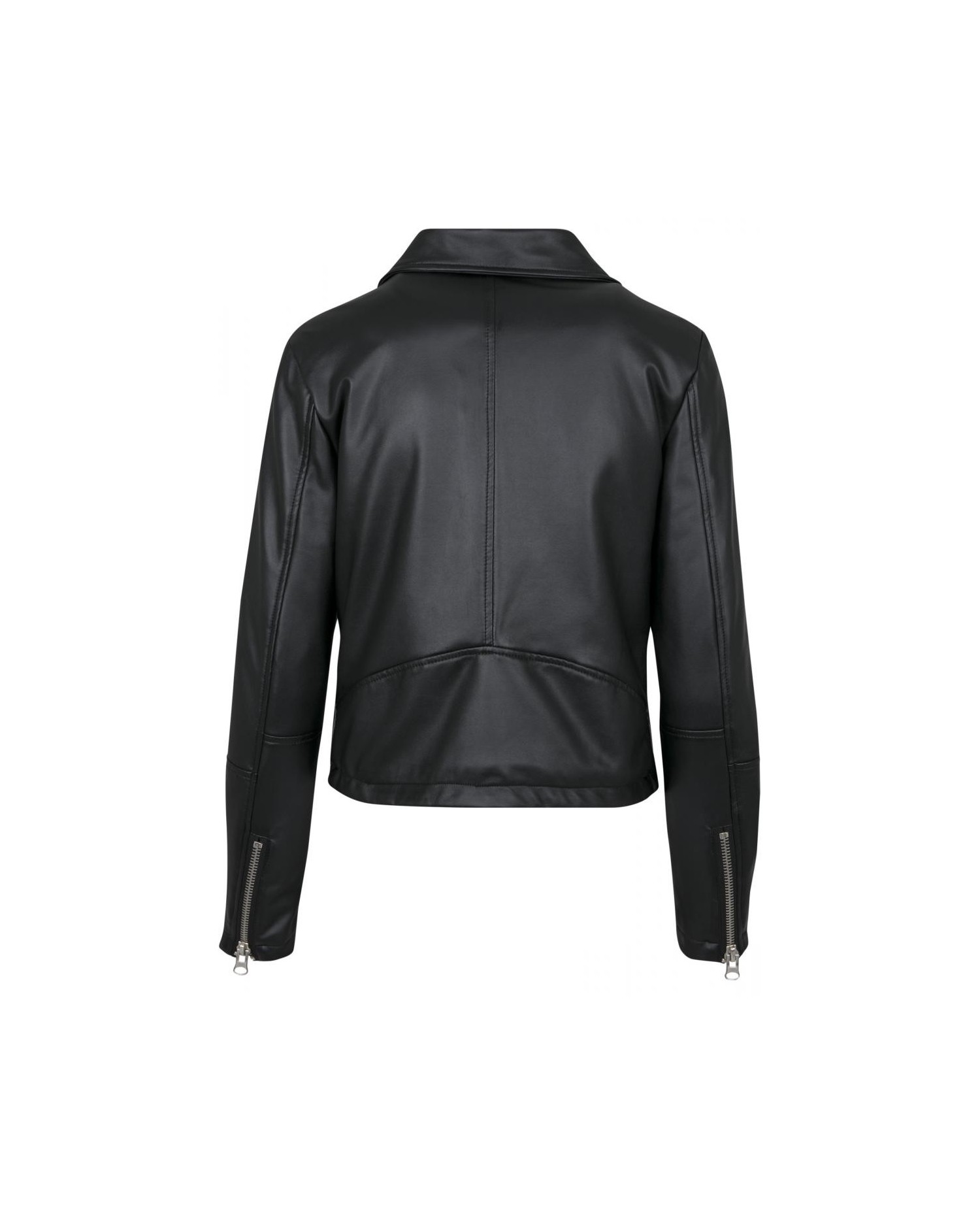 Kort rå Biker Jacket med solide lynlåse i sort kunstlæder. #RockOn. Jakken er fra Urban Classics.