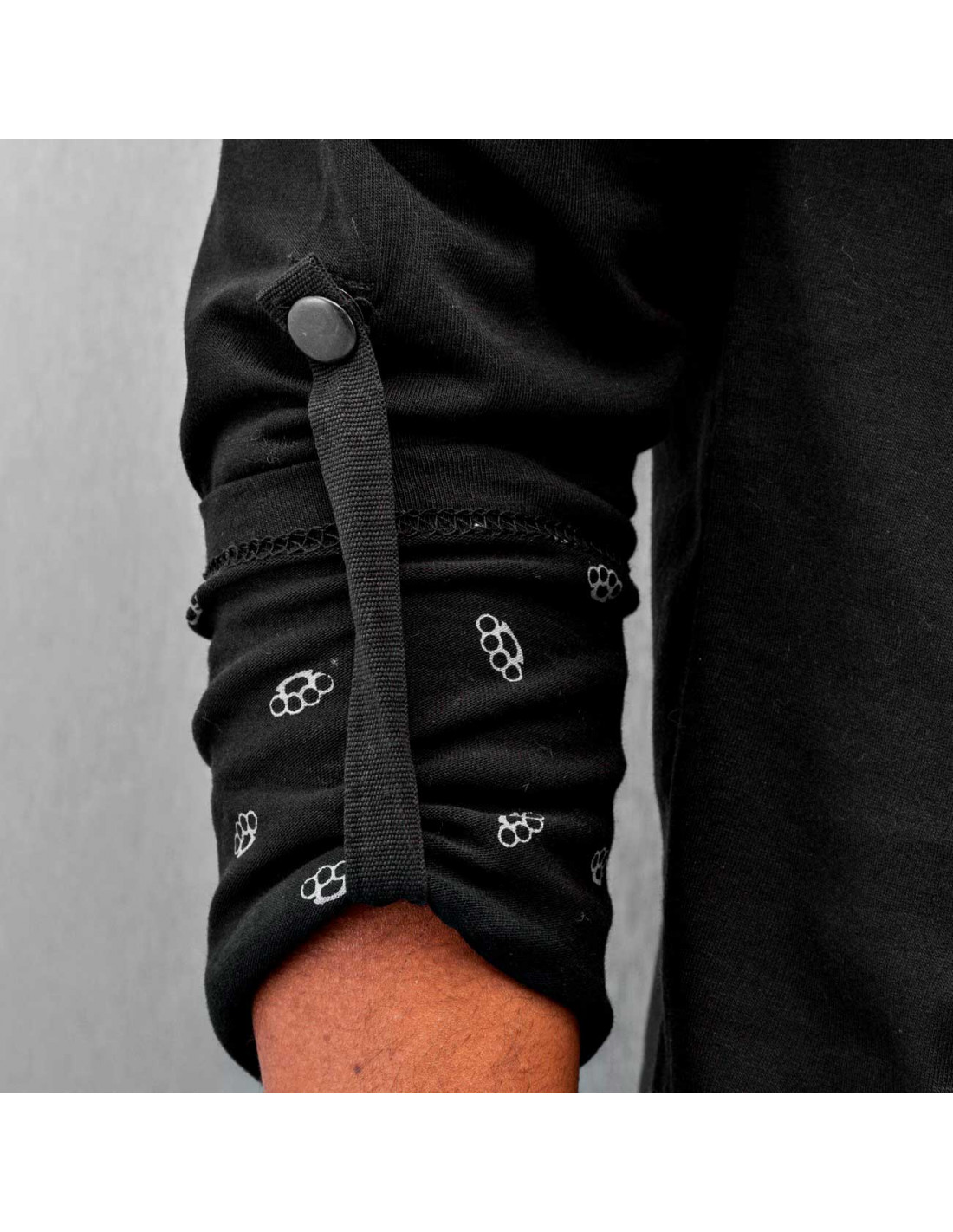 Den langærmede sorte Fucking Sick T-Shirt er fra HipHop Brandet DGNRS. Det hvide print troner som 2 søjler på brystet med guns, chicas, hampblade m.m. De lange ærmer kan fastgøres som 3/4 ærmer, hvorefter hvide knojern prints kommer til syne.