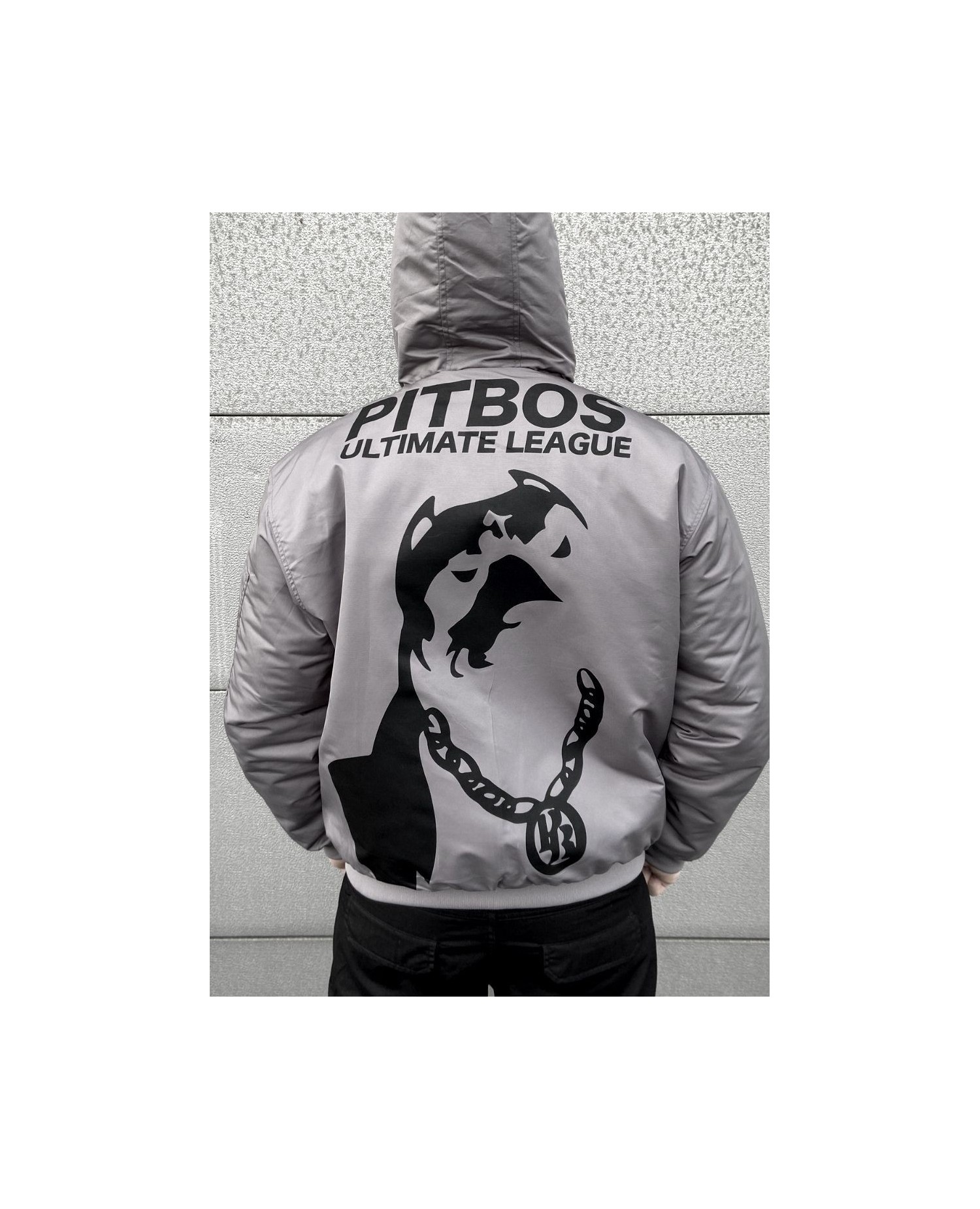 #WhoLetTheDogsOut?! Pitbos5.515 er navnet. Vinterjakken er lysegrå med sort logo og Pitbos Hunden på ryggen. På brystet er brandlogo broderet. Jakken har sidelommer med lynlås, en indvendig lolle med velcro lukning og en lynlåslomme på venstre overarm.
