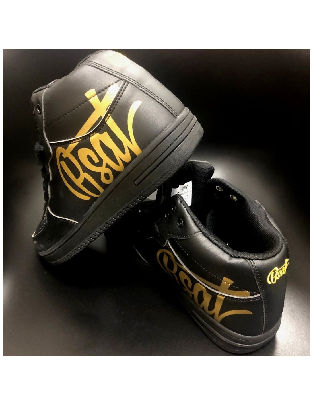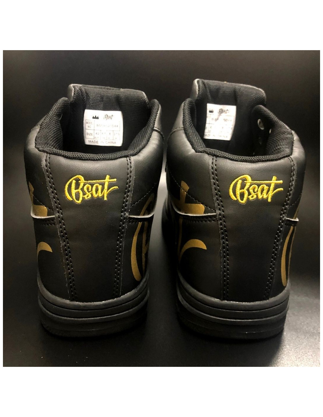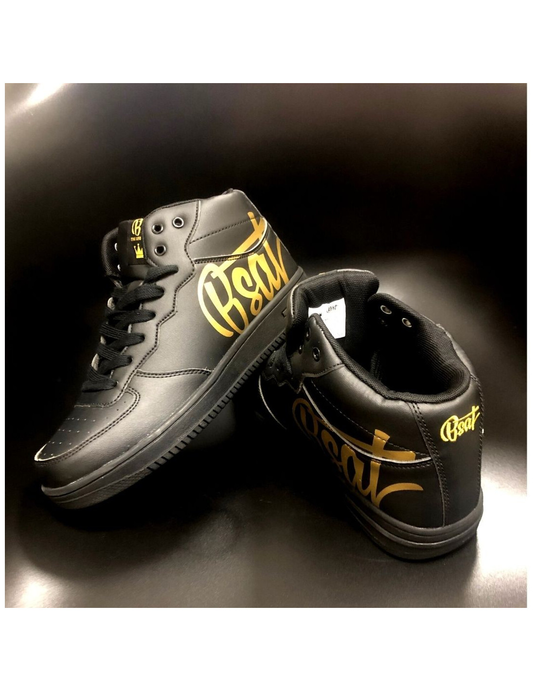 Sorte street logo Sneakers fra vores hiphop inspireret tøjmærke BSAT Clothing. Brand logoet er trykt i guld på både inder- og ydersiden af skoen. Bagpå er logoet broderet blæret i guld og skoen er forsynet med logo batch på tungen. Pimp skoenene yderligere med snørebånd i metallisk guld, som er vedlagte. Skoene er High Top Sneakers, produceret i solidt kunstlæder. Skoene er produceret til både mænd og kvinder.