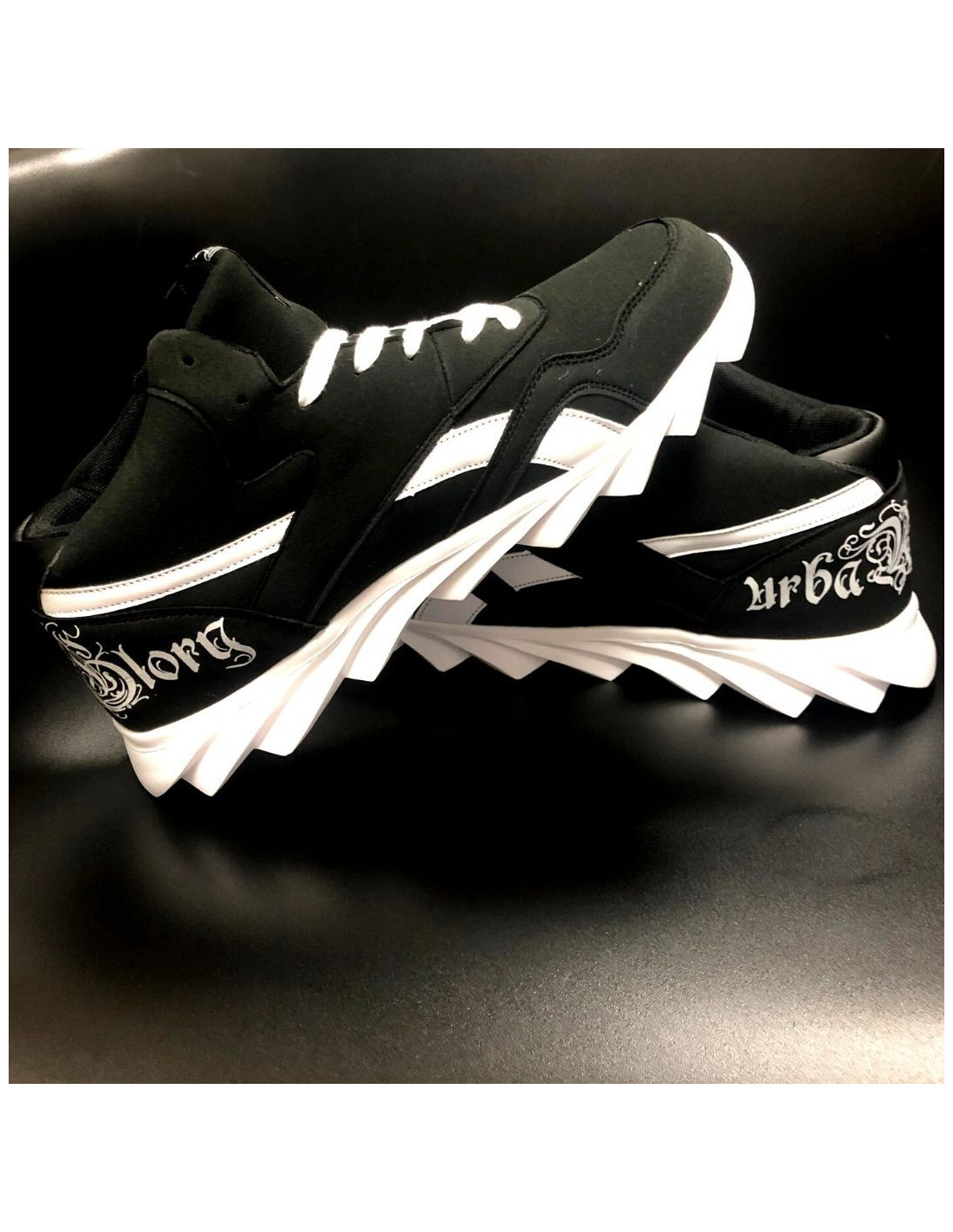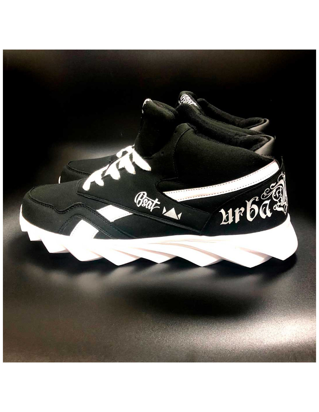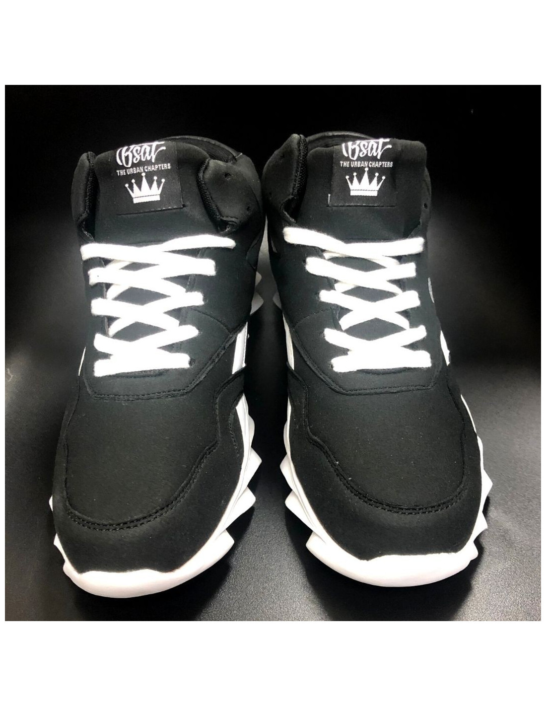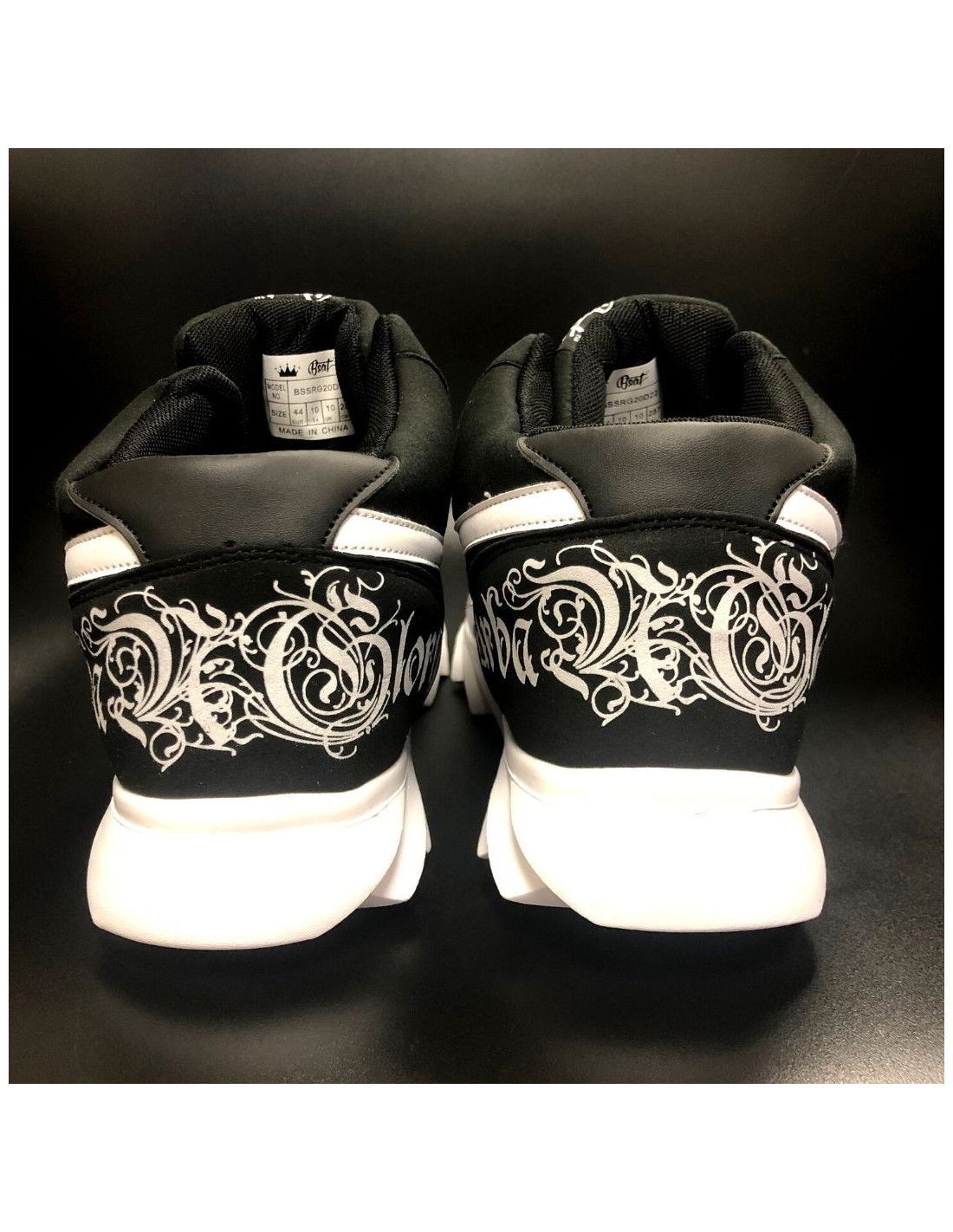 Stilede Race Sneakers. Fuld fart frem i et par top sporty street sneakers fra vores Urban Art & HipHop brandet BSAT. Skoene er sorte med hvide fartstriber på siderne. Selv den hvide sål har et mønster, som signalerer fart og bevægelse. Bag på skoen troner det smukke Urban Glory Artwork. Logo patch er placeret øverst på tungen. Skoene er produceret i letvægts kunstlæder (PU) og vi har designet dem til både kvinder og mænd..