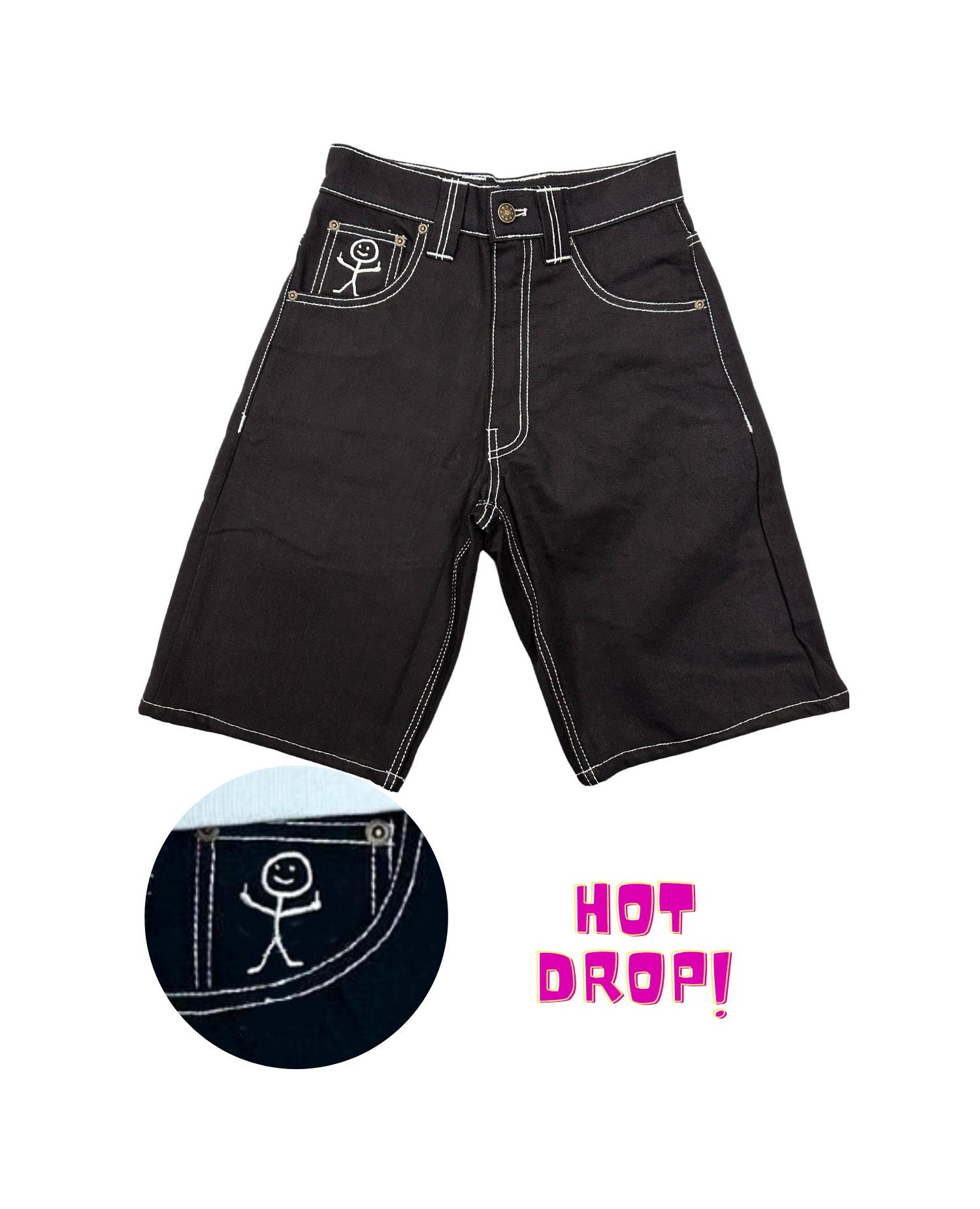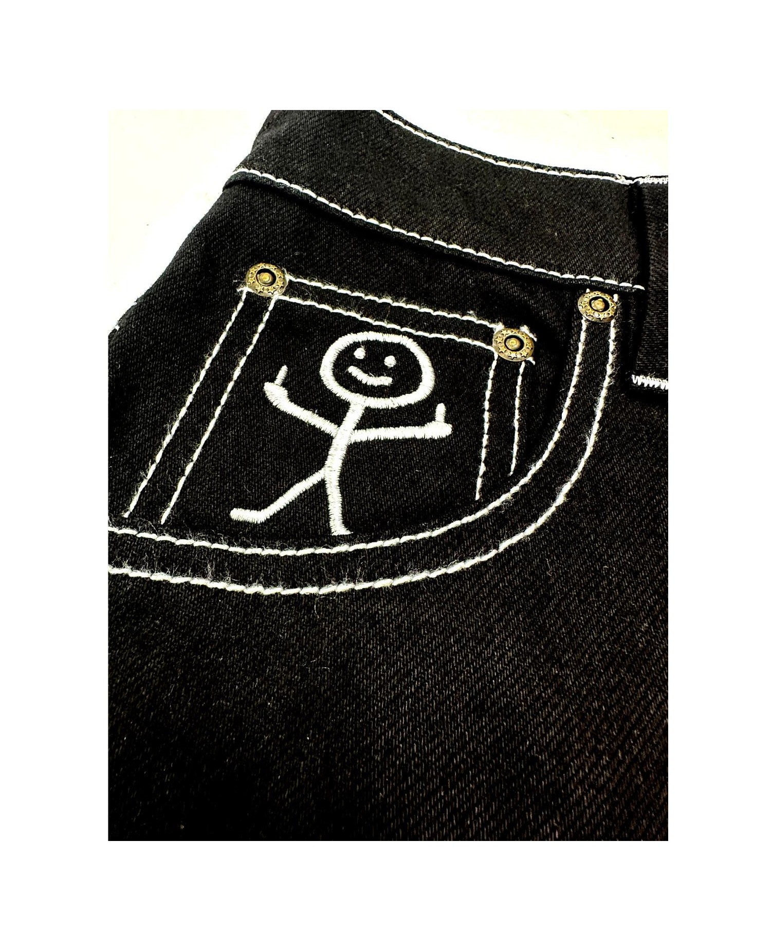 Stickman The Fingers Jorts is a design where the BSAT brand logo has been joined by a small figure who doesn't give a f*ck. The stick man figure reveals itself on the coin pocket in a white embroidery. Naughty and fun.