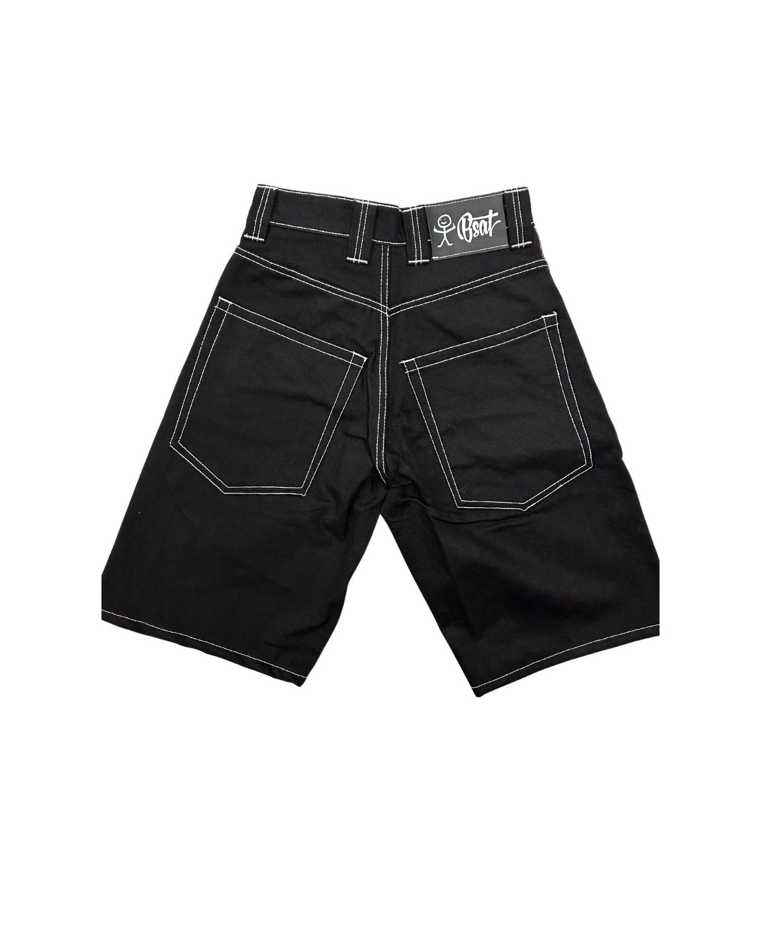 The cool Baggy Jorts are black, with wide belt loops that are clearly marked with white stitching like all other stitching.