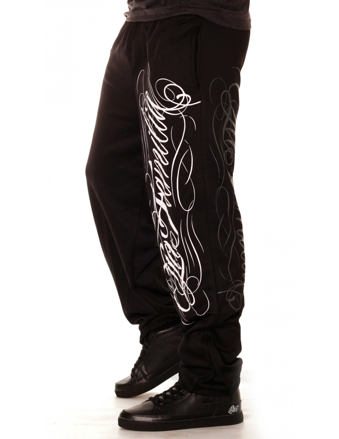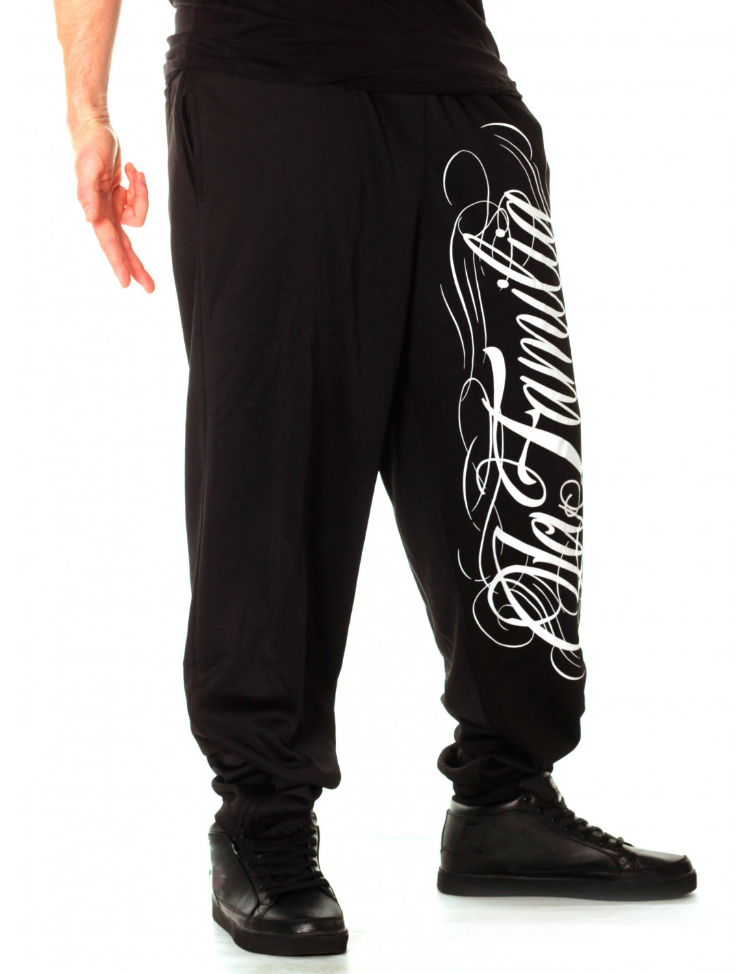 Stilede sorte Sweatpants fra hiphop brandet BSAT. LA FAMILIA designet er fra brandets Straight Outta Compton linje. De sorte Sweatpats har et stort hvidt håndtegnet LA Familia print på venstre ben. Printet gentages i en mere neddæmpet grå farve bagpå. På baglommen er placeret et lille brand logo batch. Designet er meget vellykket og stærkt. Det er rå skønhed og formidler et vitalt og smukt budskab. I RudeCru familien hylder vi også LA FAMILIA.