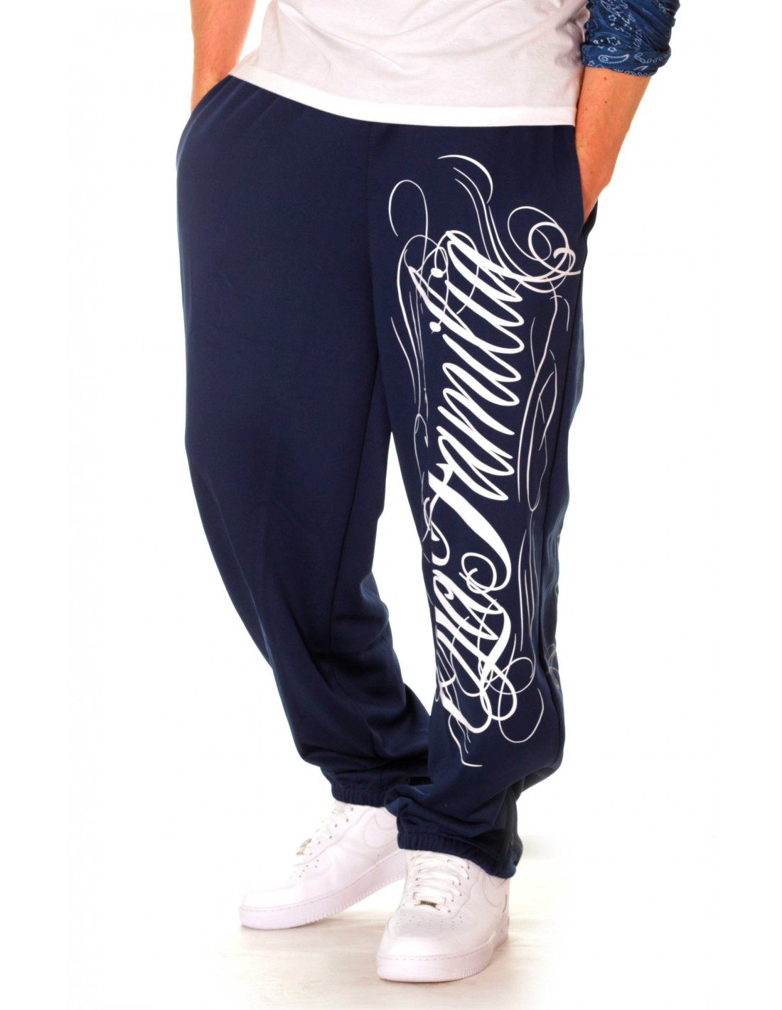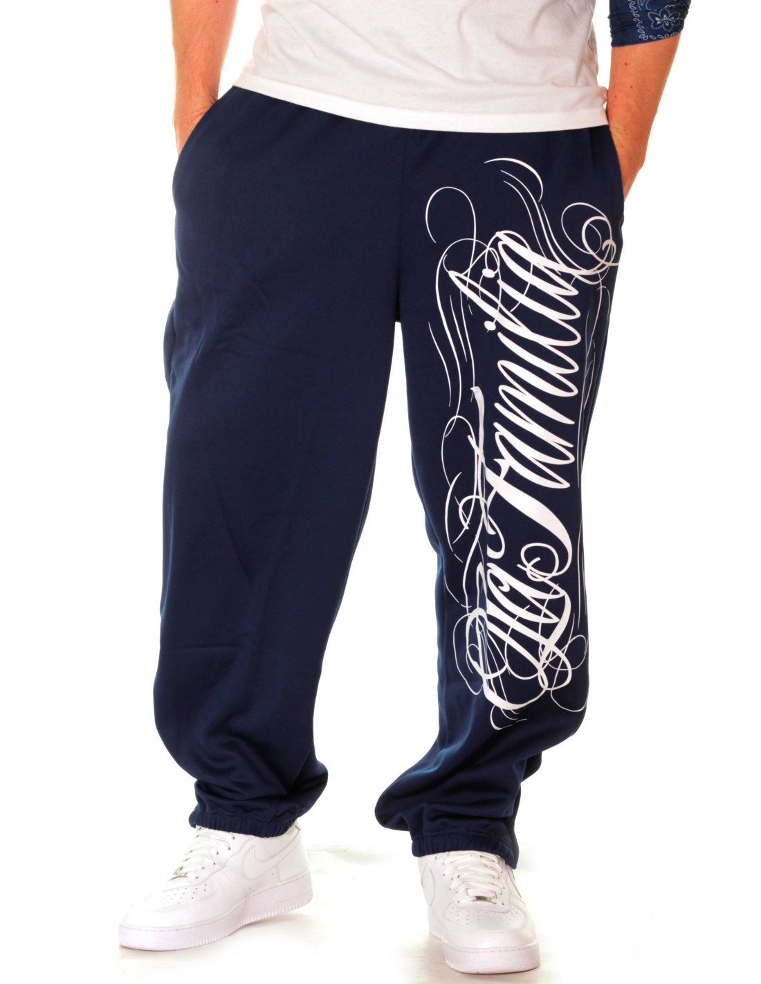 Stilede blå Sweatpants fra hiphop tøjmærket BSAT. LA FAMILIA designet er fra deres Straight Outta Compton linjen. De blå Sweatpats har et stort hvidt håndtegnet LA Familia print på venstre ben. Printet gentages i en mere neddæmpet grå farve bagpå. På baglommen er placeret et brand logo batch. Designet er meget vellykket og stærkt. Det er rå skønhed og formidler et vitalt og smukt budskab. I RudeCru familien hylder vi også LA FAMILIA. I La Familia serien findes også en blå ZipHoodie, en sort Tee, ZipHoodie, SweatPants og et par sorte Hi-Top Sneakers.
