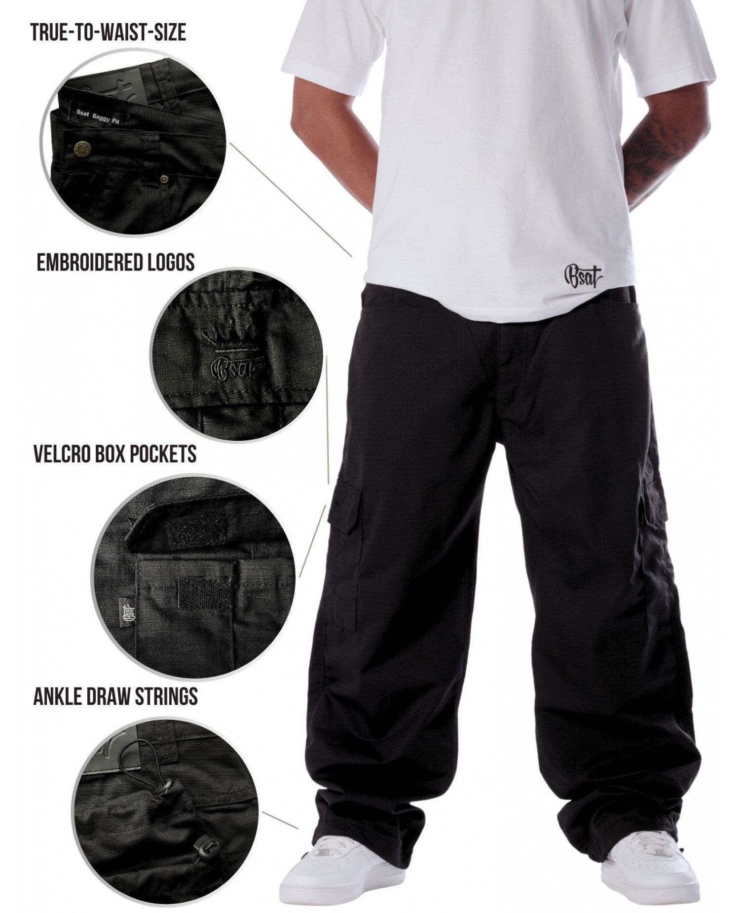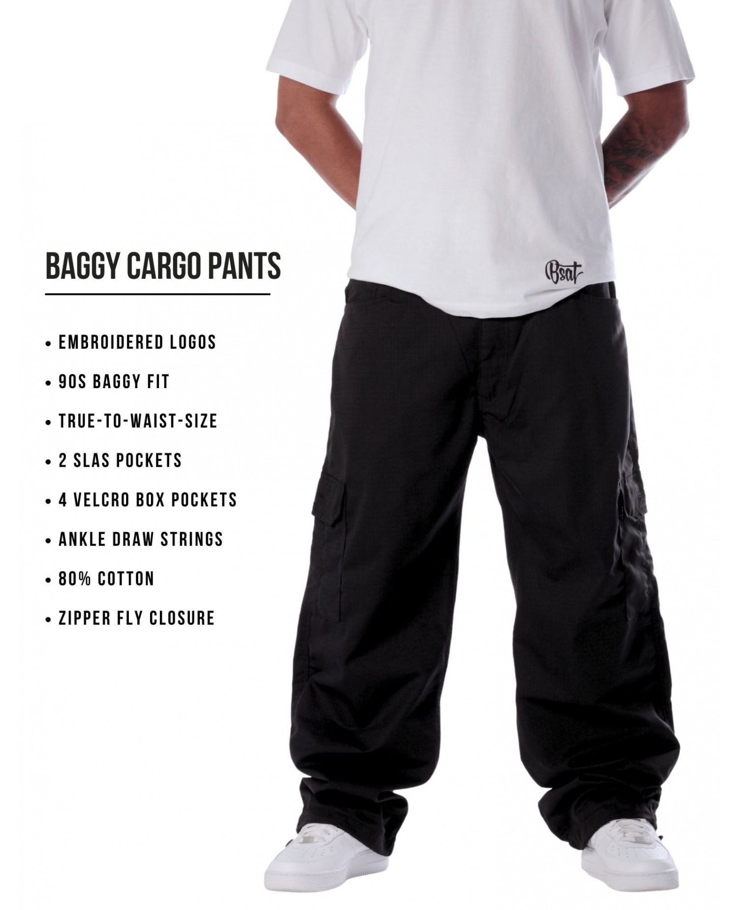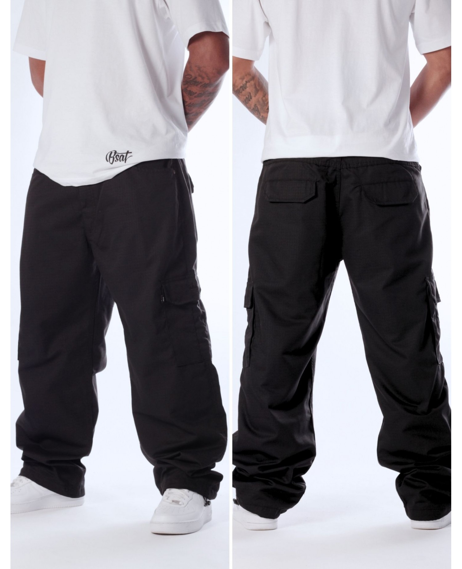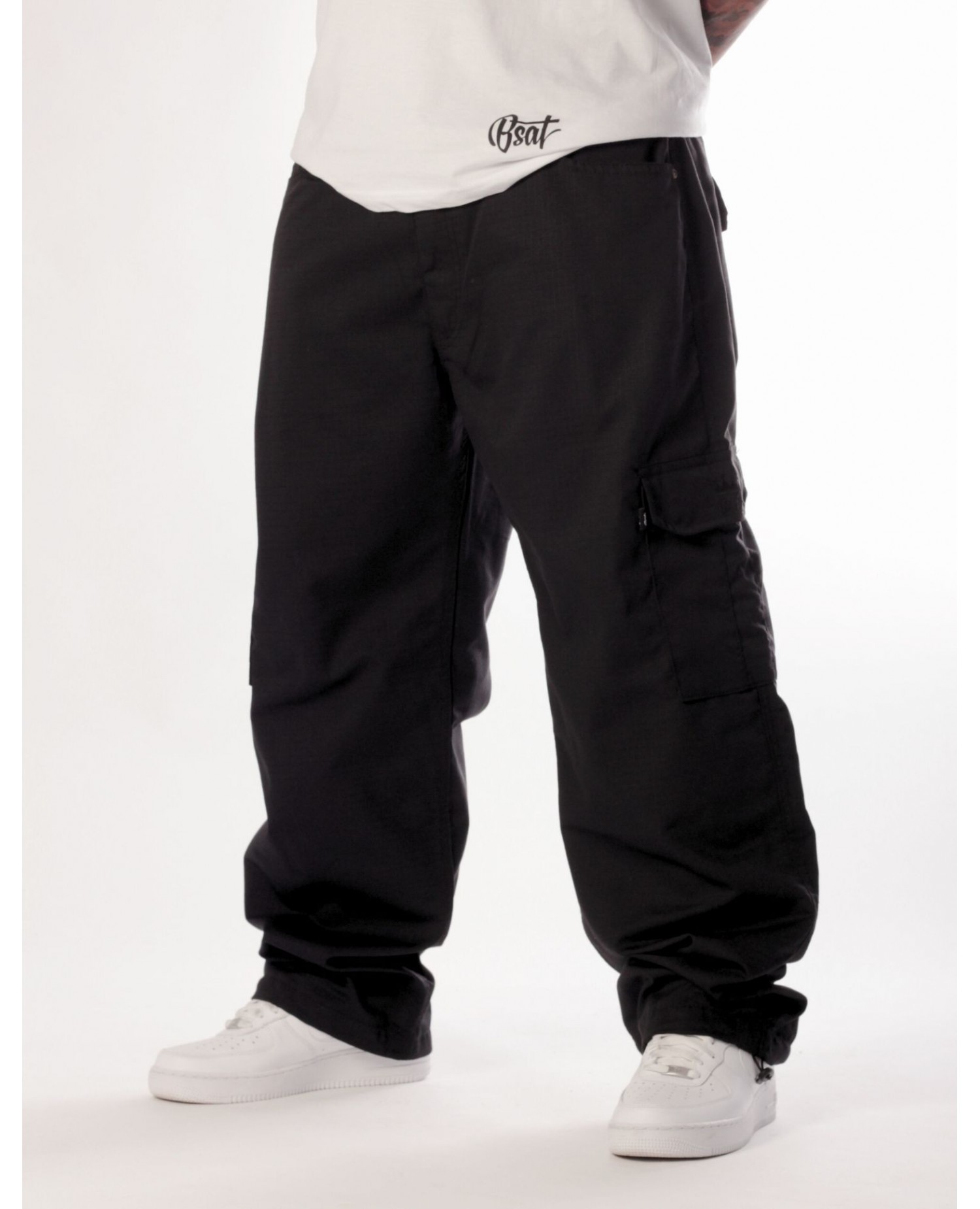 De sorte BSAT Combat Cargo Pants har en super god maskulin pasform og er helt perfekte til en sporty og street tøjstil. Combat bukserne passer perfekt til vilde T-Shirt designs og Hoodies eller til en minimalisisk streetwearstil uden print. Pantsene er behagelige at have på, lette, luftige og baggystreet.