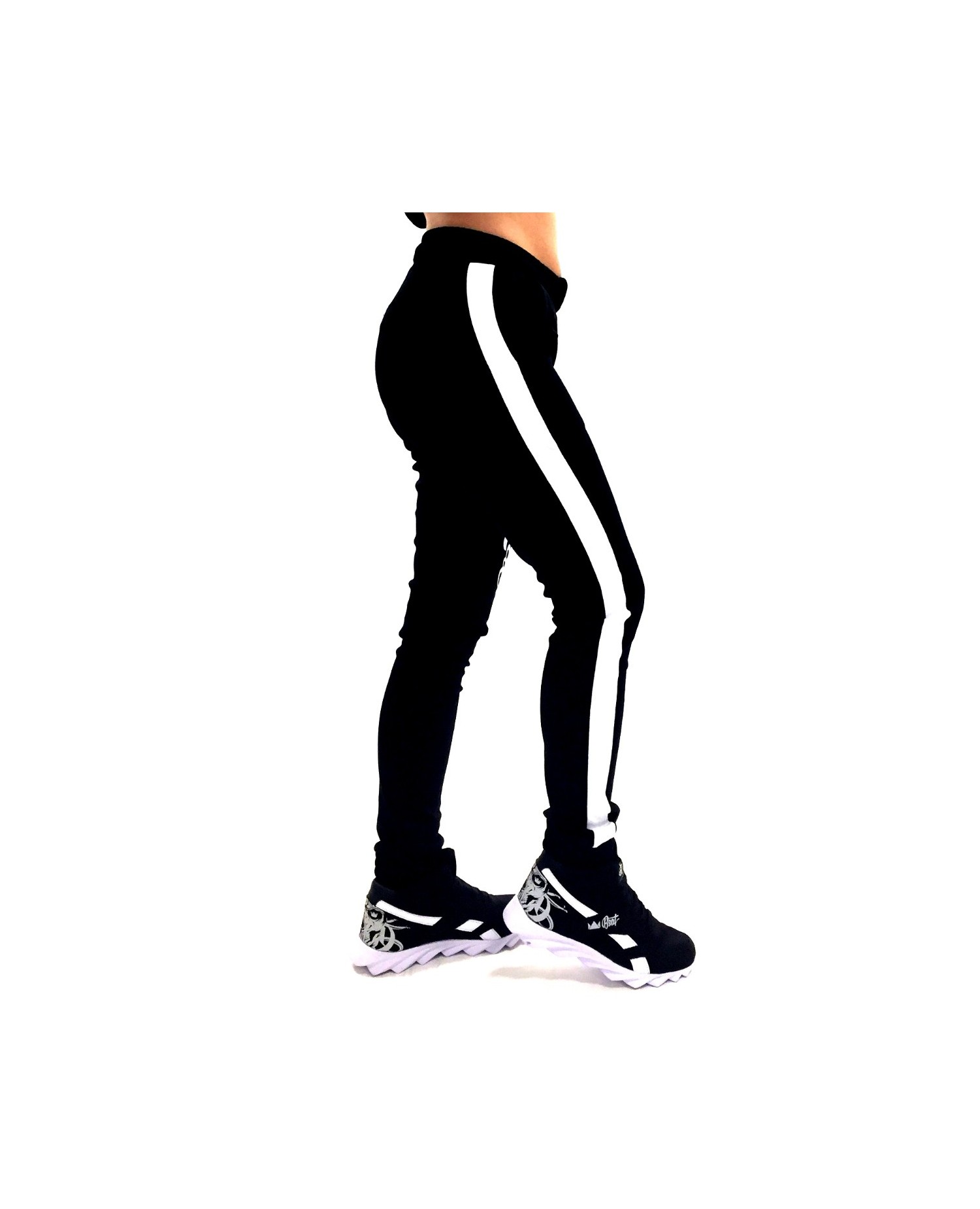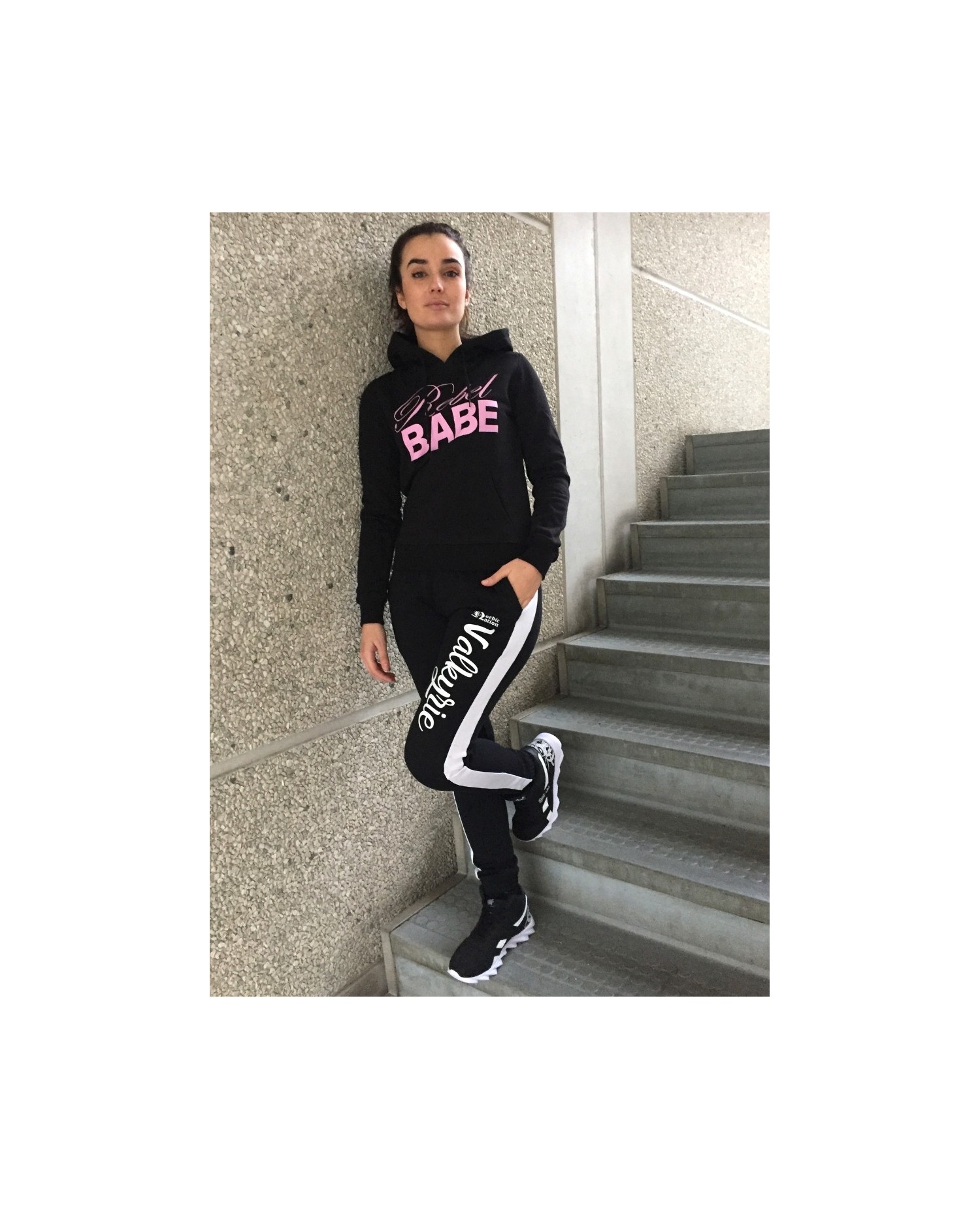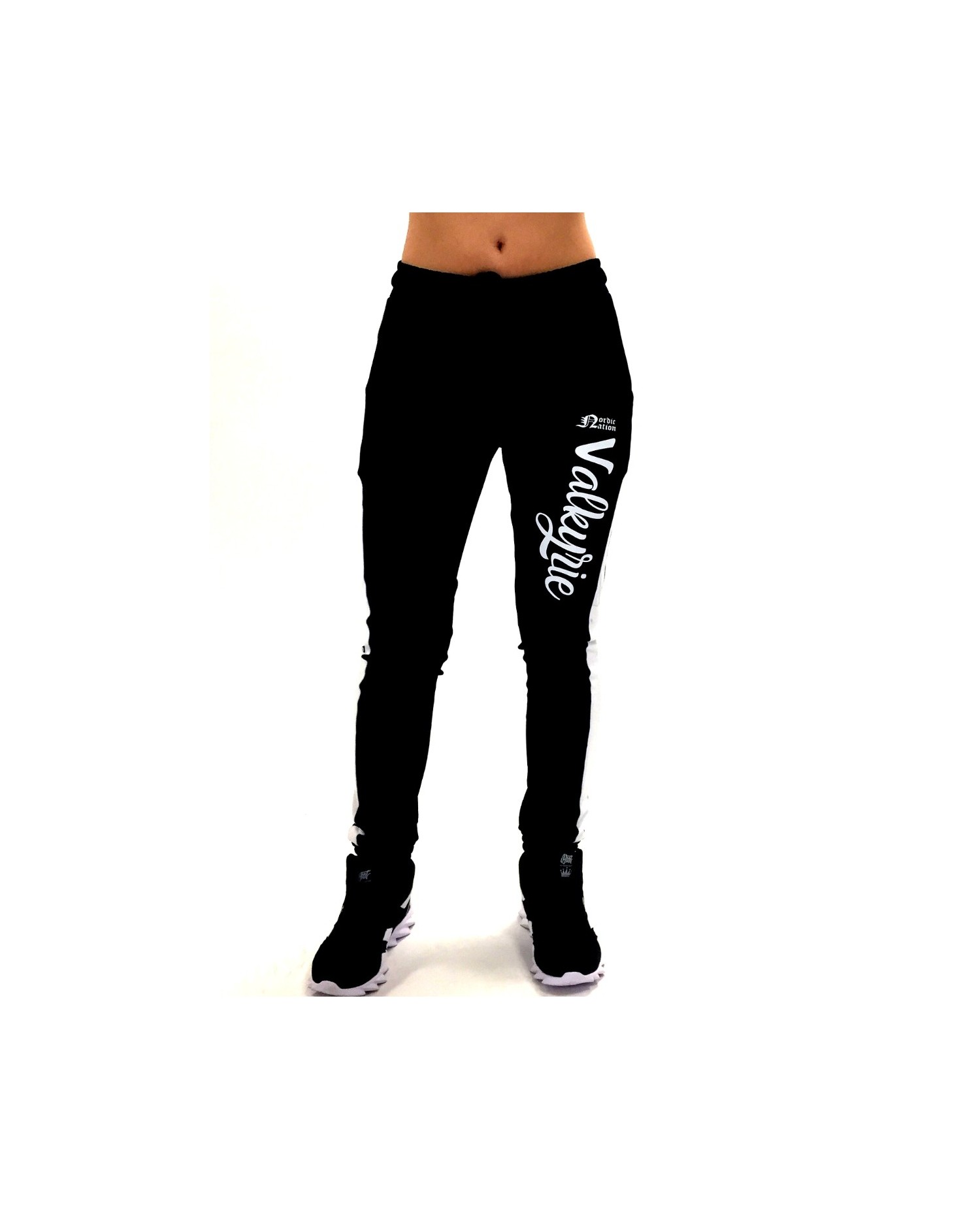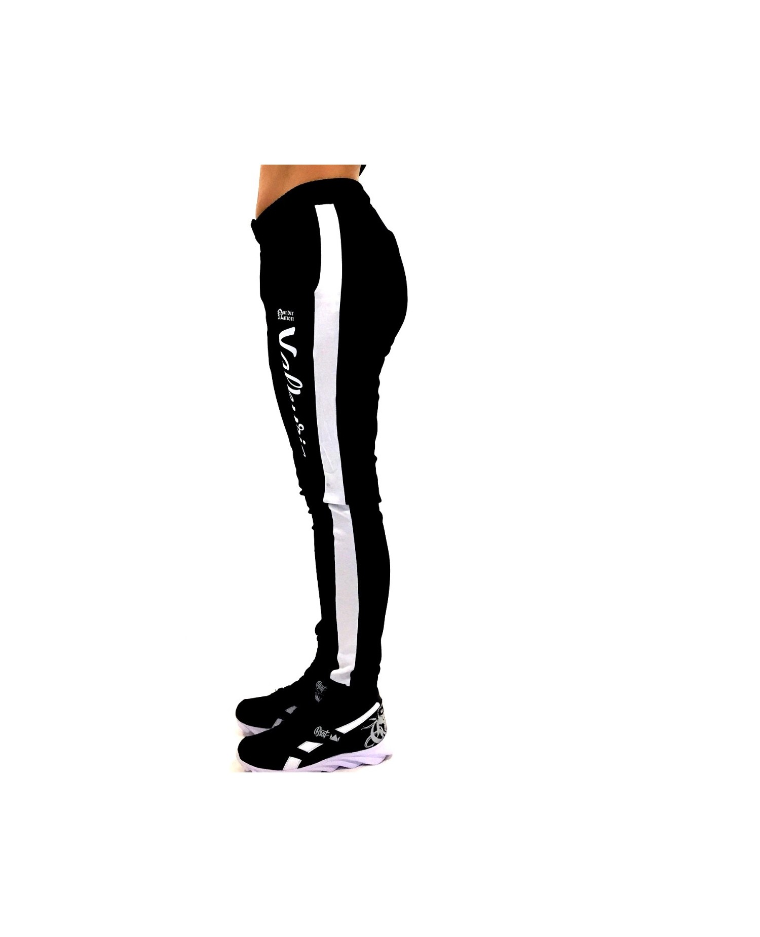 Lækre Valkyrie Joggers fra vores Vikinge Fashion Brand Nordic Worlds. Valkyrie er skrevet med kunstnerisk hvid skrift på venstre ben, mens 2 Vegvisir symboler, tegnet af Dimon Taturin er placeret bag på læggene. Valkyrie bukserne har sporty hvide striber nedaf begge ben. Valkyrie pantsene passer perfekt ind i RudeCrus RebelBabe departement for smukke, stærke og eventyrlige kvinder.
