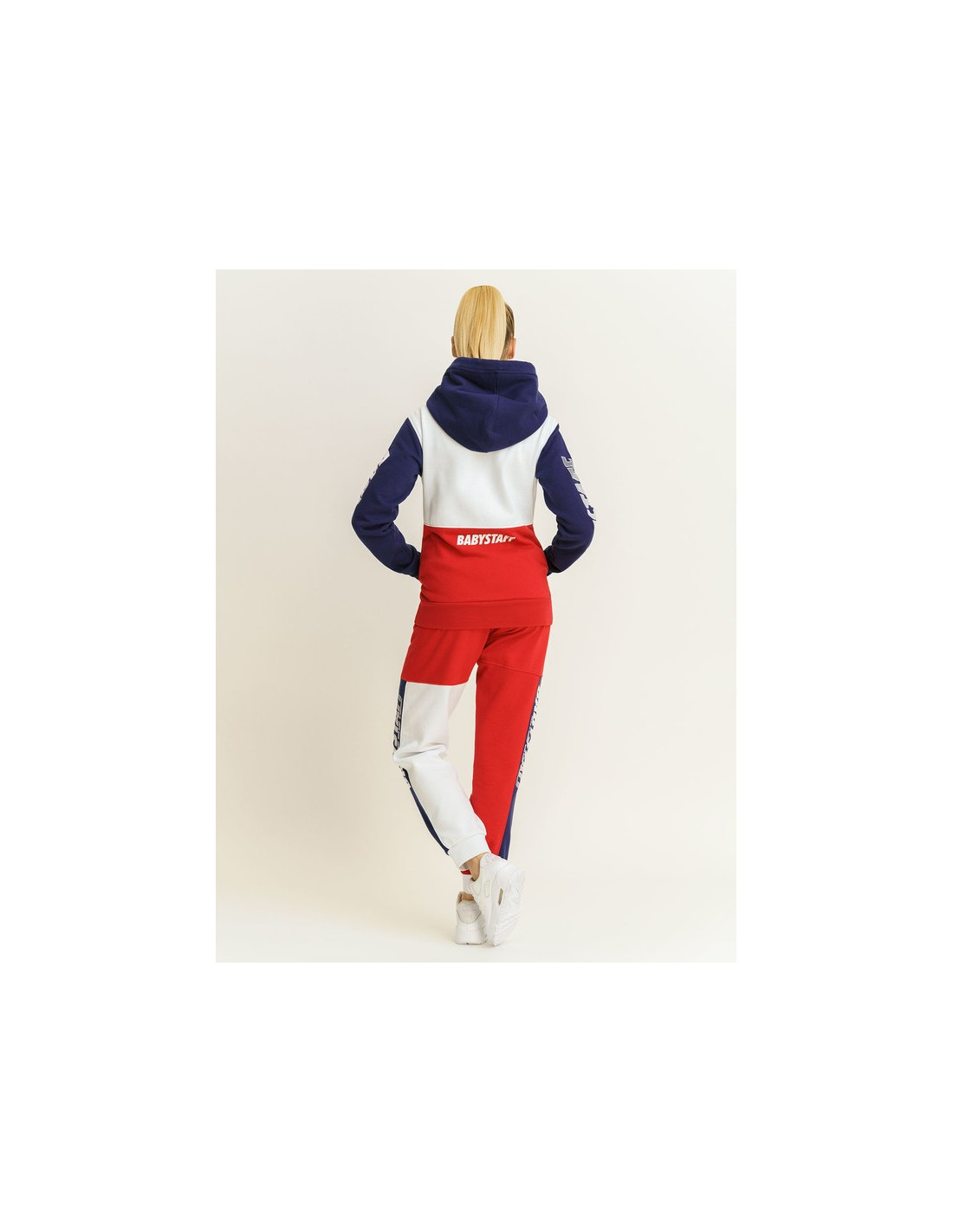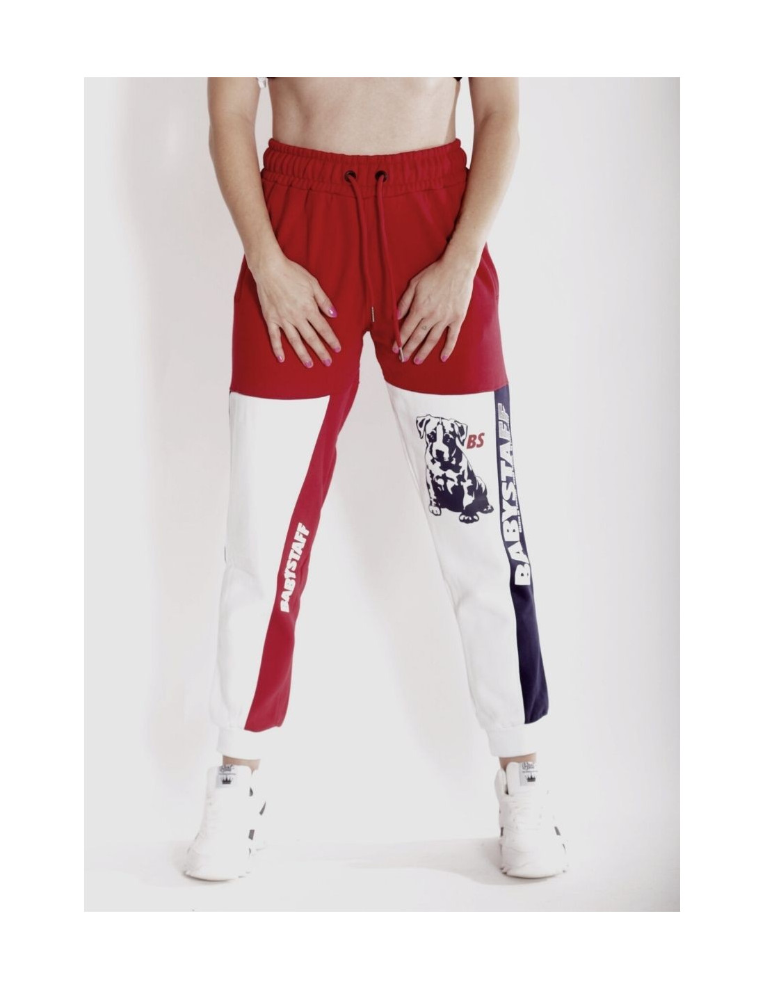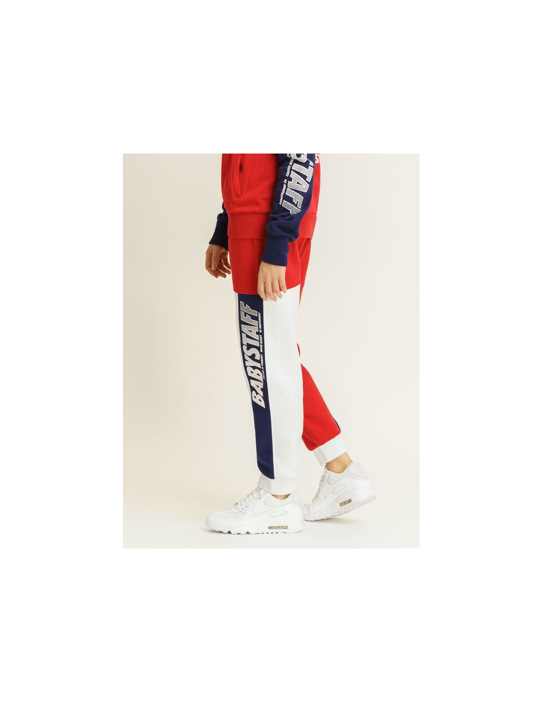 Super coole Sweatpants fra Babystaff i hvid, blå og rød. Den søde lille BrandLogo Puppy er placeret forpå. Bukserne er produceret i 80% bomuld og 20% polyester.