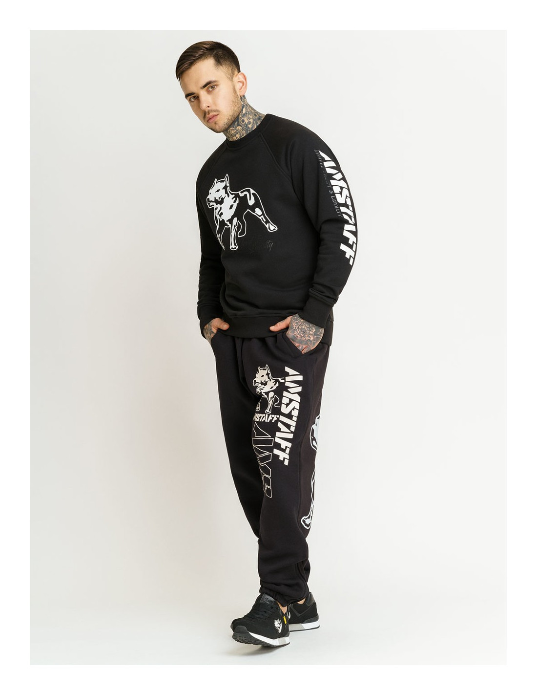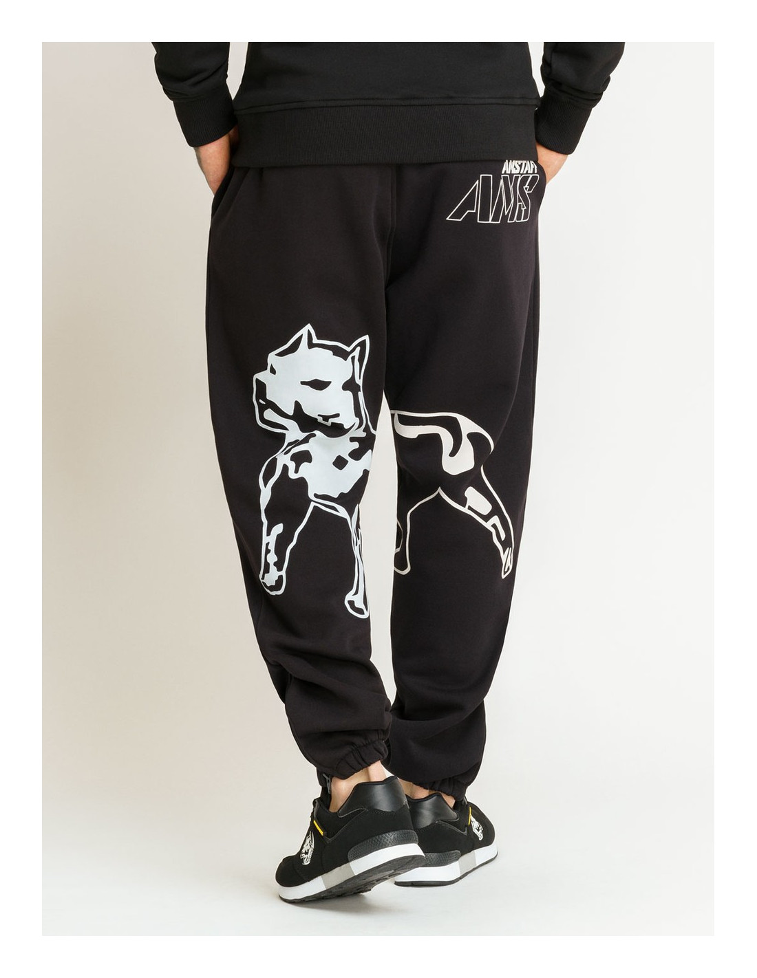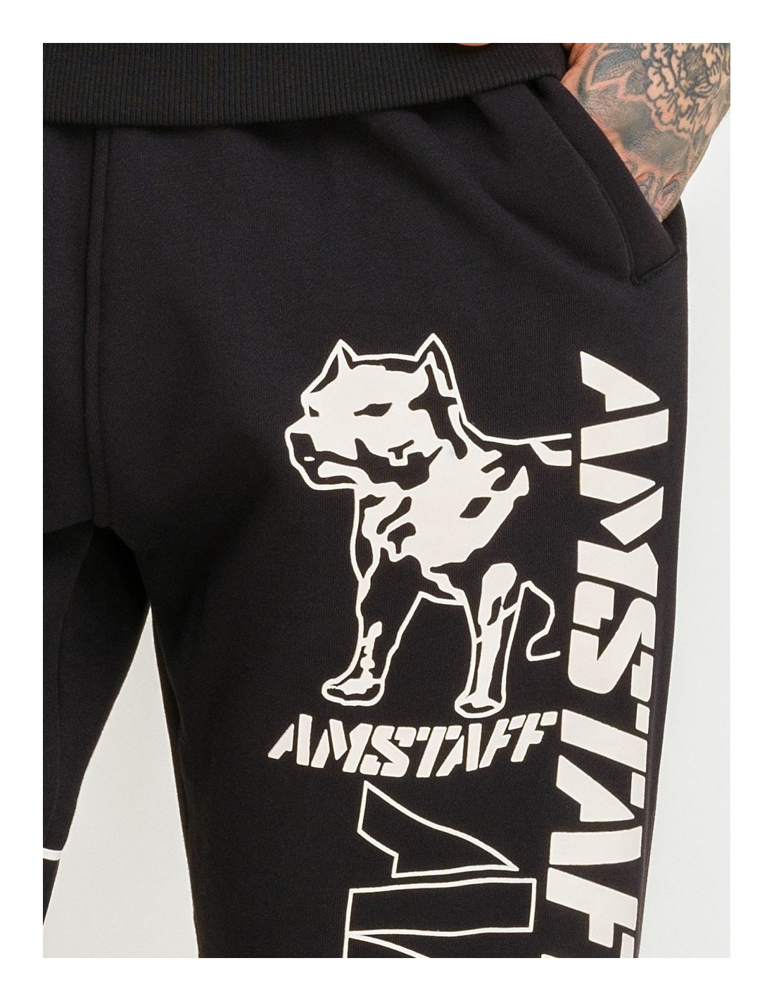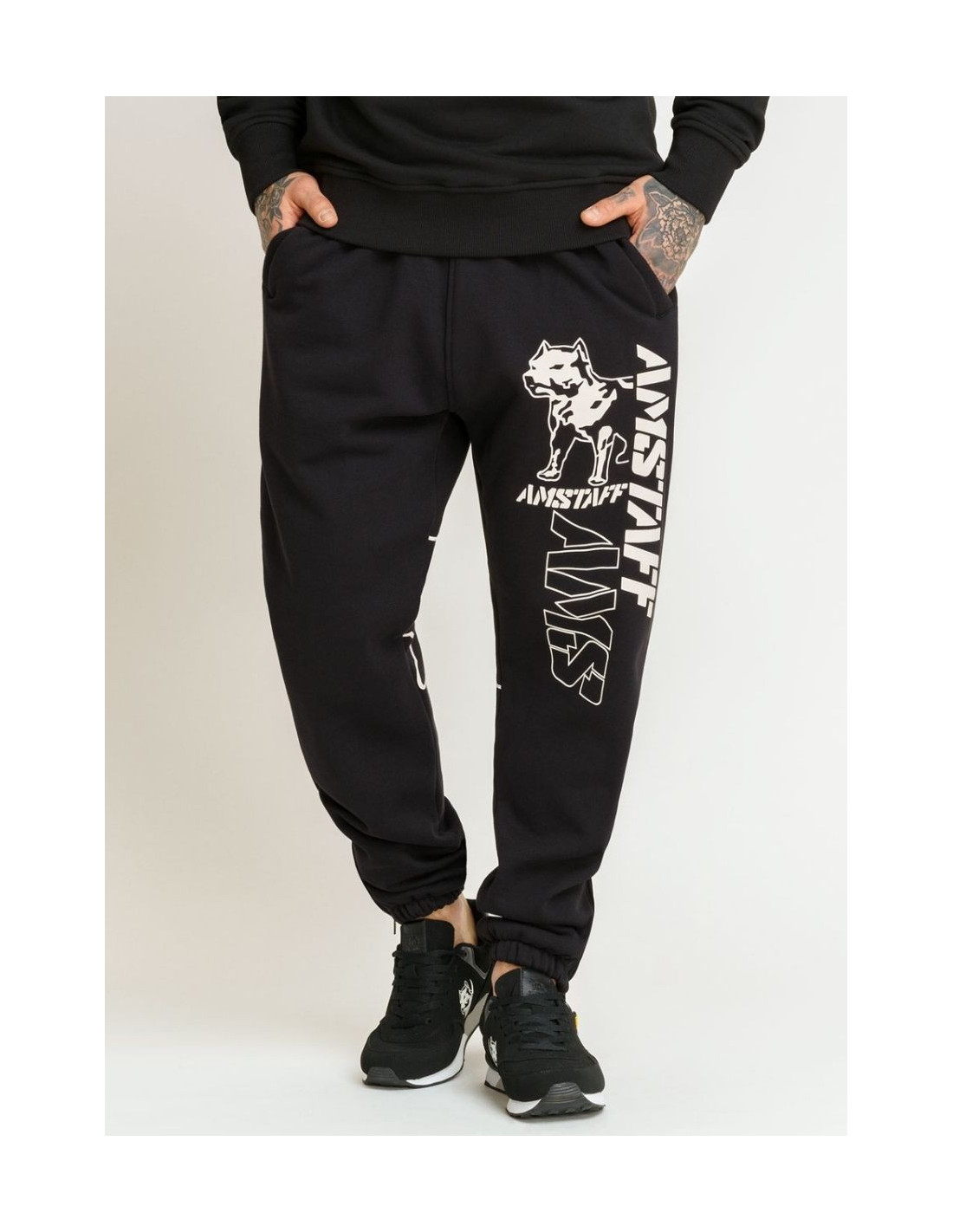 Sorte seje Sweatpants fra Amstaff Wear med Amstaff hund og logo flot brandet i hvidt. Sweapantsene har sidelommer og en praktisk baglomme med lynlås. Sweatpantsene er produceret i 80% bomuld og 20% polyester.