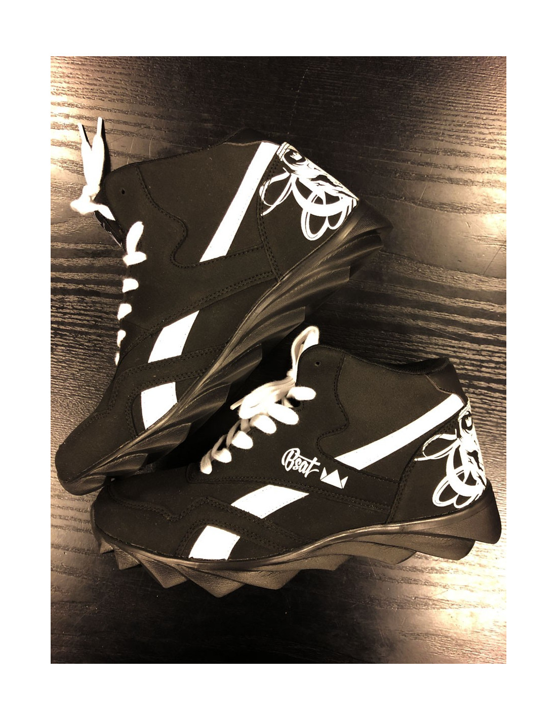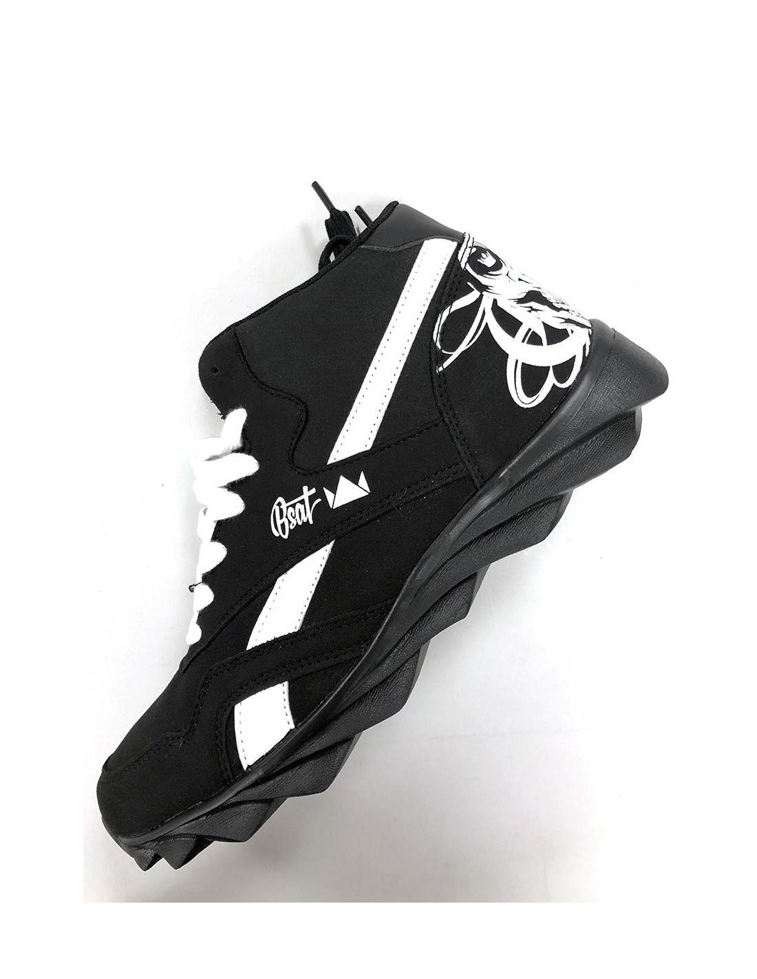 Skull Race Sneakers. Fuld fart frem i et par top sporty street sneakers fra Urban Art & RebelFashion brandet BSAT. Skoene er sorte med hvide fartstriber og sorte snørebånd. Selv den sorte sål har et mønster, som signalerer fart og bevægelse. Bag på skoen har det vilde brandlogo Skull en fest. Skoene er produceret i kunstlæder (PU) og er designet til både kvinder og mænd.
