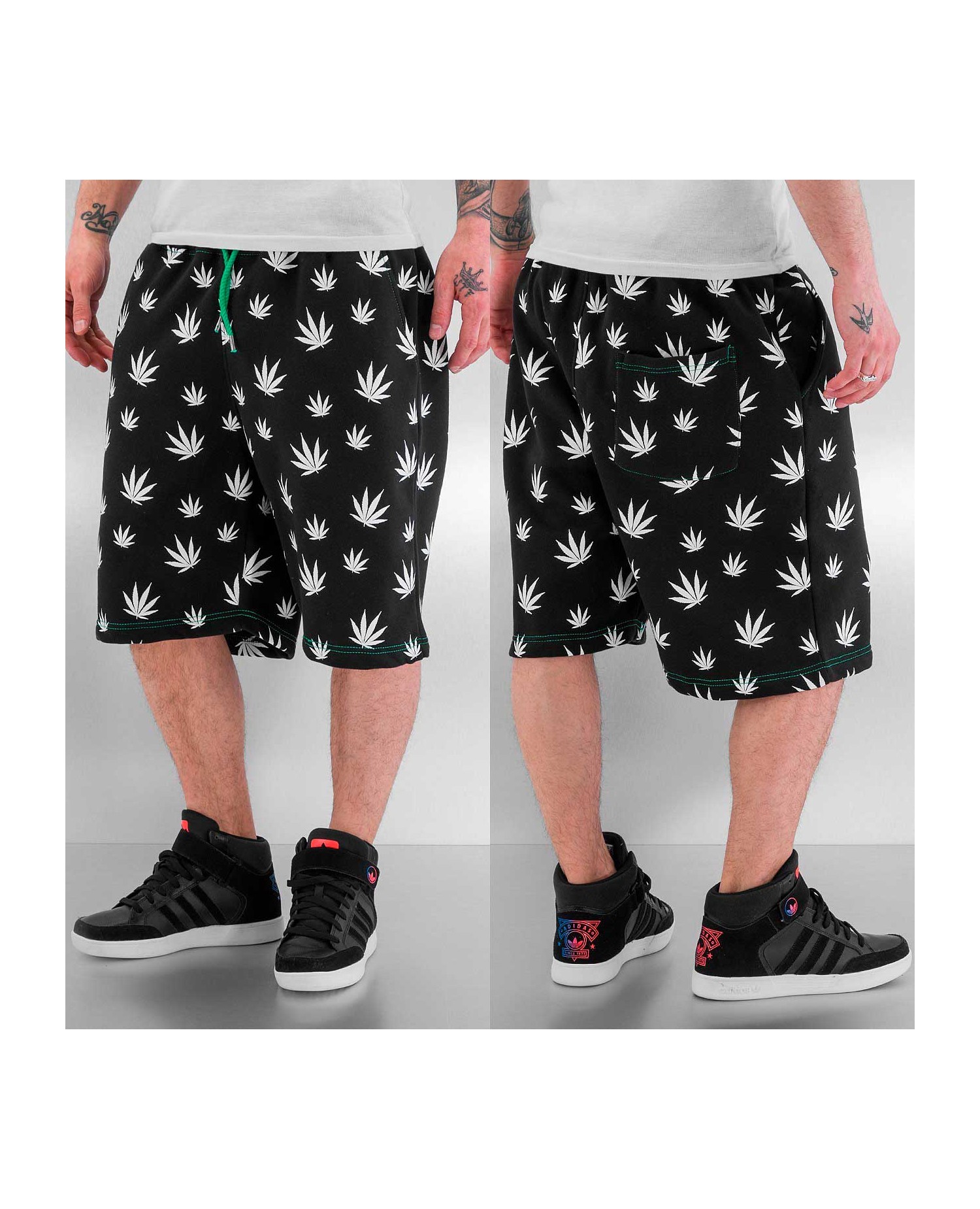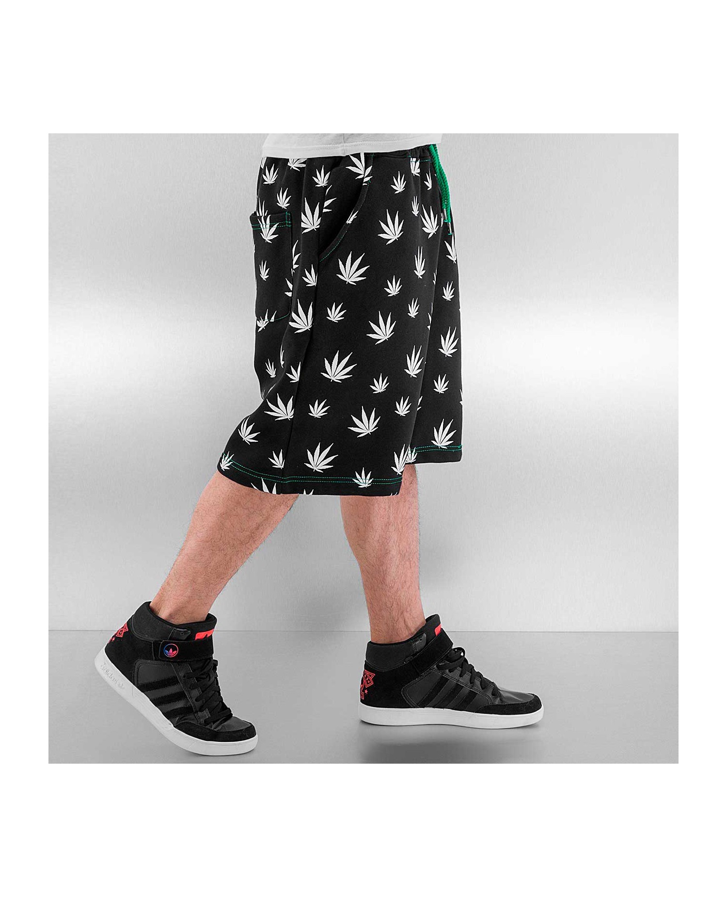 Baggy sorte shorts med hvide hampplanter all-over fra Just Rhyse.