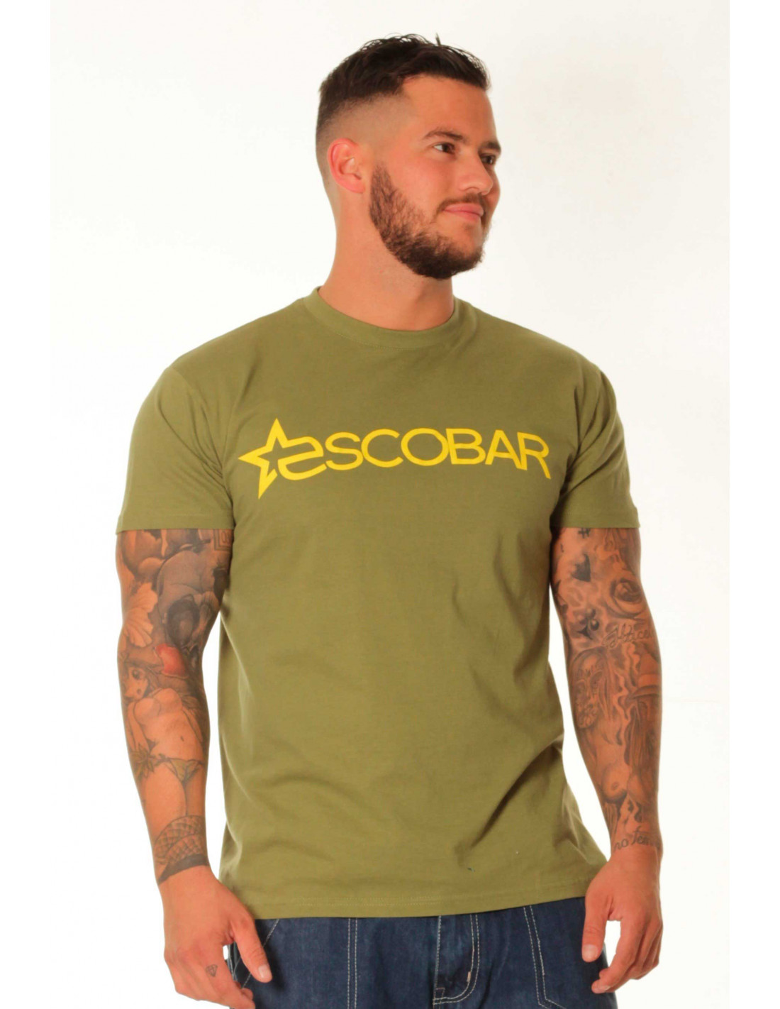 Cool olivenfarvet Escobar T-Shirt med gult logoprint p forsiden.