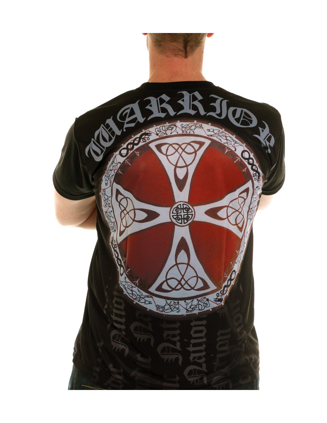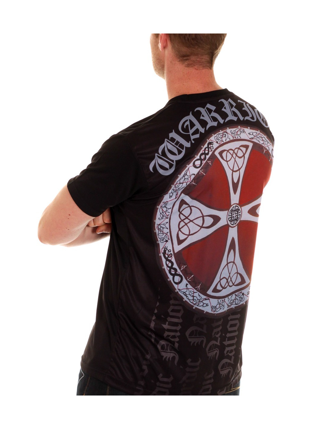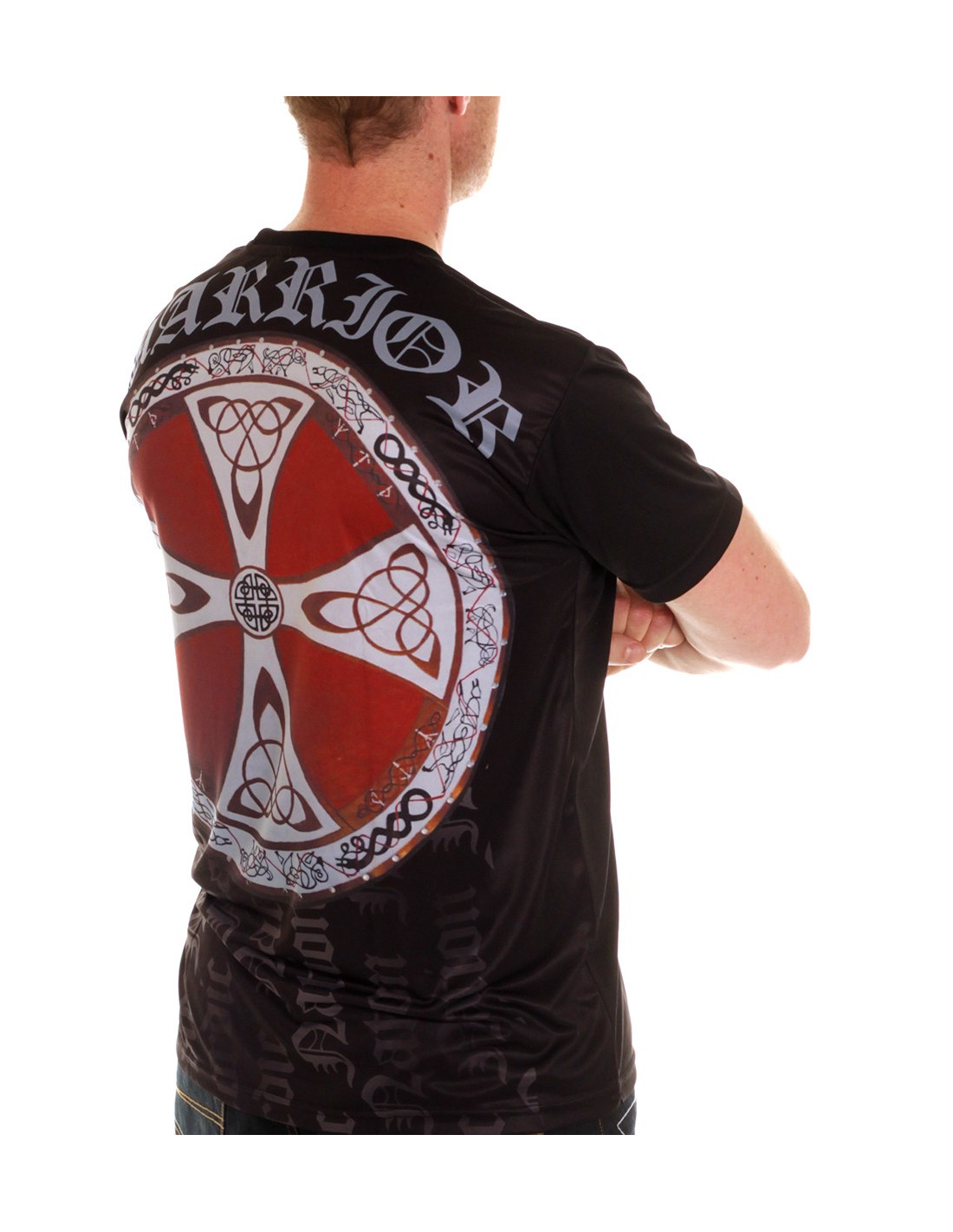 Warrior Shield designet er endnu et vildt fascinerende design fra tøjmærket Nordic Worlds. Vikinge Skjoldet troner på hele ryggen og har et bevidst slidt mønster i rødlige, brune og kobberagtige farver. På brystet er broderet et sort brandlogo. Designet spejler perfekt Brandets DNA. Nordic Worlds er nemlig et tøjmærke, som rykker den maskuline urkraft fra vikingetiden ind i moderne trendy designs. Brandet anvender ligeledes keltiske symboler og elementer fra Nordisk Mytologi i deres designs. Warrior Shield T-Shirten er maskulin, stærk og sporty. T-Shirten er fremstillet i et cool og ultralet polyester materiale, som minder meget om det, de fleste kender fra sportswear.