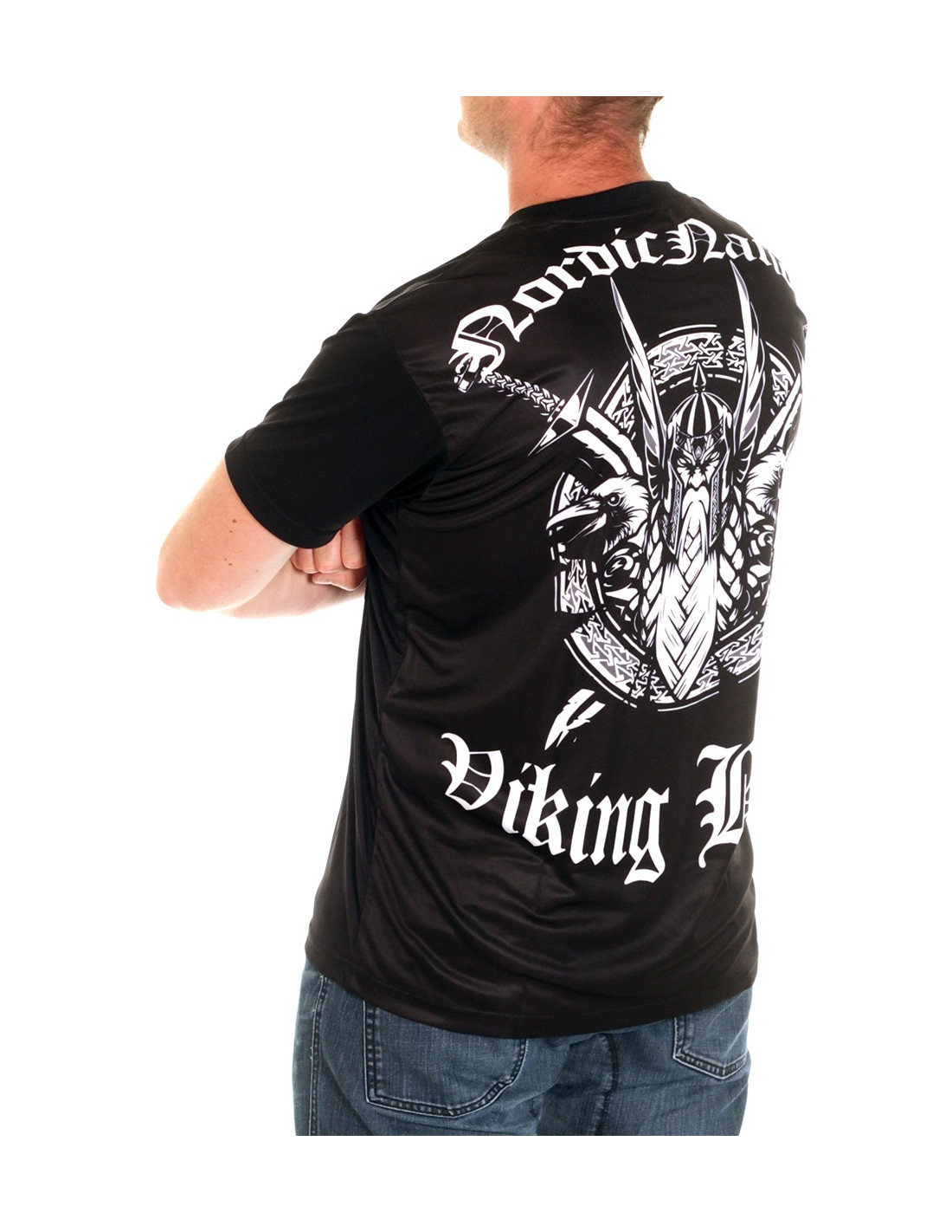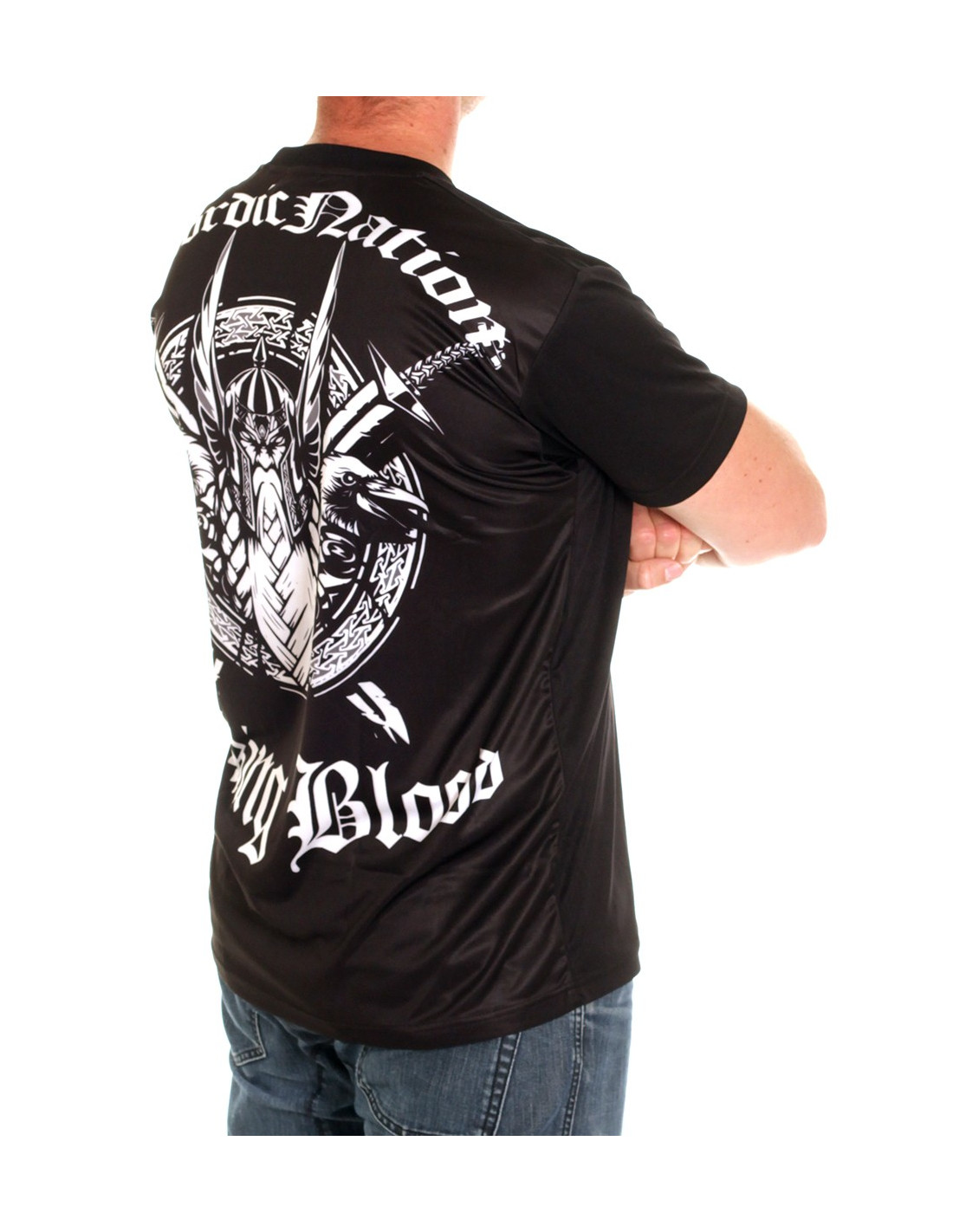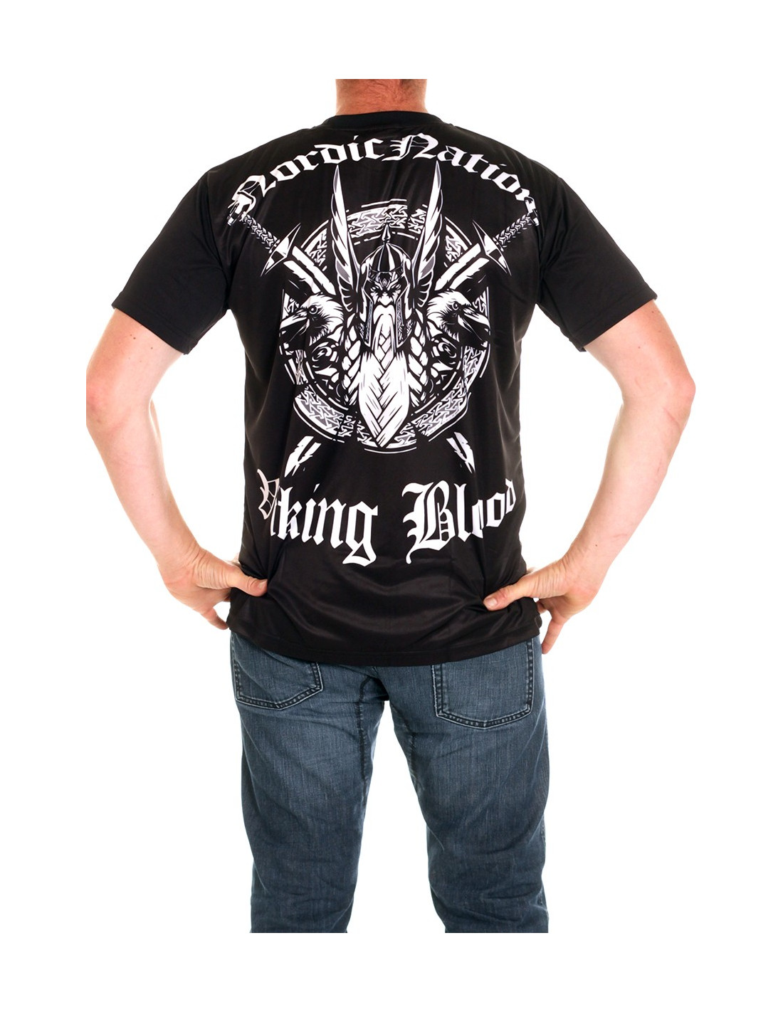 Viking Blood T-Shirten fra Nordic Worlds har et stærkt rygdesign med Odin og ravne, inspireret af den nordisk Mytologi. På brystet er broderet et hvidt brandlogo. Designet spejler perfekt Brandets DNA. Nordic Worlds er nemlig et tøjmærke, som rykker den maskuline urkraft fra vikingetiden ind i moderne trendy designs. Viking Blood T-Shirten er maskulin, stærk og sporty. T-Shirtens pasform er customfit og den er fremstillet i et cool og ultralet polyester materiale, som minder meget om det, de fleste kender fra sportswear.