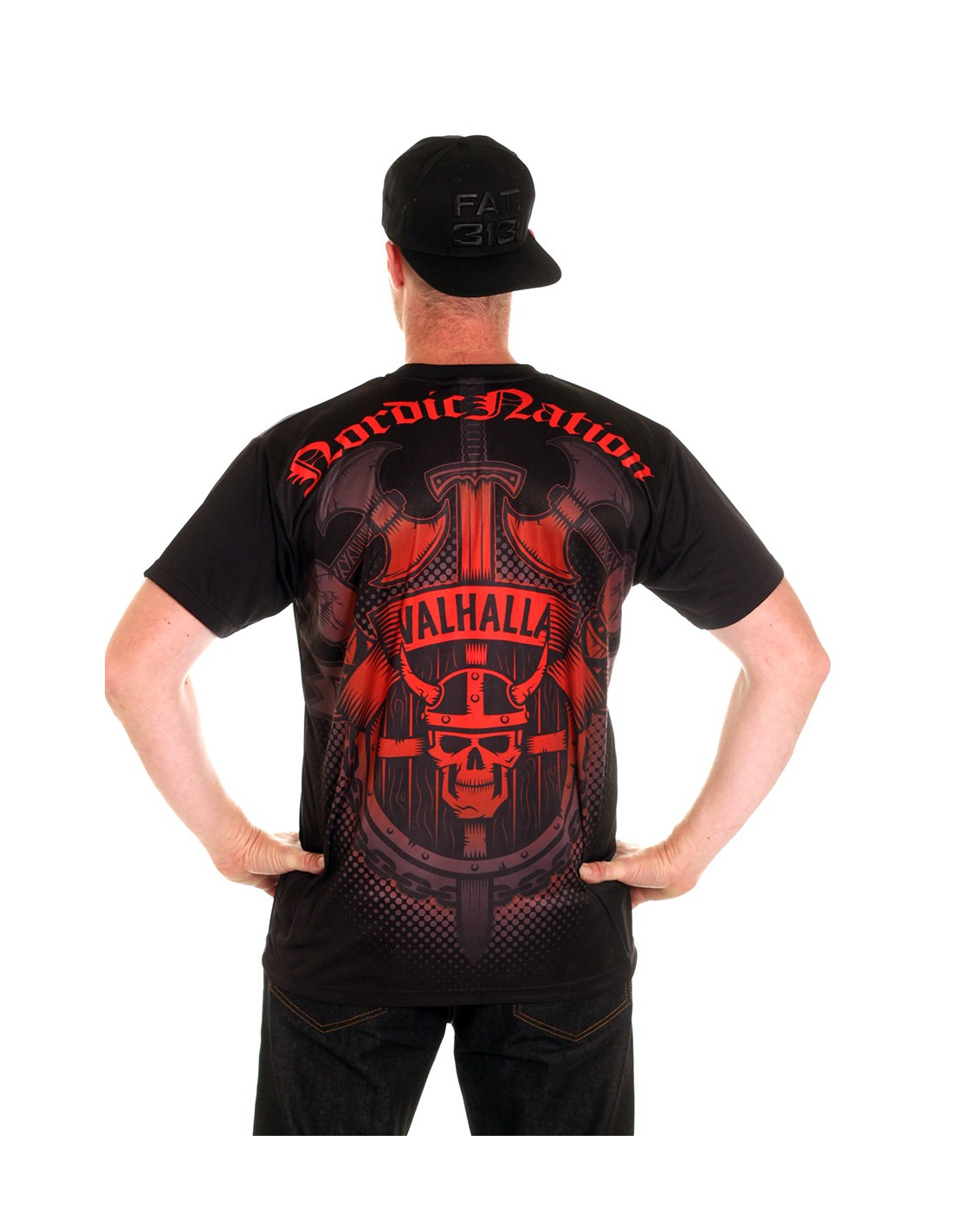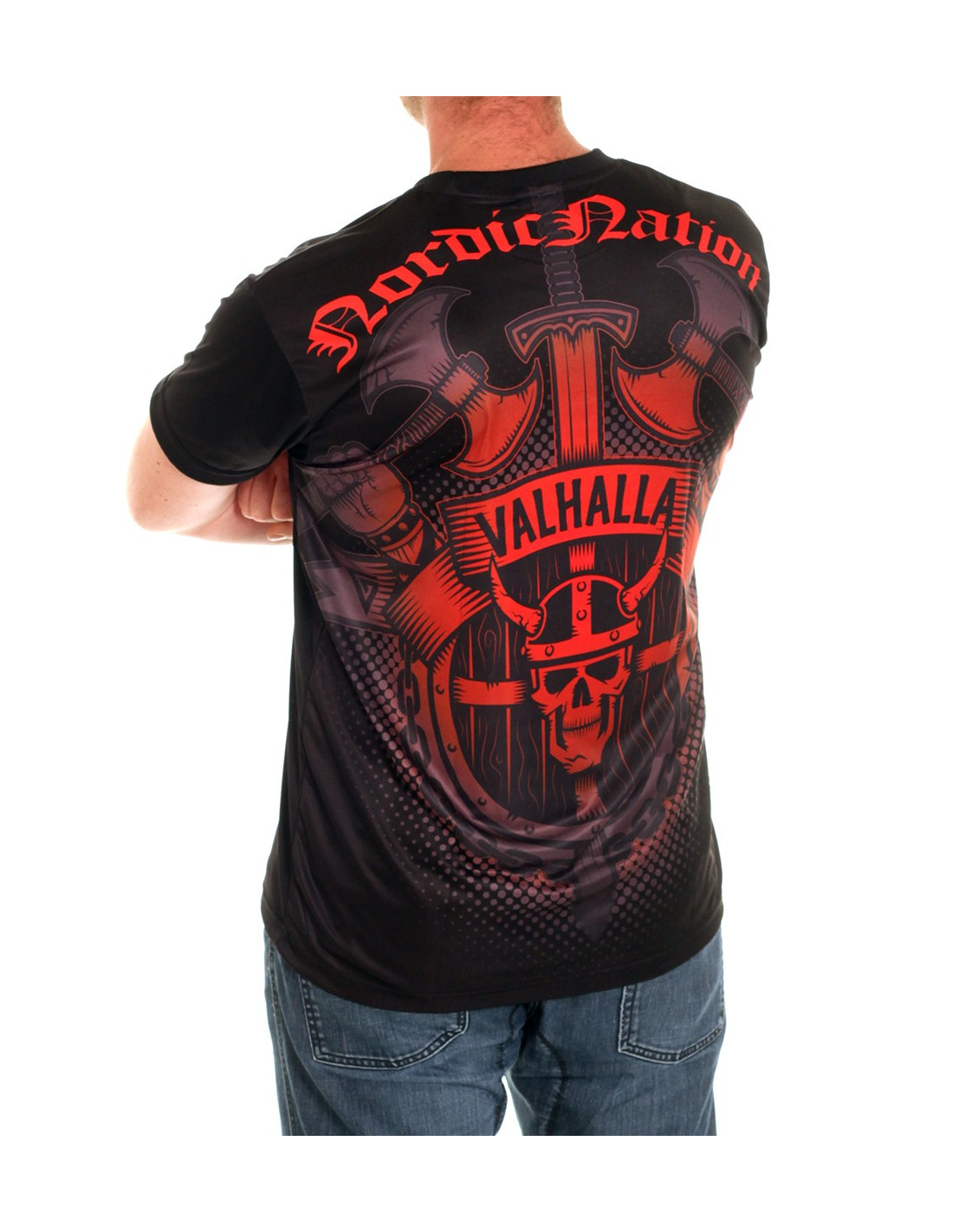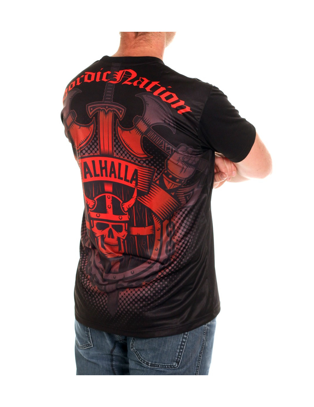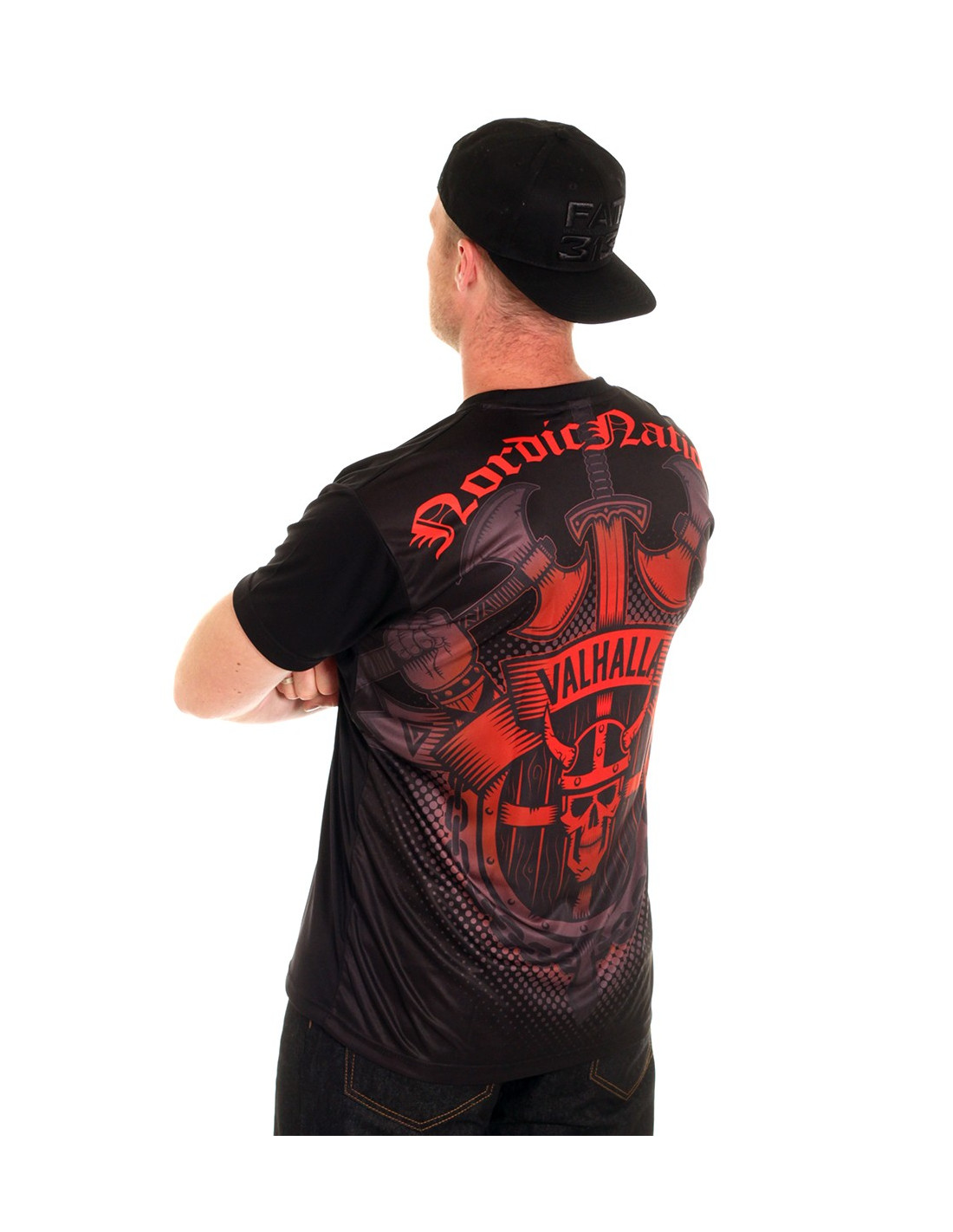 Valhalla T-Shirten fra Nordic Worlds har et stærkt rygdesign, inspireret af Nordisk Mytologi. På brystet er broderet et rødt brandlogo. Designet fremhæver en maskulin kropsbygning og spejler perfekt Brandets DNA. Nordic Worlds er nemlig et tøjmærke, som rykker den maskuline urkraft fra vikingetiden ind i moderne trendy designs. Valhalla T-Shirten er maskulin, stærk og sporty. Pasformen er customfit og den er fremstillet i et cool og ultralet polyester materiale, som minder meget om det, de fleste kender fra sportswear.