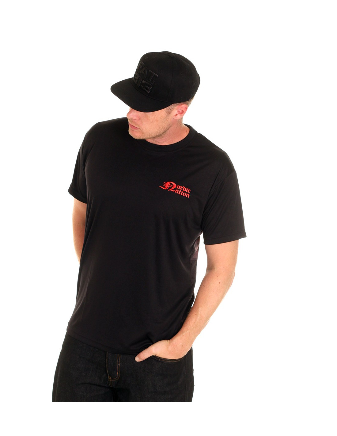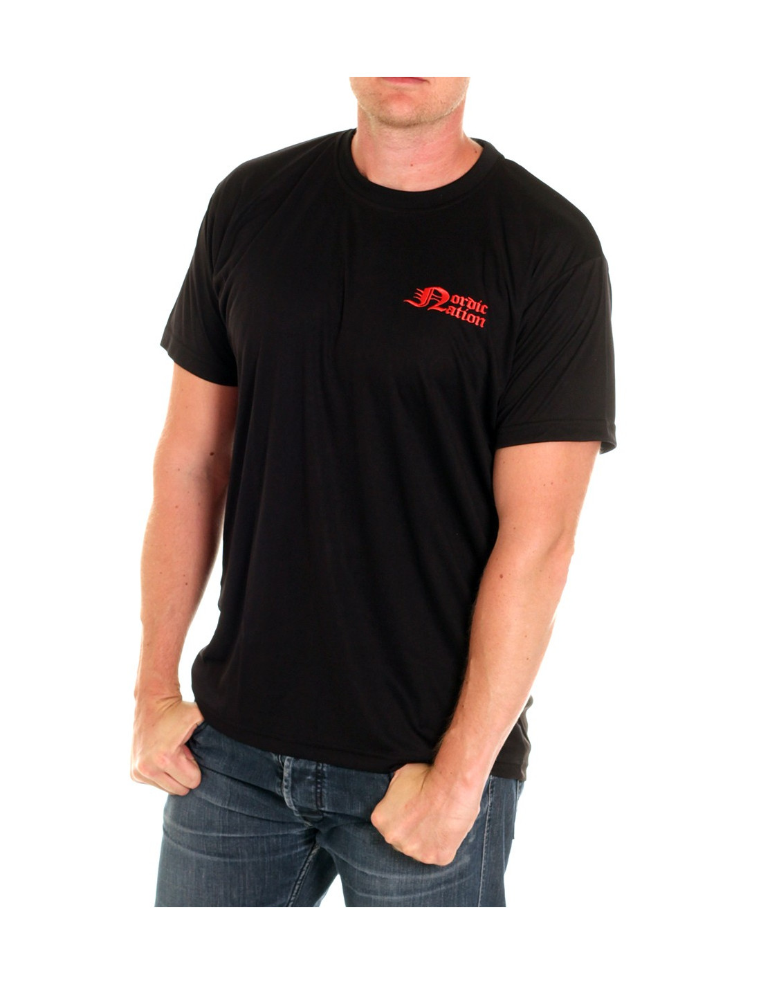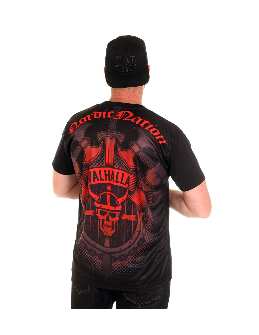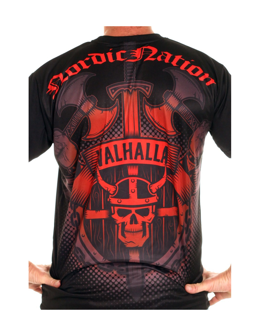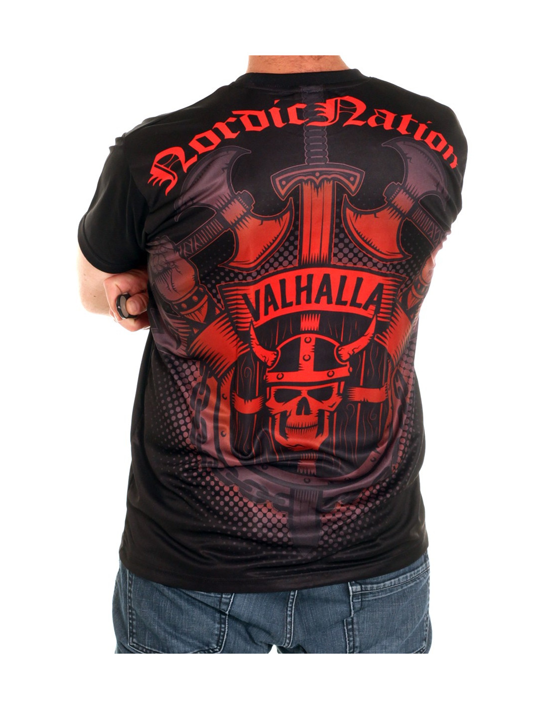 Valhalla T-Shirten fra Nordic Worlds har et stærkt rygdesign, inspireret af Nordisk Mytologi. På brystet er broderet et rødt brandlogo. Designet fremhæver en maskulin kropsbygning og spejler perfekt Brandets DNA. Nordic Worlds er nemlig et tøjmærke, som rykker den maskuline urkraft fra vikingetiden ind i moderne trendy designs. Valhalla T-Shirten er maskulin, stærk og sporty. Pasformen er customfit og den er fremstillet i et cool og ultralet polyester materiale, som minder meget om det, de fleste kender fra sportswear.
