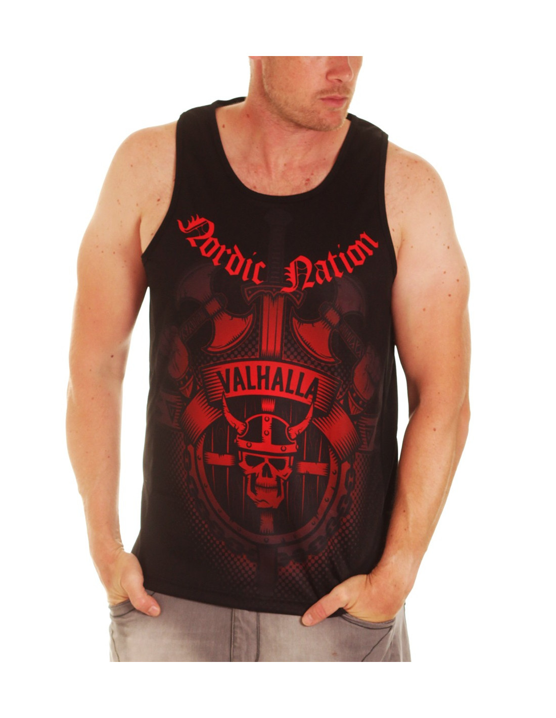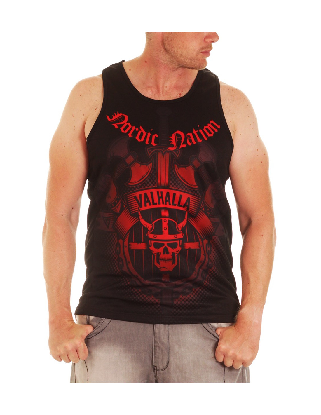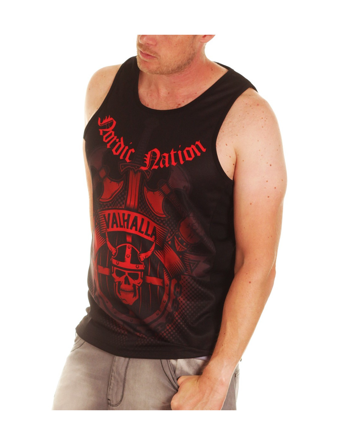 Valhalla Tanktoppen fra Nordic Worlds har et stærkt brystdesign, inspireret af Nordisk Mytologi. Vikingebrandet Nordic Worlds er et tøjmærke, som rykker den maskuline urkraft fra vikingetiden ind i moderne trendy designs. Valhalla Tanktoppen er maskulin, stærk og sporty. T-Shirten er fremstillet i et luftigt mesh sportswear materiale.
