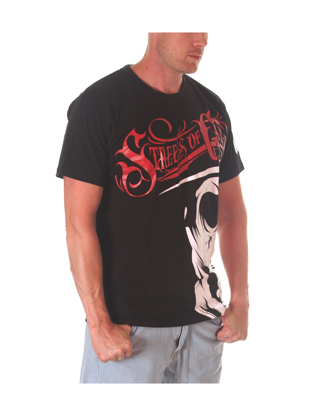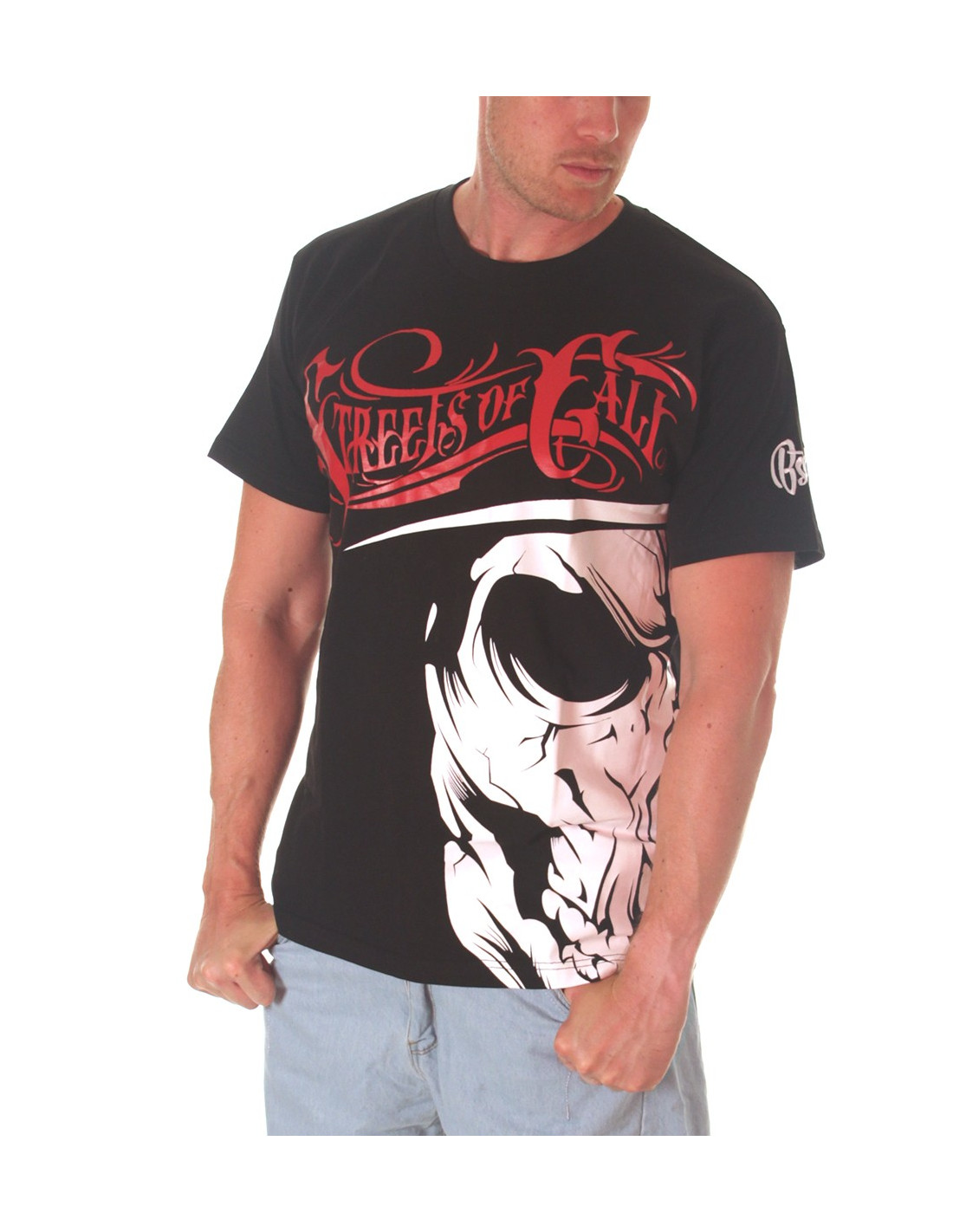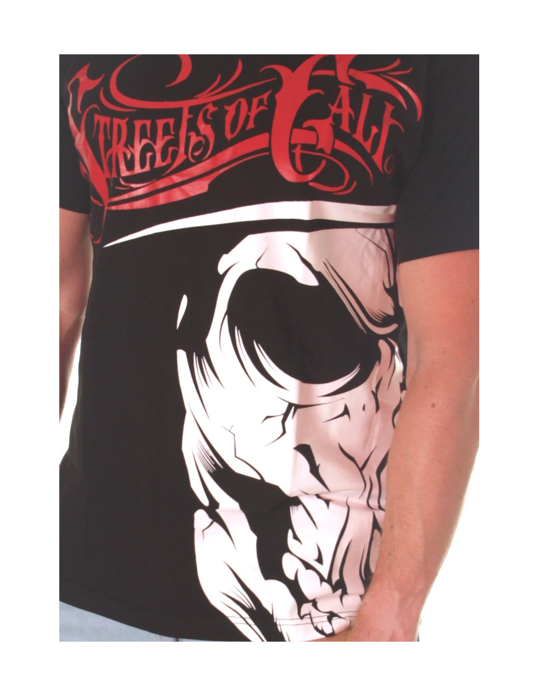 BSAT lancerer Streets of Cali Skull T-Shirten. Brandets nye Streets of Cali er skrevet i kunstnerisk rød skrift oven over brandets hvide signature Skull. Resultatet er et outstanding design. Brandlogoet er broderet i hvidt på venstre ærme. T-Shirten er i bomuld, pasformen er regular fit. BSAT er RudeCru's Urban Art og HipHop RebelFashion brand, inspireret af StreetArt, TattooArt og musikscenen.