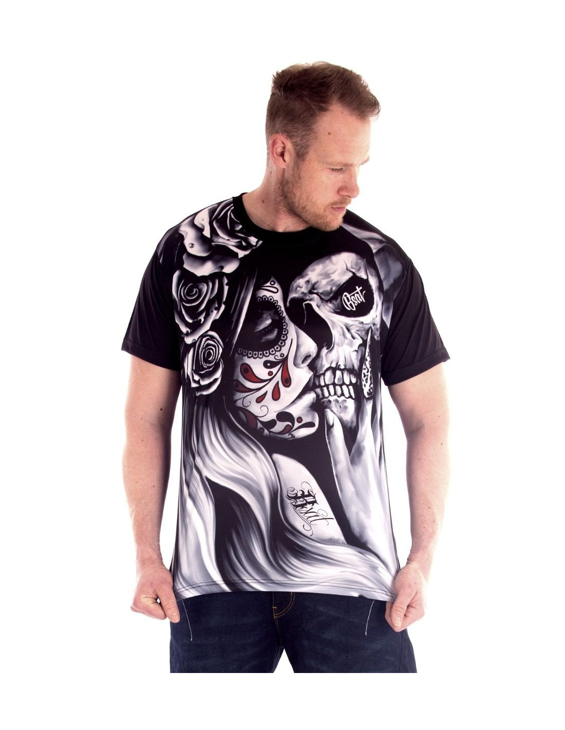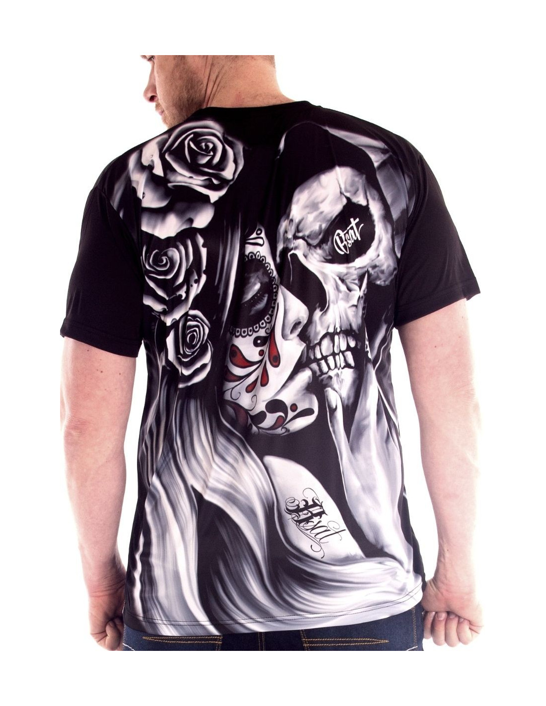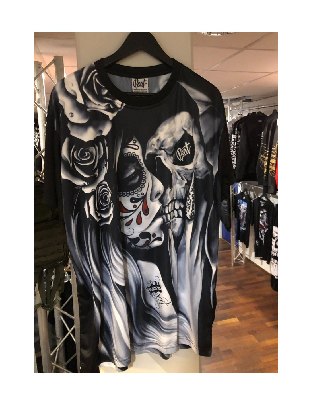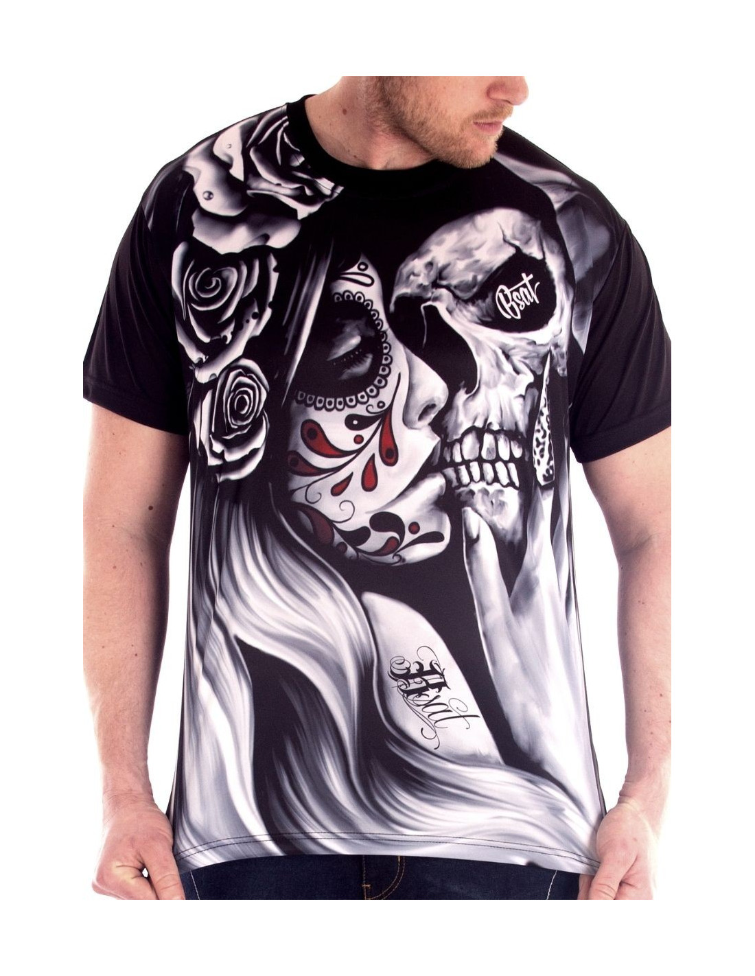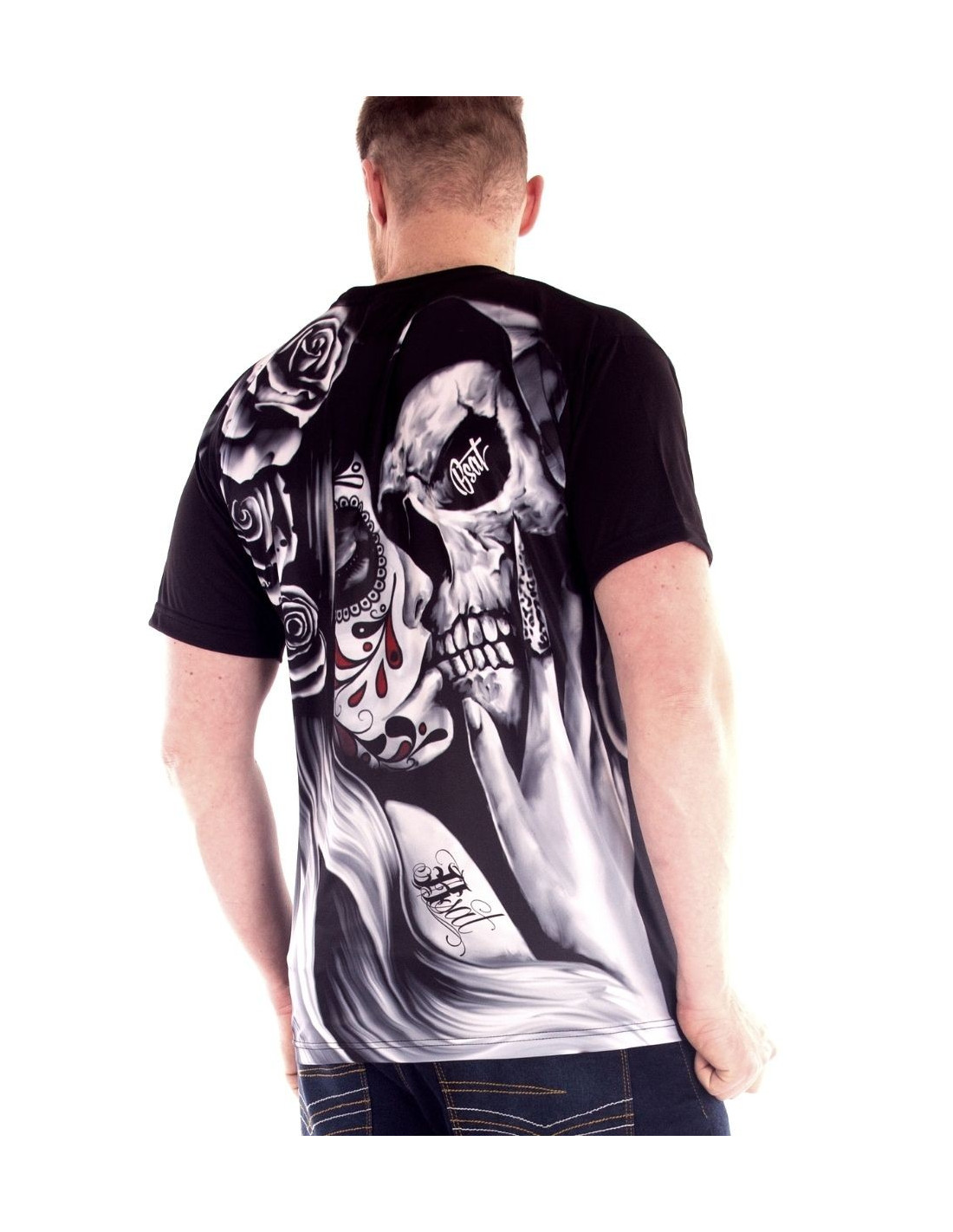 Super flot ny T-Shirt fra BSAT's LA ONDA linje. Dødens kys fra en smuk Chica. Chicaer, med skelet ornamenter og Skulls er populære symboler for Dødens Dag, en populær Festival fra Mexiko. Så småt har folk rundt i verden taget fejringen af De dødes dag til sig. I BSAT er skull designs og Chica designs en del af Brandets DNA. Artworket fylder hele forsiden og bagsiden og T-Shirten er produceret i et let og luftigt polyester materiale. Pasform: regular fit.