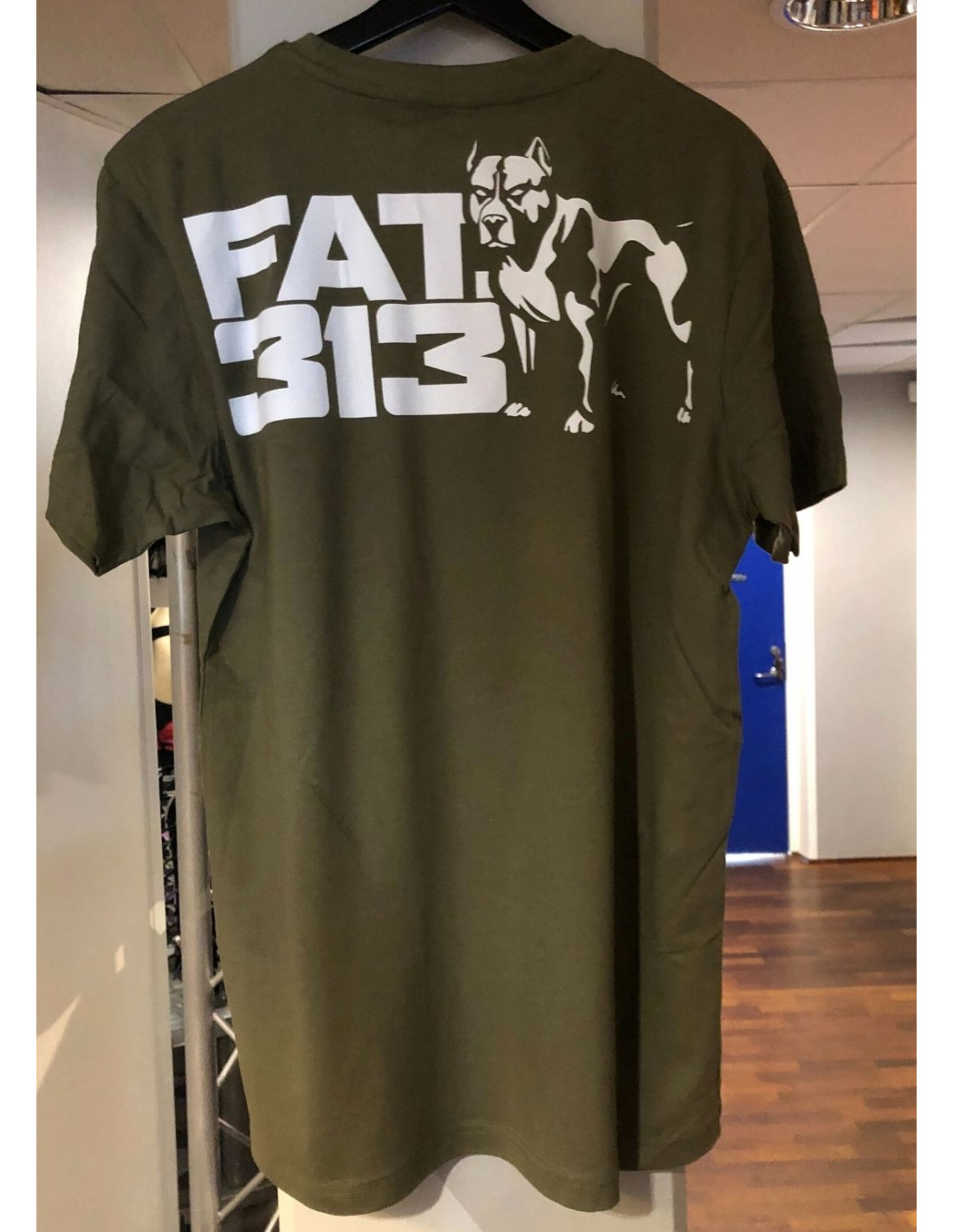 Lækker olivengrøn bomulds T-Shirt fra premium Fashion Brandet FAT313. Henover ryggen er brandlogoet og brandets flotte muskuløse hund printet i hvidt. En oplagt T-Shirt til mænd, der er dedikeret til FAT313. FAT313 er et enestående premium Brand med sit helt eget udtryk: FAT313 spænder fra designs med sværvægtstunge brandlogo broderier over afdæmpede hundebrand patches til store broderede FAT313 hunde. Tilfælles for alle designs er, at FAT313 har meget god stil og høj klasse.